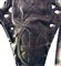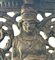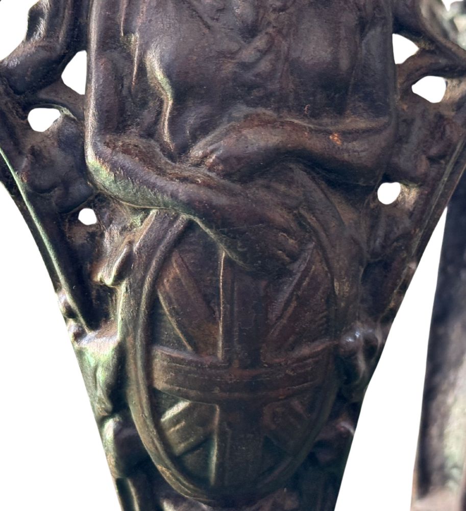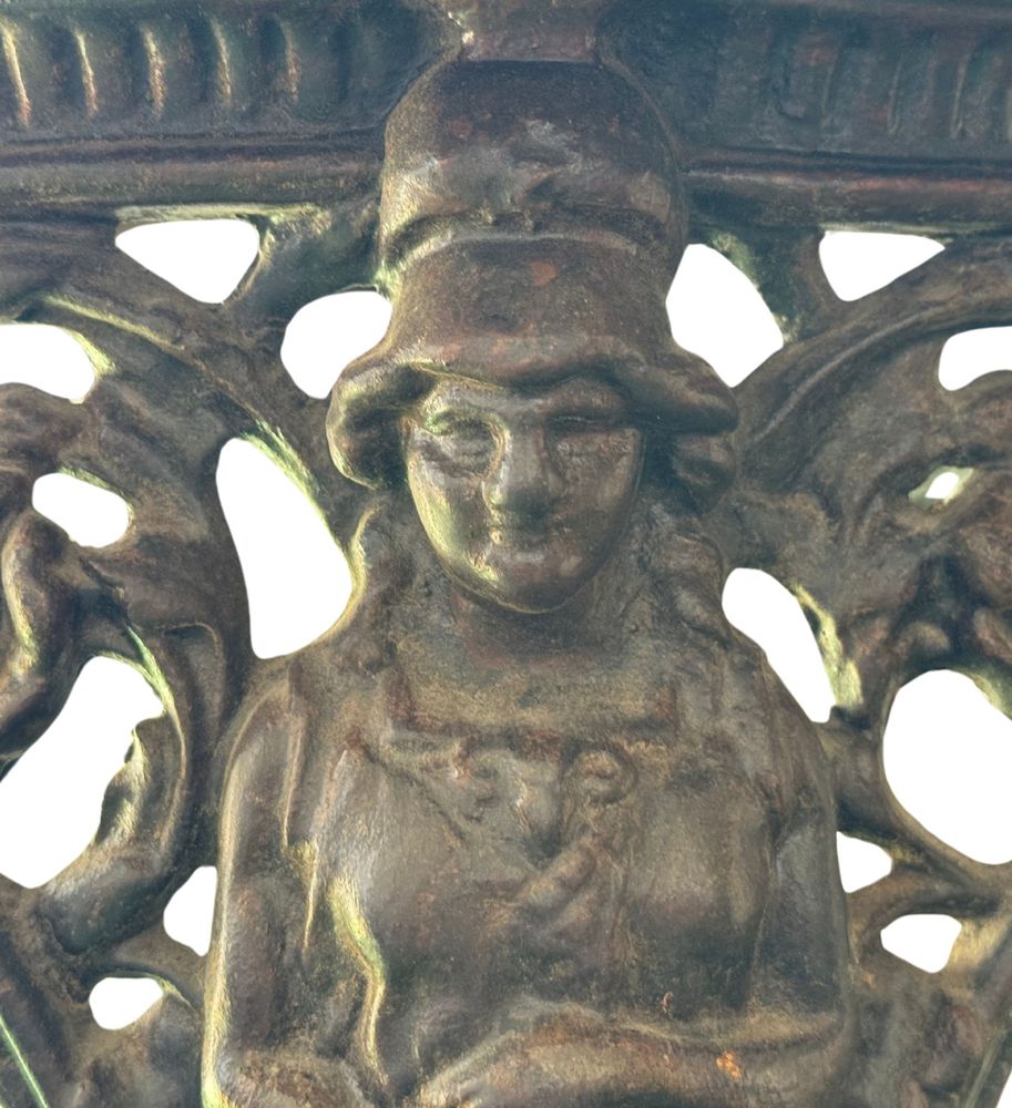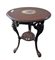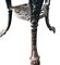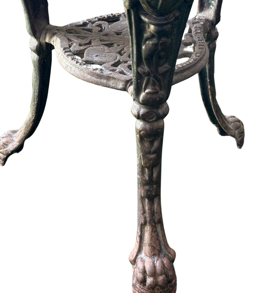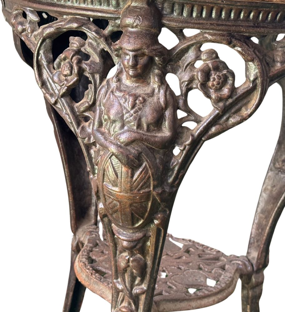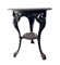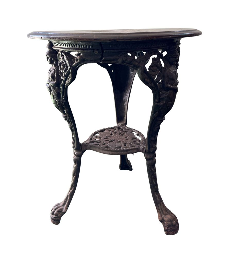 Tavolino di forma tonda in ghisa con piano in legno decorato, periodo XIX/XX...
