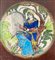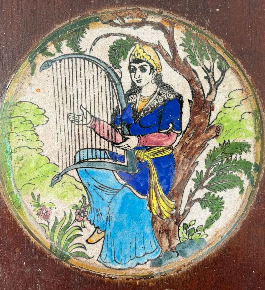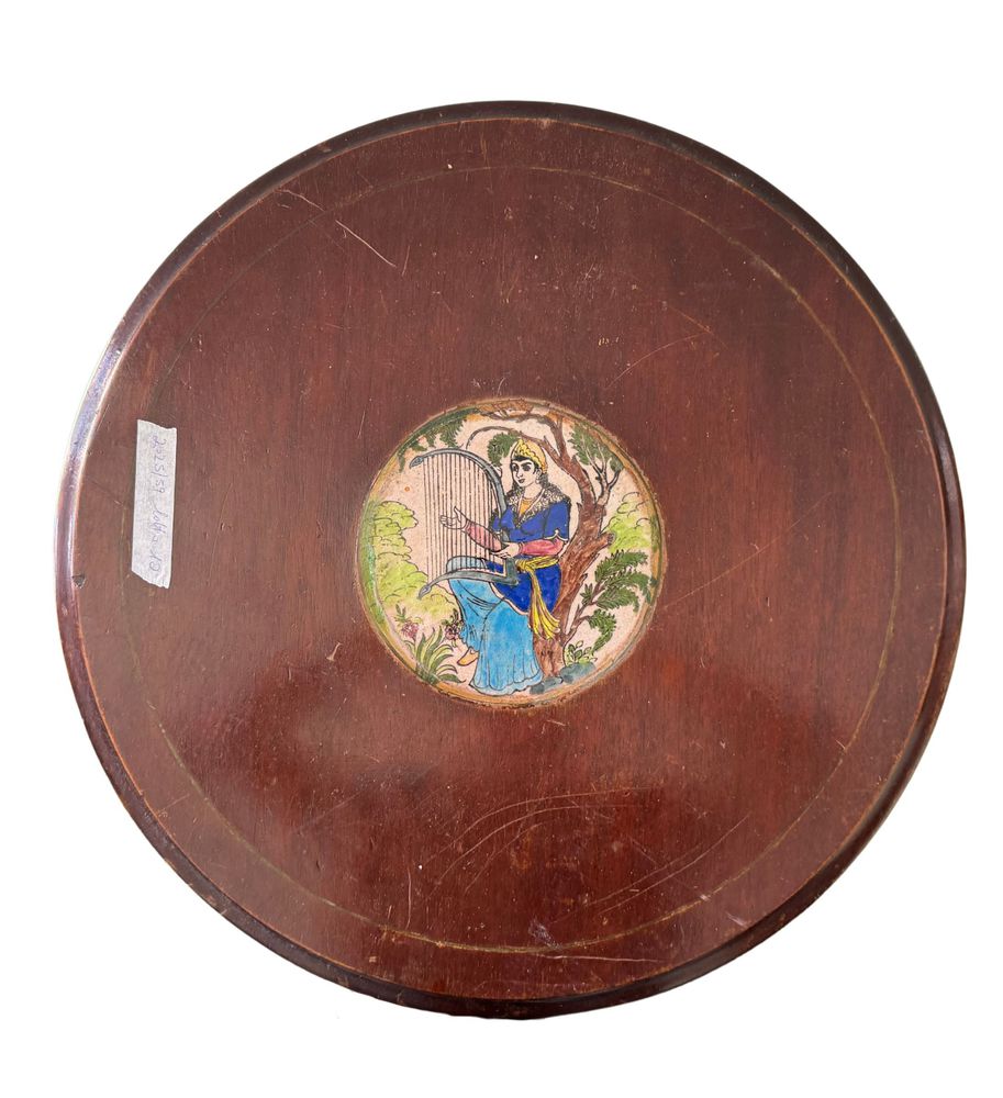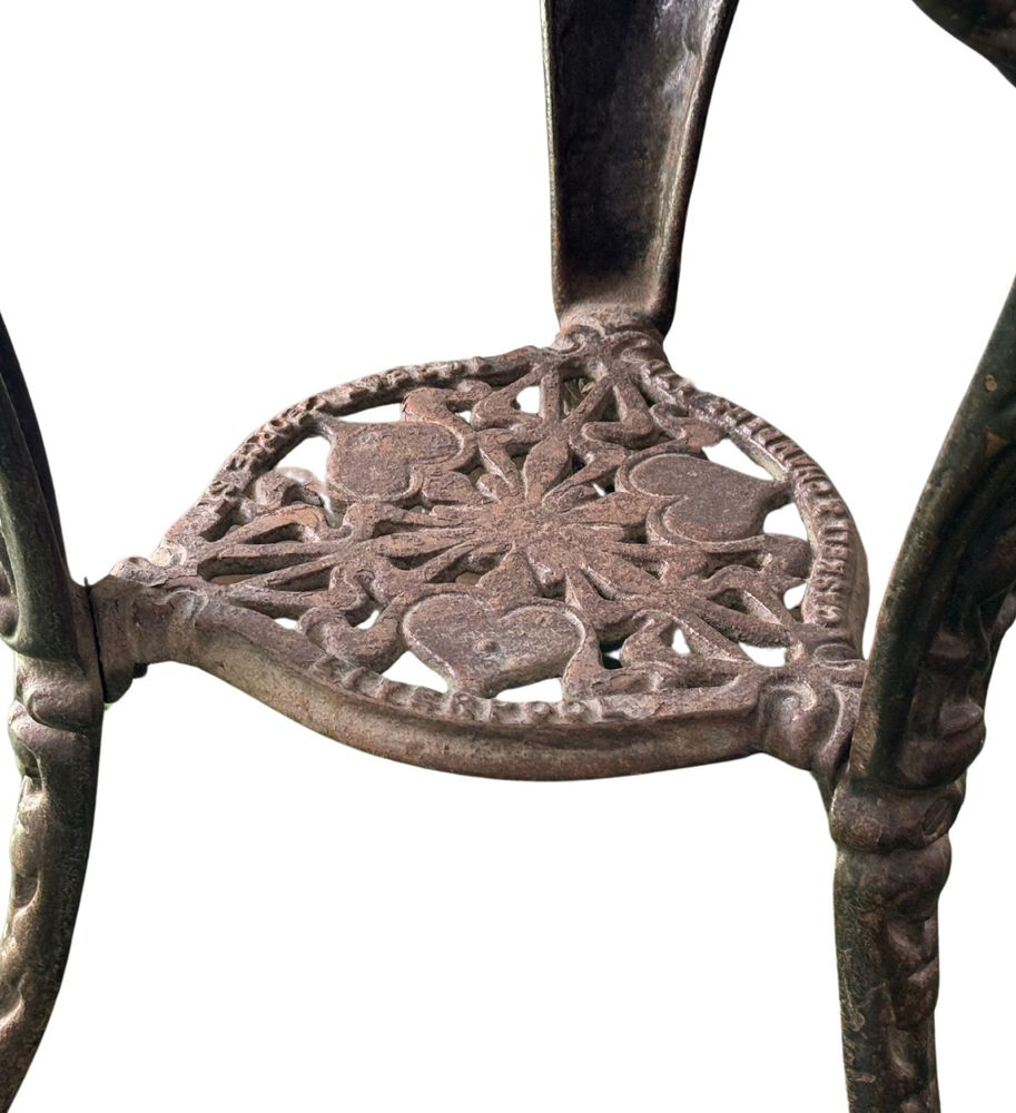 Tavolino di forma tonda in ghisa con piano in legno decorato, periodo XIX/XX secolo. Dimensioni: h72x60 cm. In buone condizioni con lievi segni di vissuto come da foto allegate.