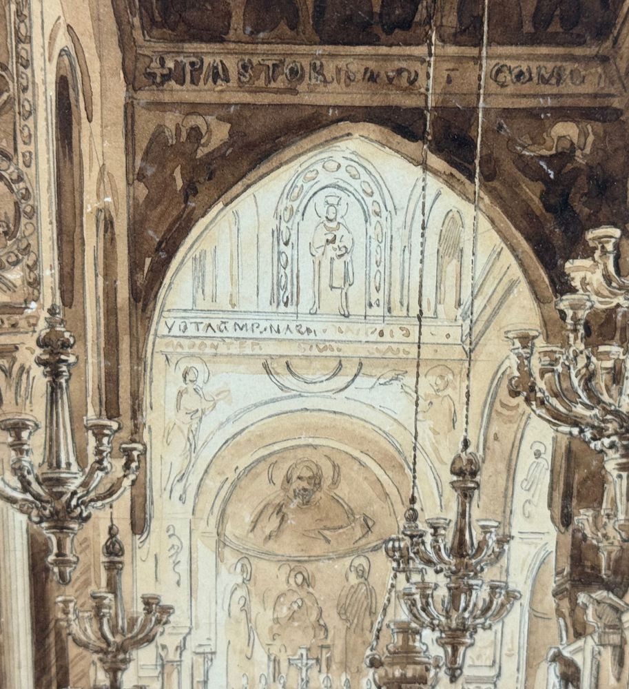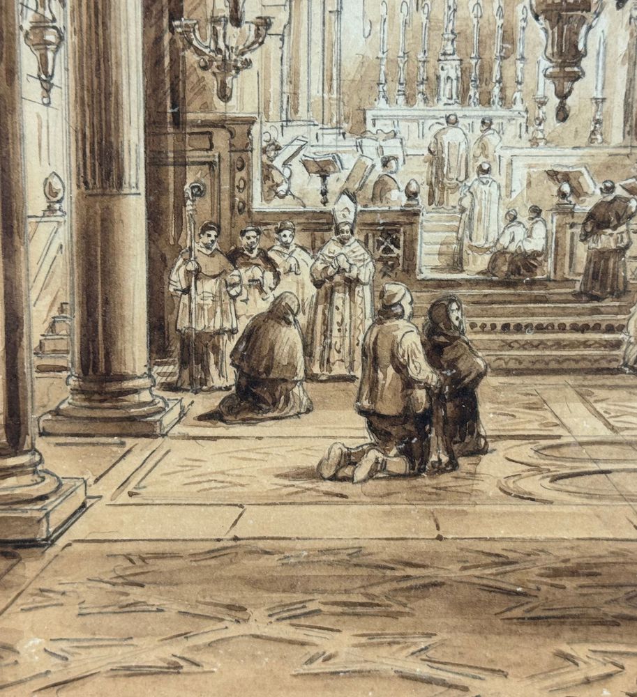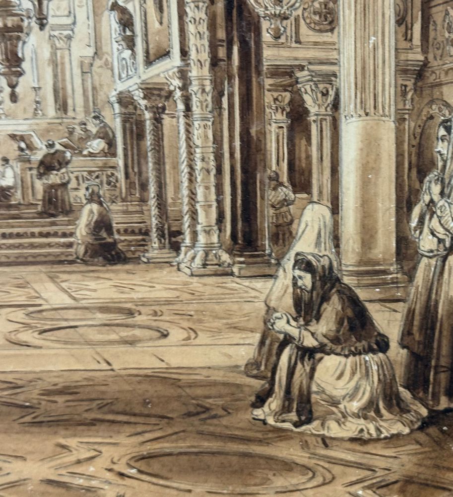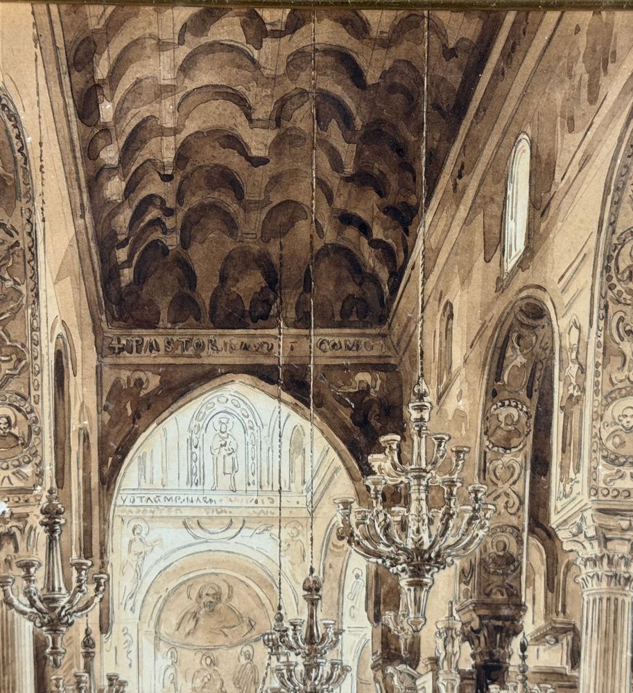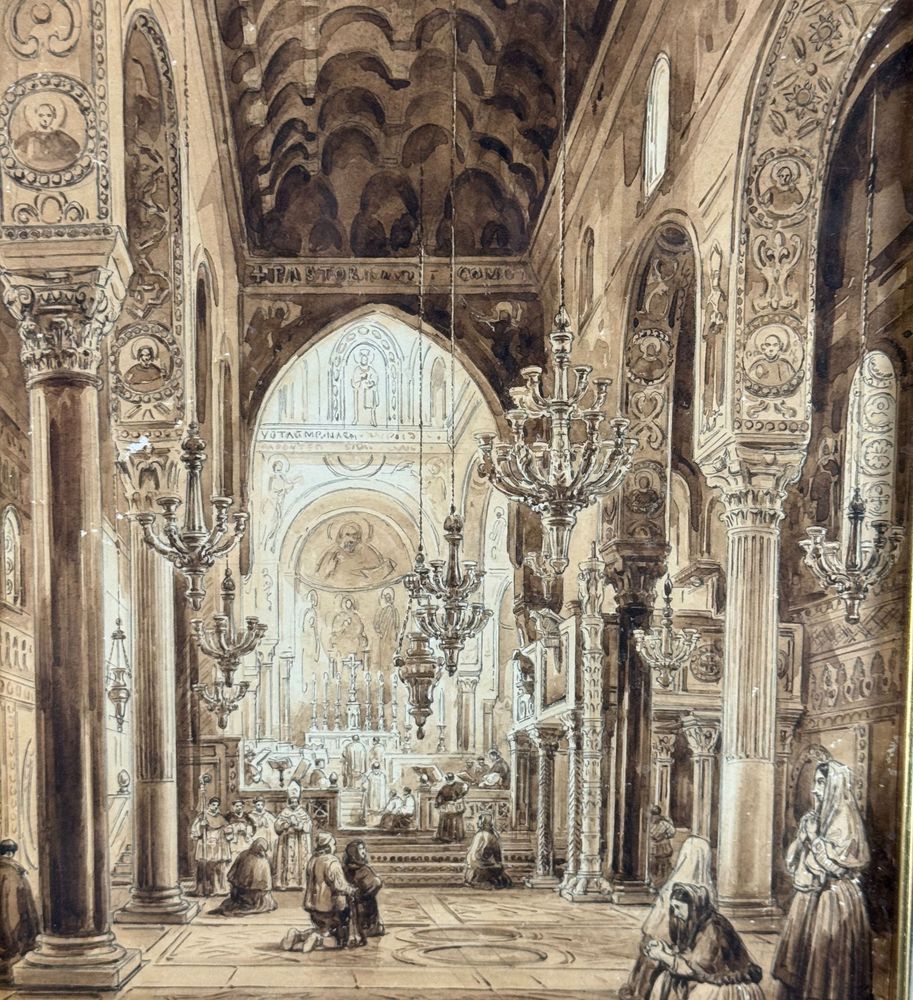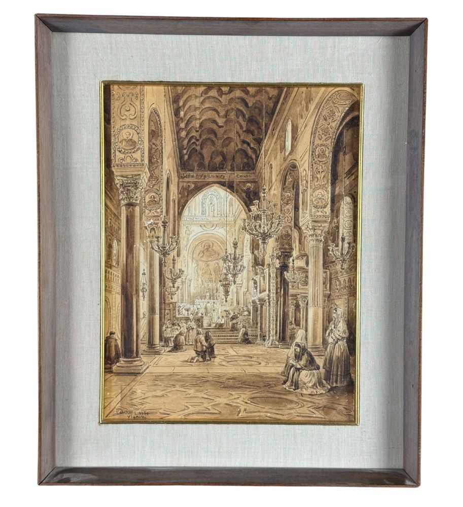 Dipinto acquerello tono su tono, periodo XIX secolo scuola italiana raffigurante Interno di chiesa. Dimensioni compreso cornice: 36,5x44,5 cm. Dimensioni interno cornice: 25x33 cm. Reca firma in basso a sinistra Vianelli 1850. Opera in buone condizioni.