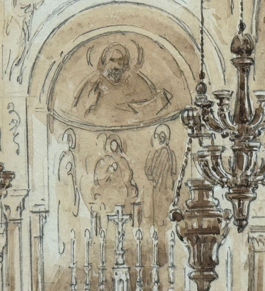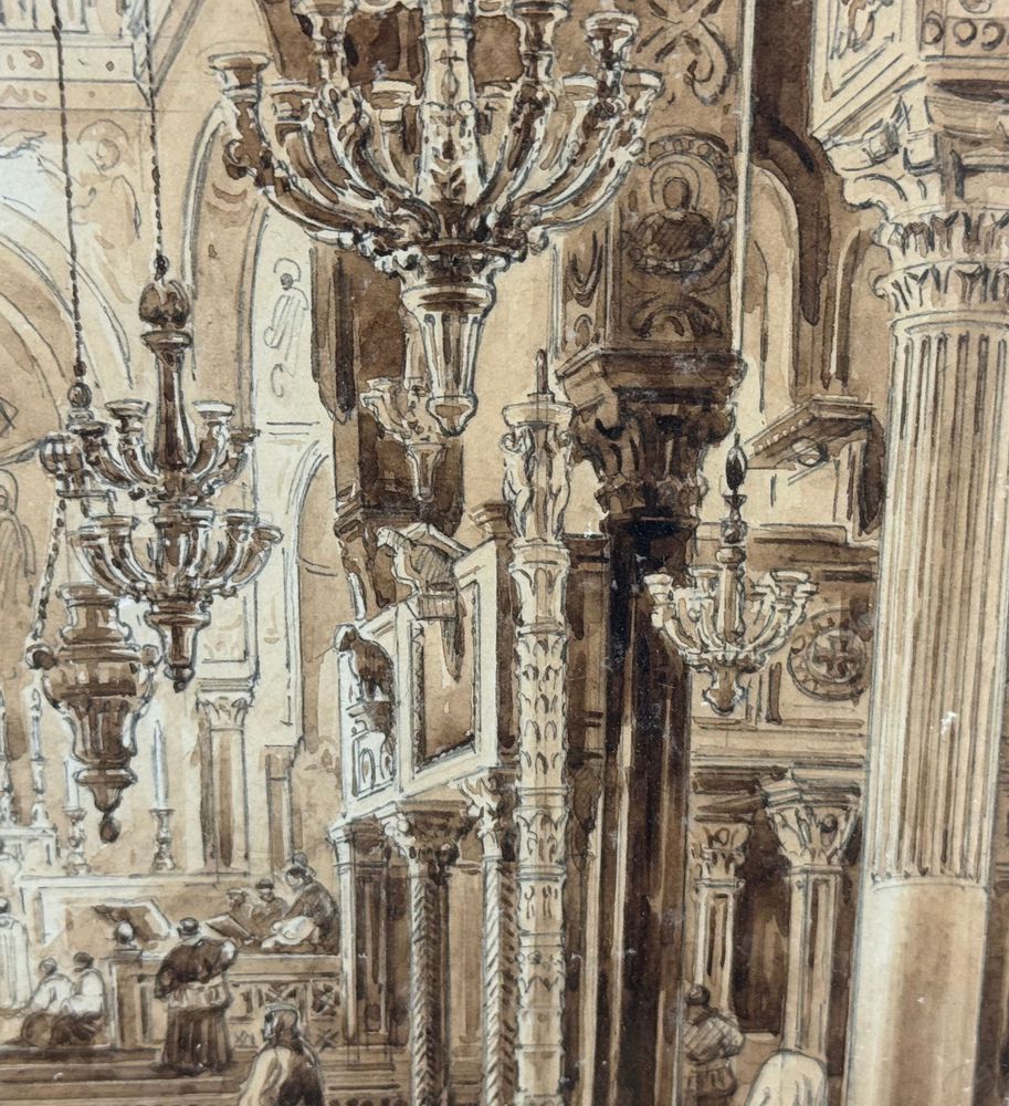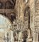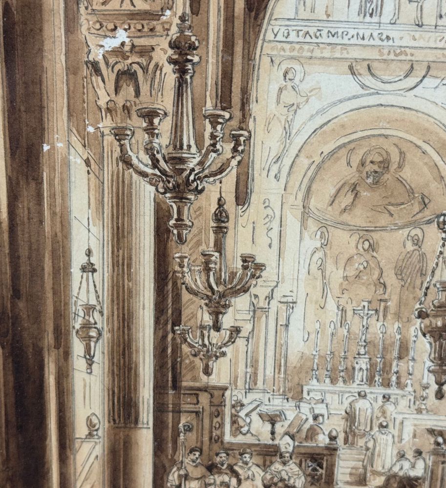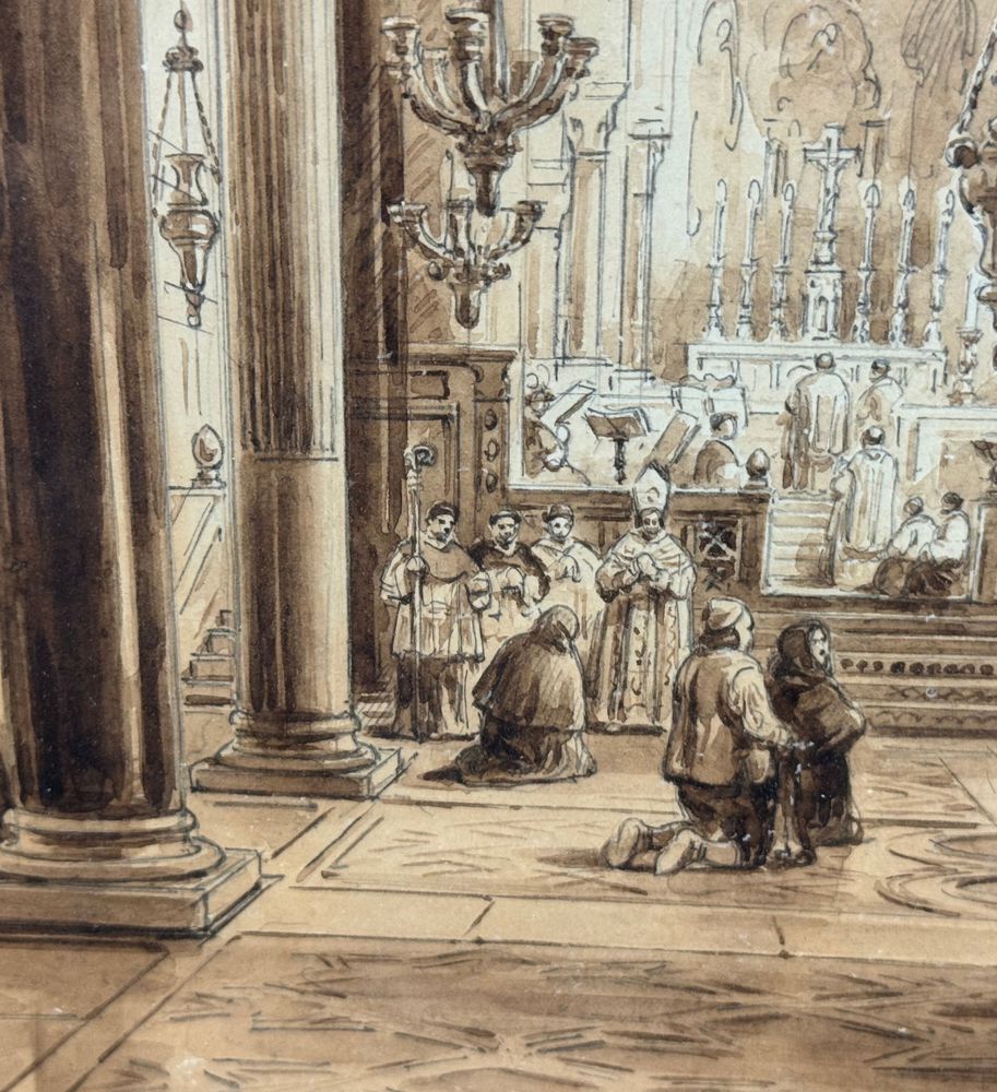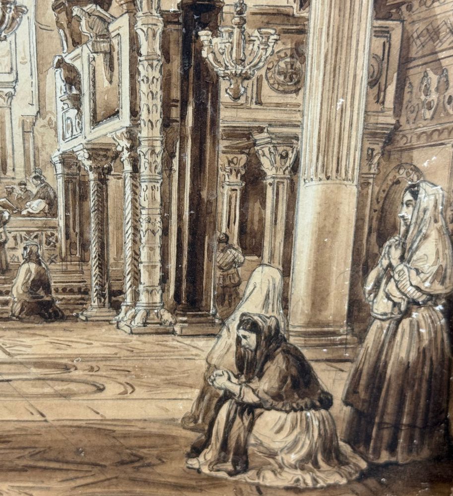 Dipinto acquerello tono su tono, periodo XIX secolo scuola italiana raffigurante Interno di chiesa. Dimensioni compreso cornice: 36,5x44,5 cm. Dimensioni interno cornice: 25x33 cm. Reca firma in basso a sinistra Vianelli 1850. Opera in buone condizioni.