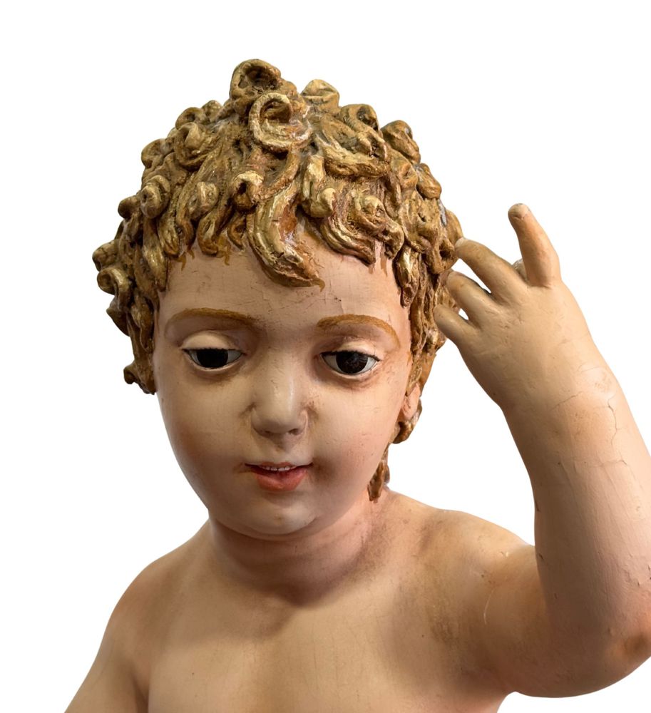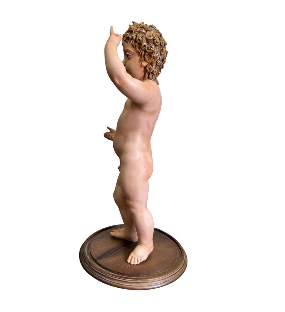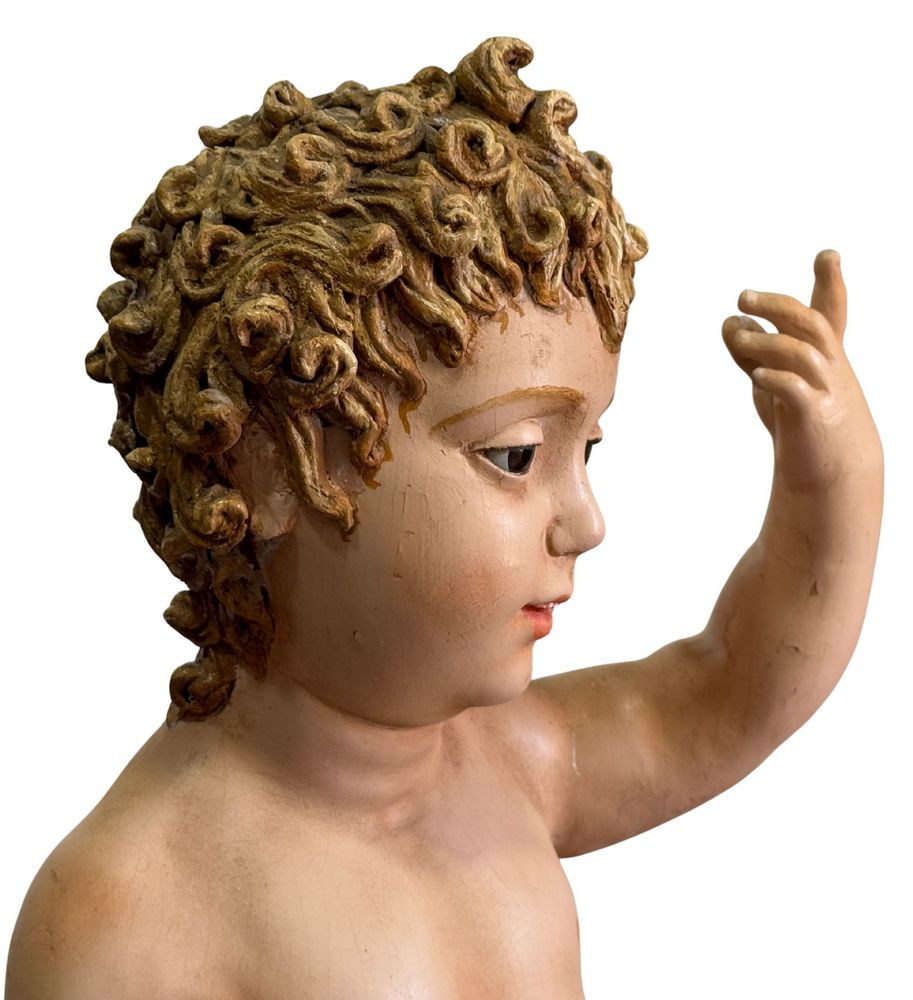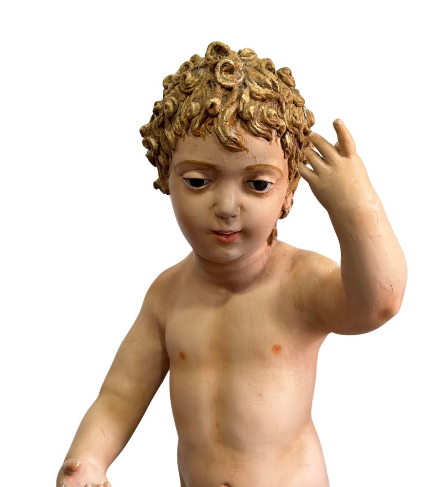 Scultura in legno policromo, periodo XIX secolo, raffigurante Bambinello. Dimensioni: H69x24x20 cm. Piccola mancanza nella mano destra e lievi segni di vissuto come da foto allegate.