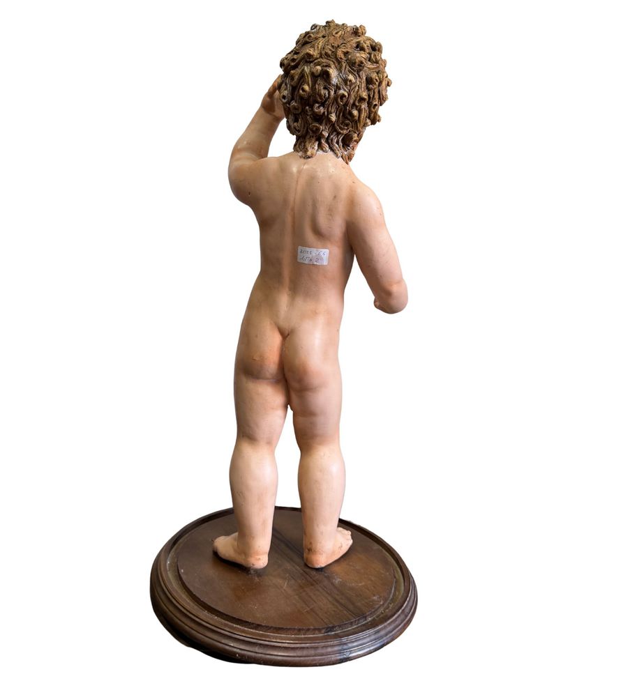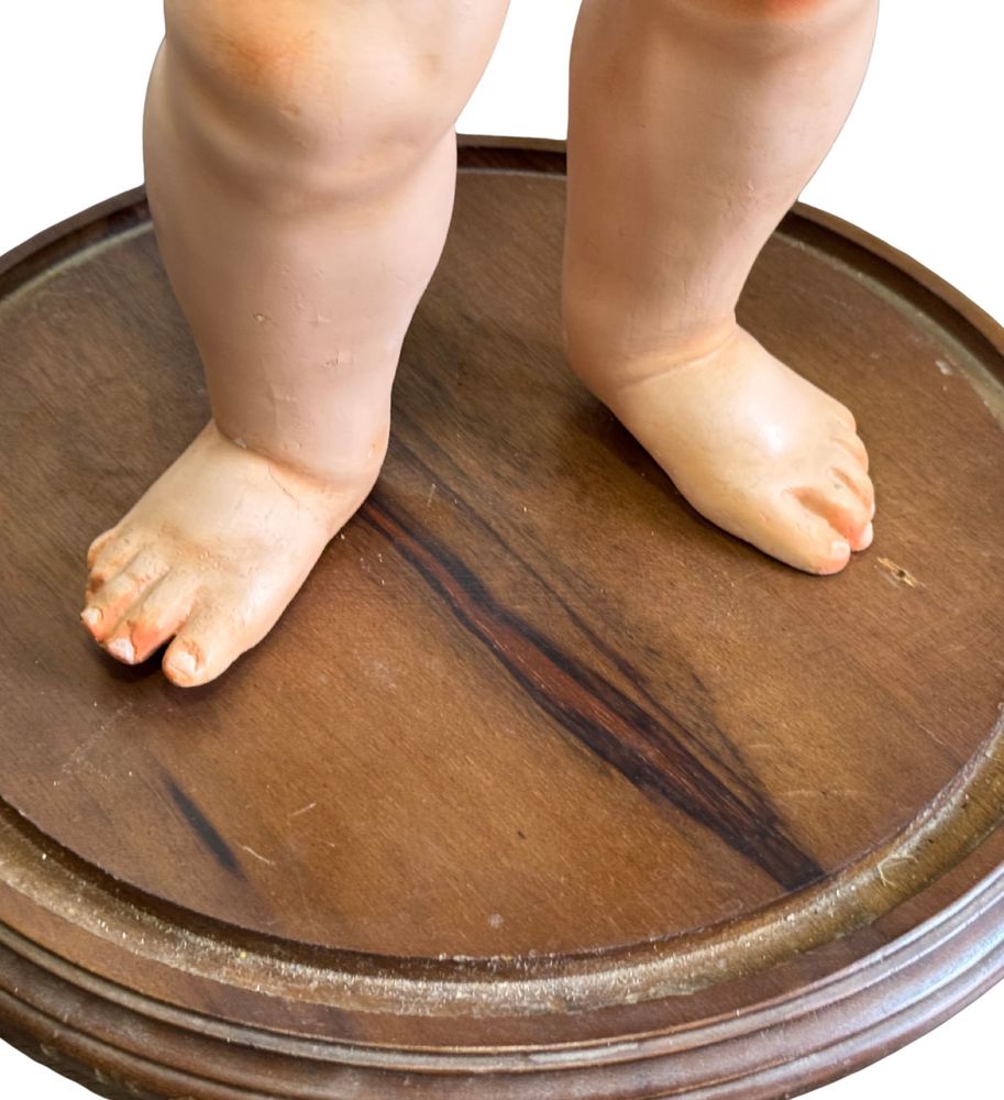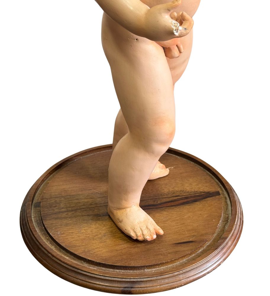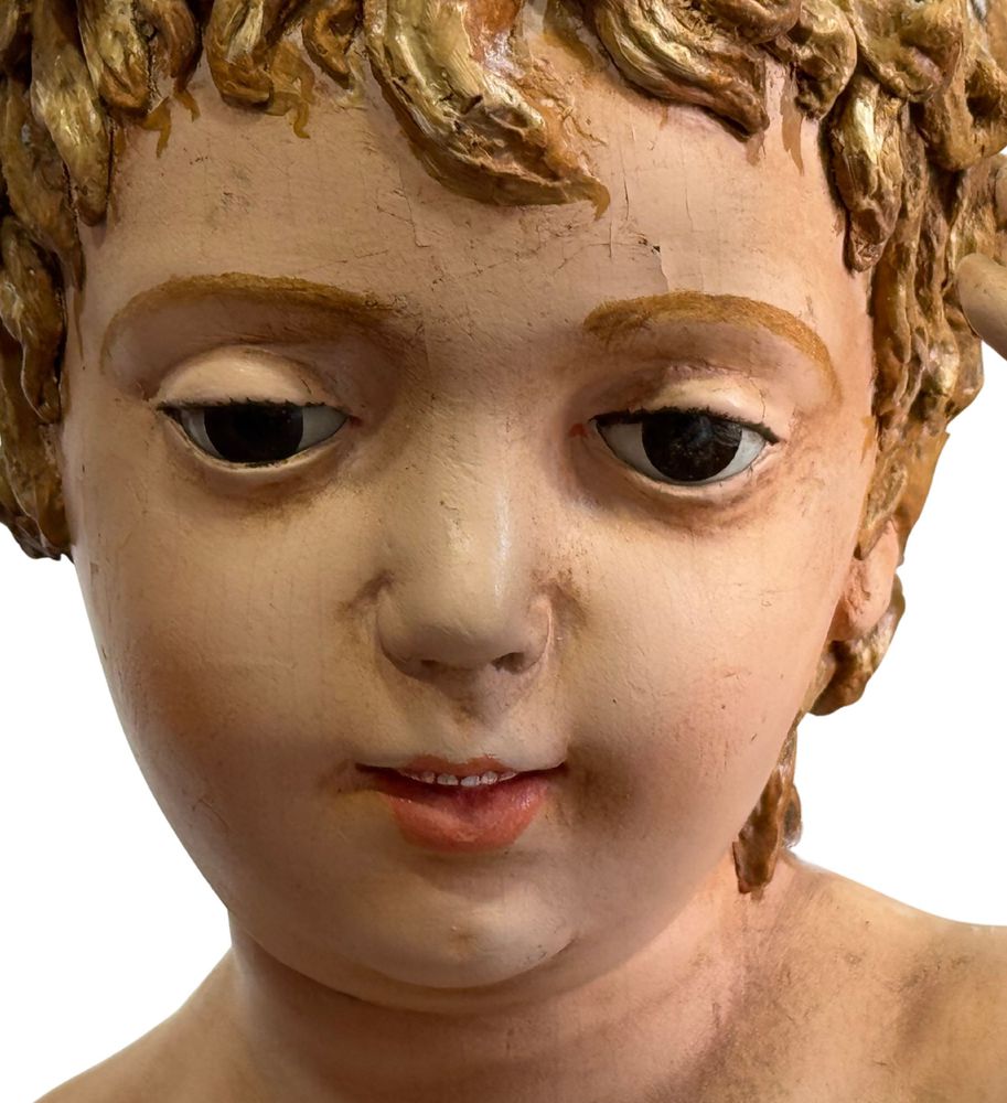 Scultura in legno policromo, periodo XIX secolo, raffigurante Bambinello. Dimensioni: H69x24x20 cm. Piccola mancanza nella mano destra e lievi segni di vissuto come da foto allegate.