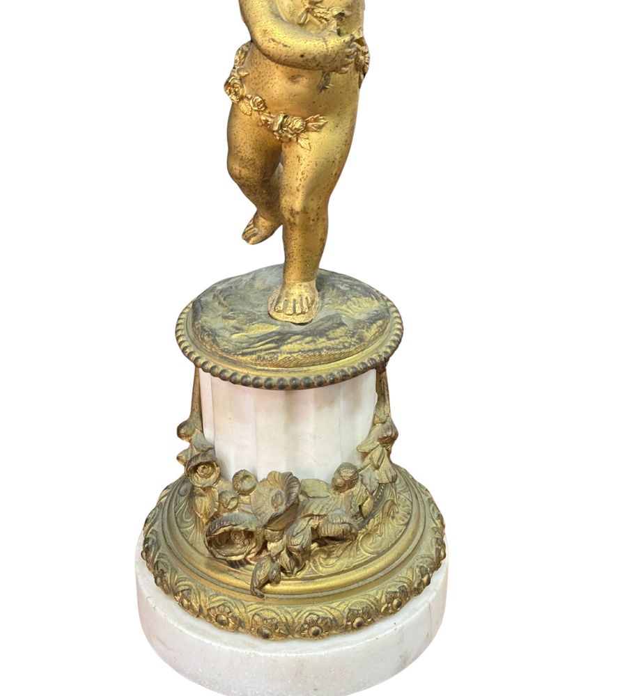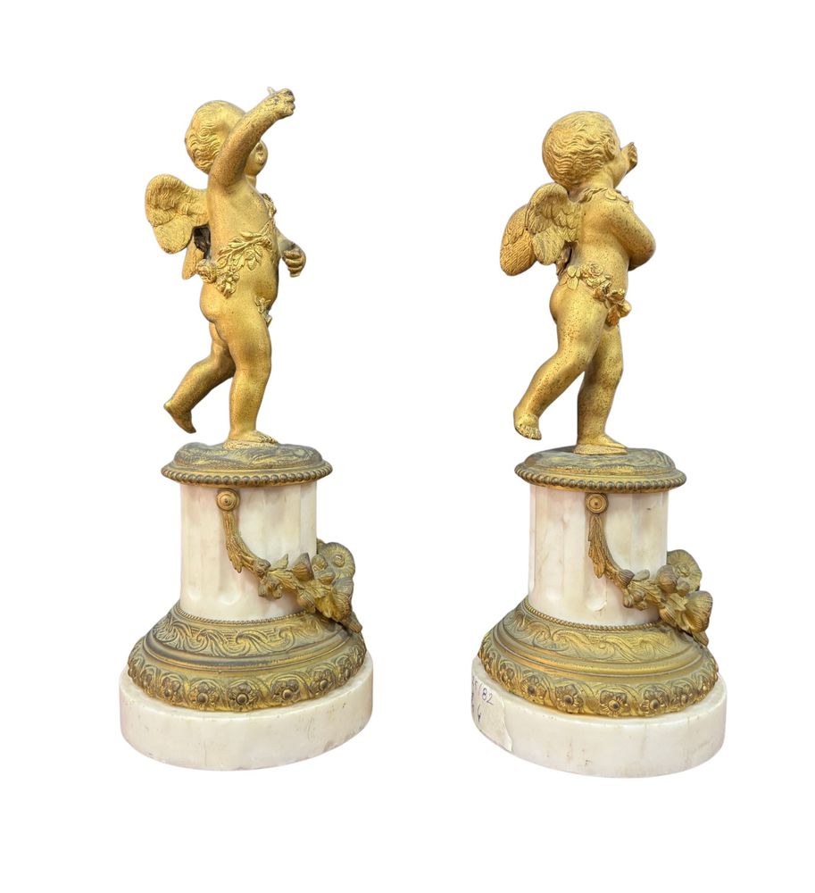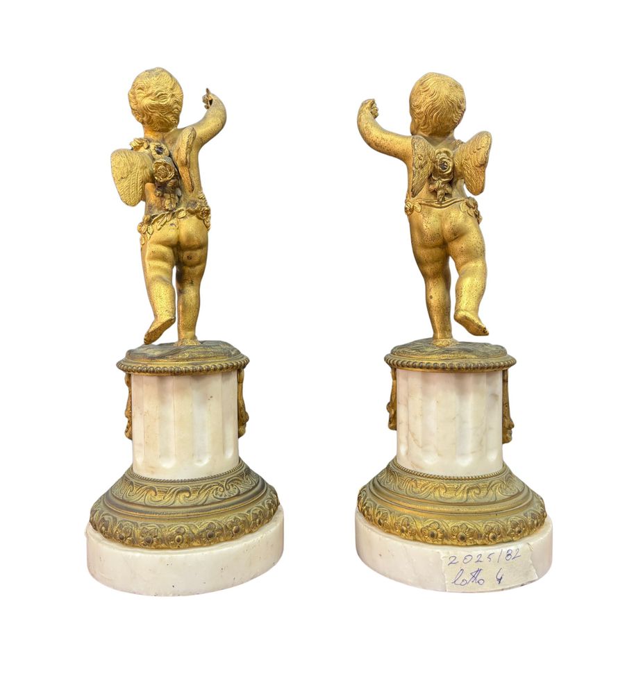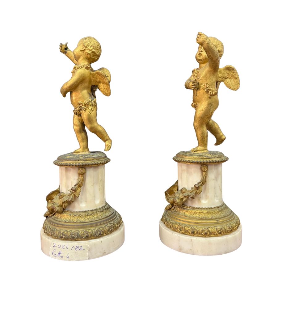 Coppia di bronzi dorati su base in marmo, periodo XIX secolo raffigurante Puttini. Dimensioni: 33x13 cm. In buone condizioni con lievi segni di vissuto come da foto allegate.