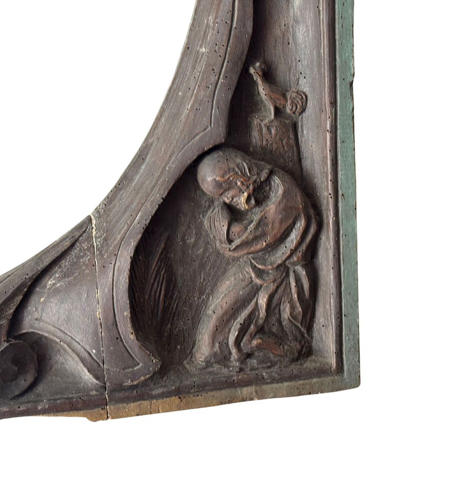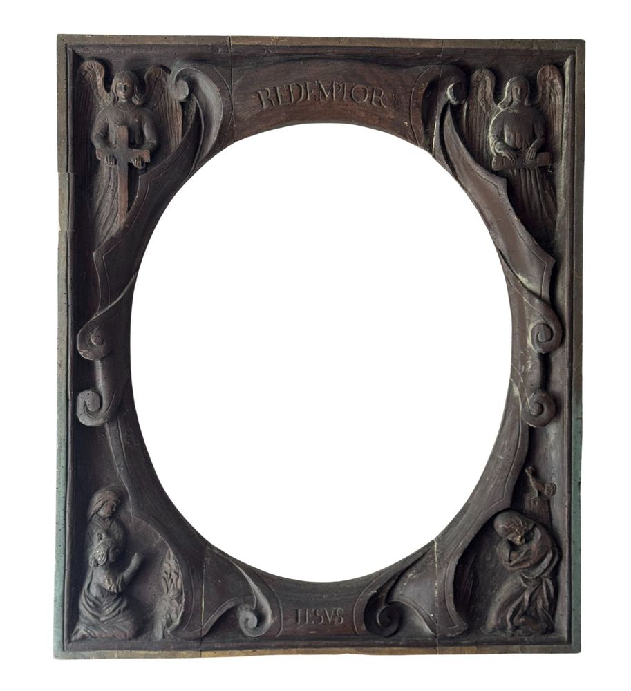 Cornice in legno intagliata con figure religiose, interno di forma ovale....