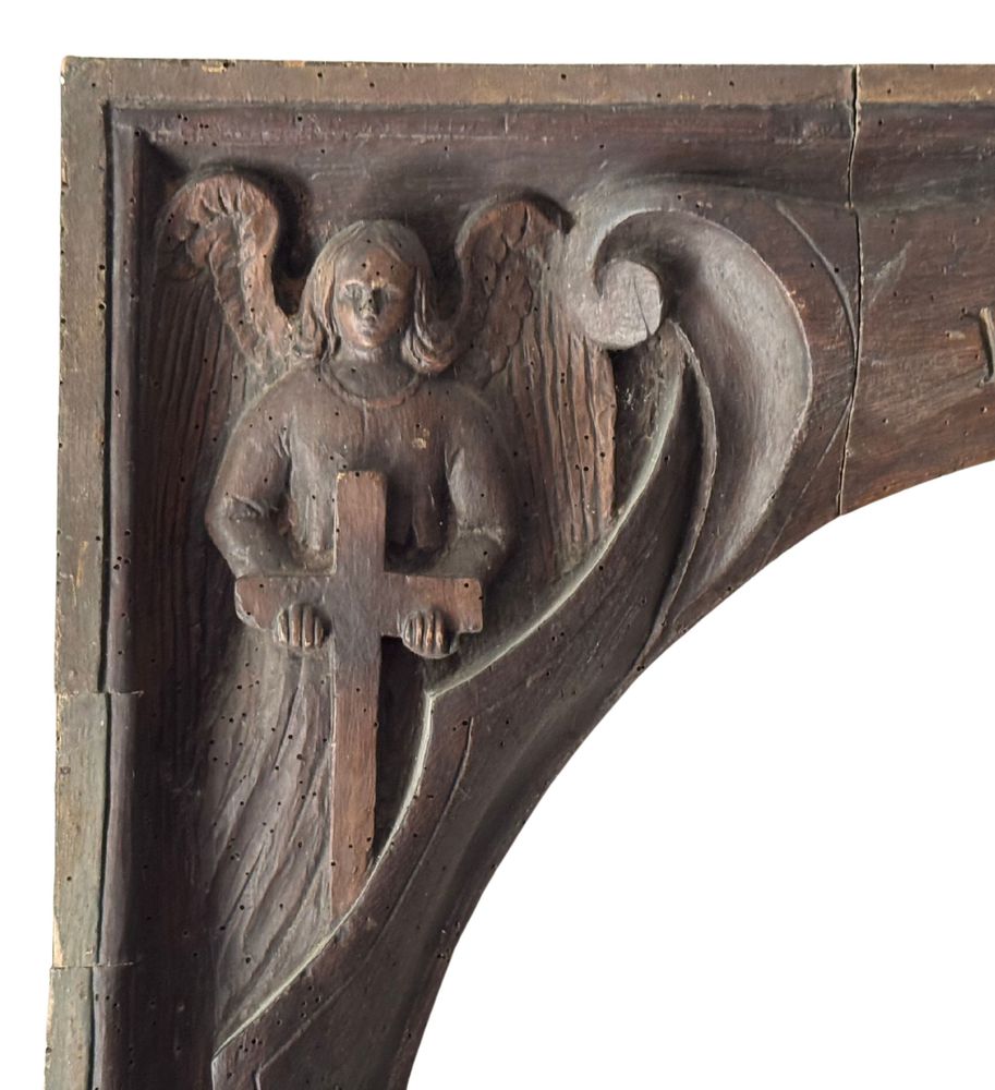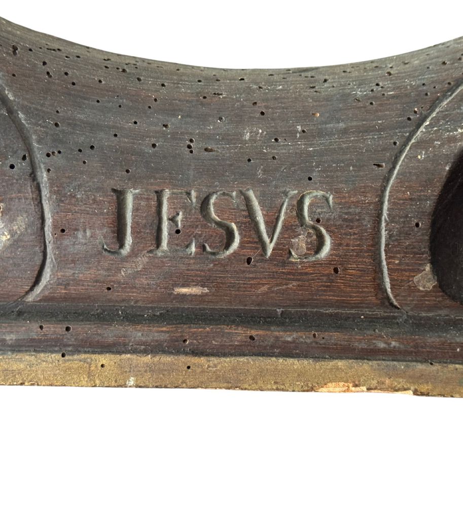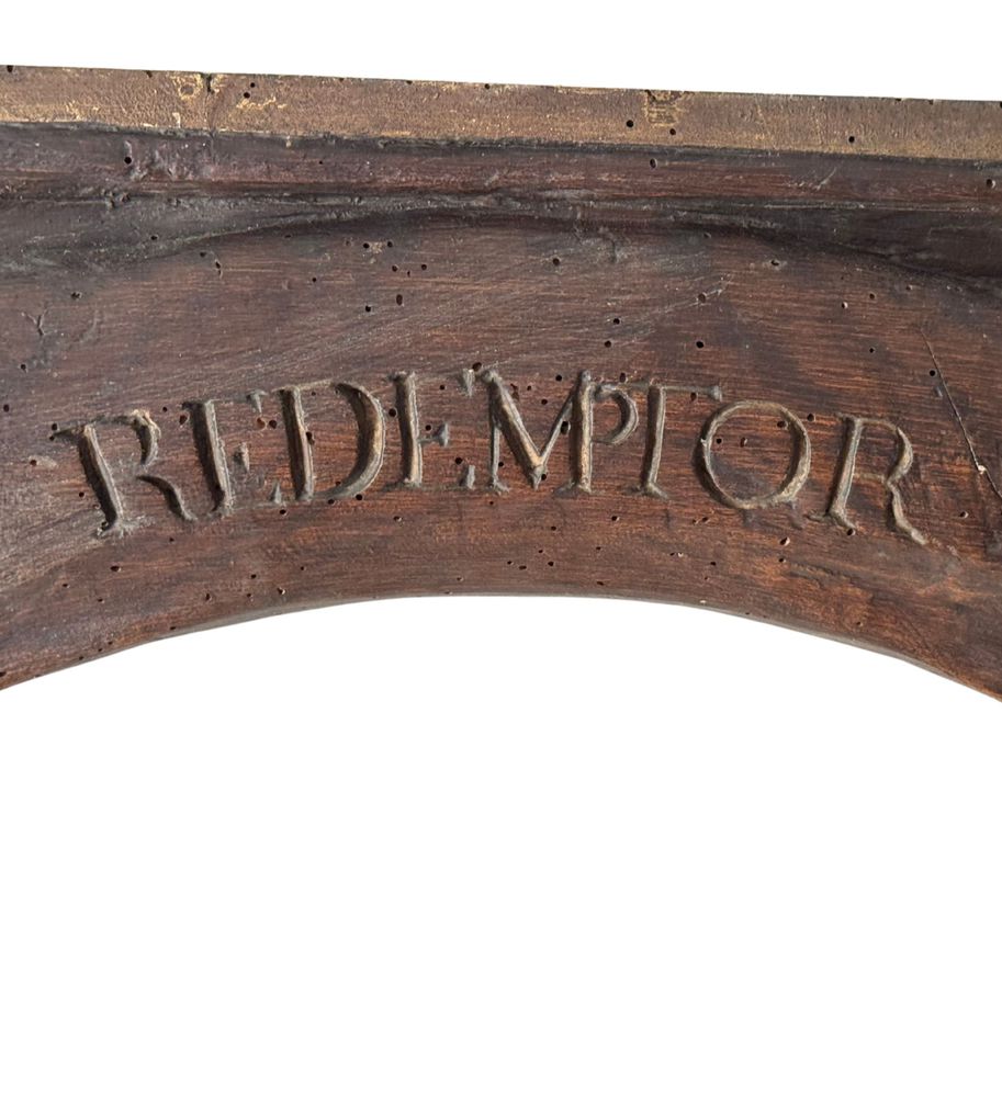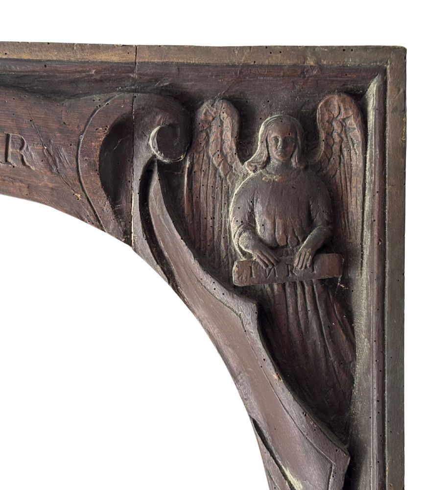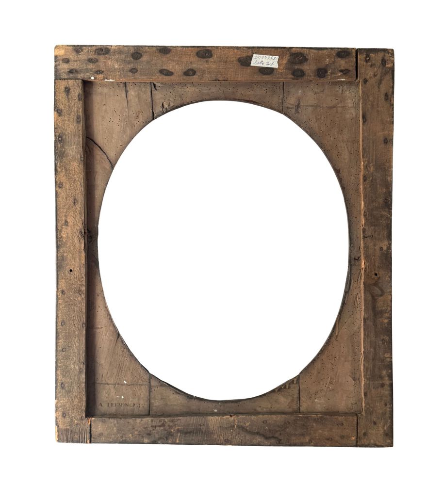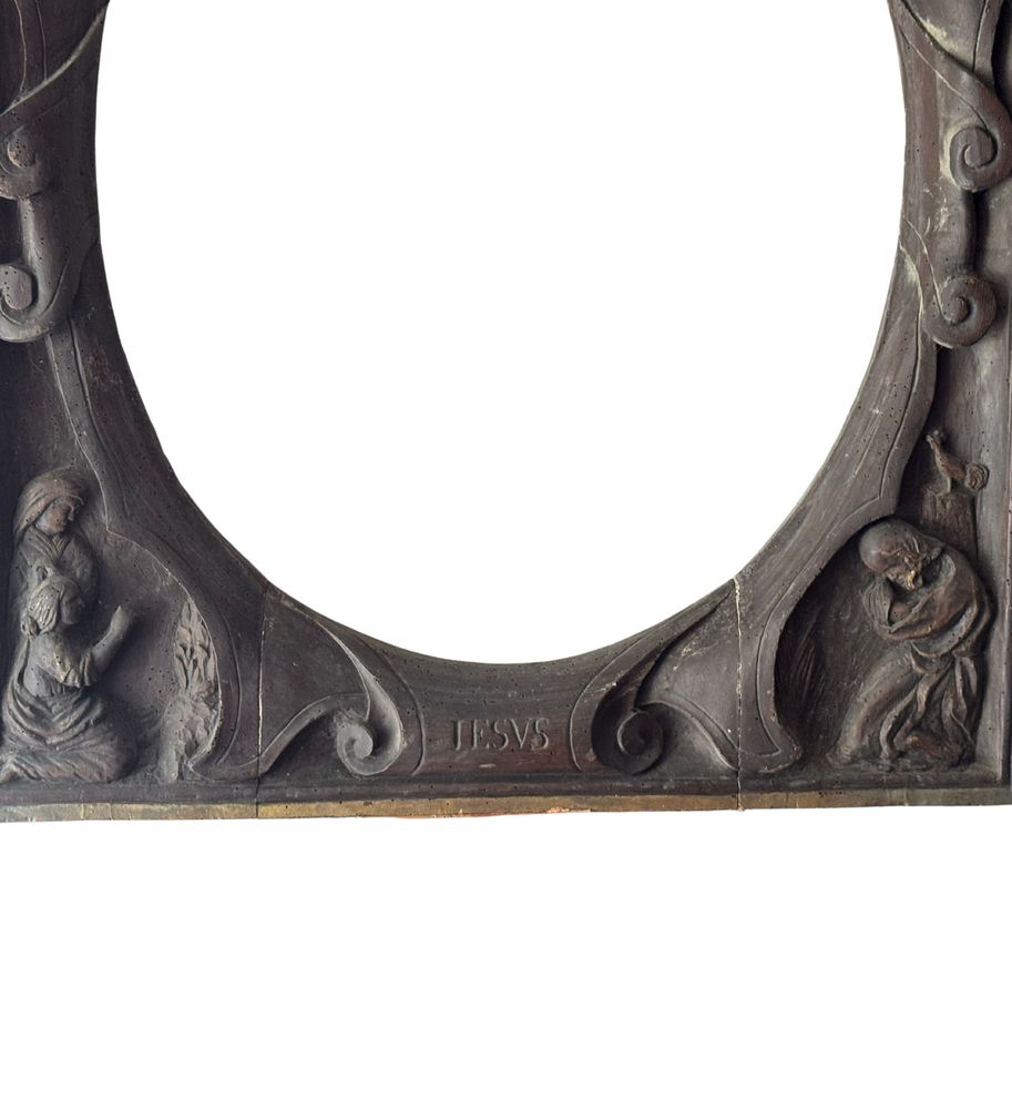Cornice in legno intagliata con figure religiose, interno di forma ovale. Dimensioni: 74x88 cm. In buone condizioni con lievi segni di vissuto come da foto allegate.