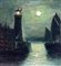 Dipinto olio su tela, periodo XIX secolo scuola italiana raffigurante Scena notturna con un faro illuminato, una luna piena che si riflette sull'acqua, due imbarcazioni con un'atmosfera suggestiva e serena sulla superfice del mare. Dimensioni compreso cornice: 55x45 cm. Dimensioni interno cornice: 36x26 cm. Opera probabilmente dell'artista Walter Meegan. Opera in buone condizioni con lievi segni di vissuto come da foto allegate. Da segnalare un atico rintelo e una caduta di colore nella parte in basso a destra, adiacente alla firma.