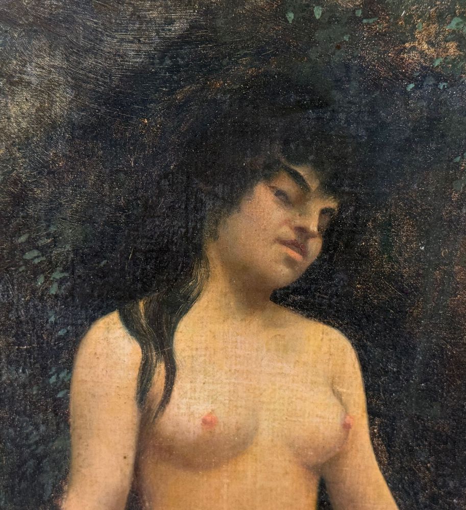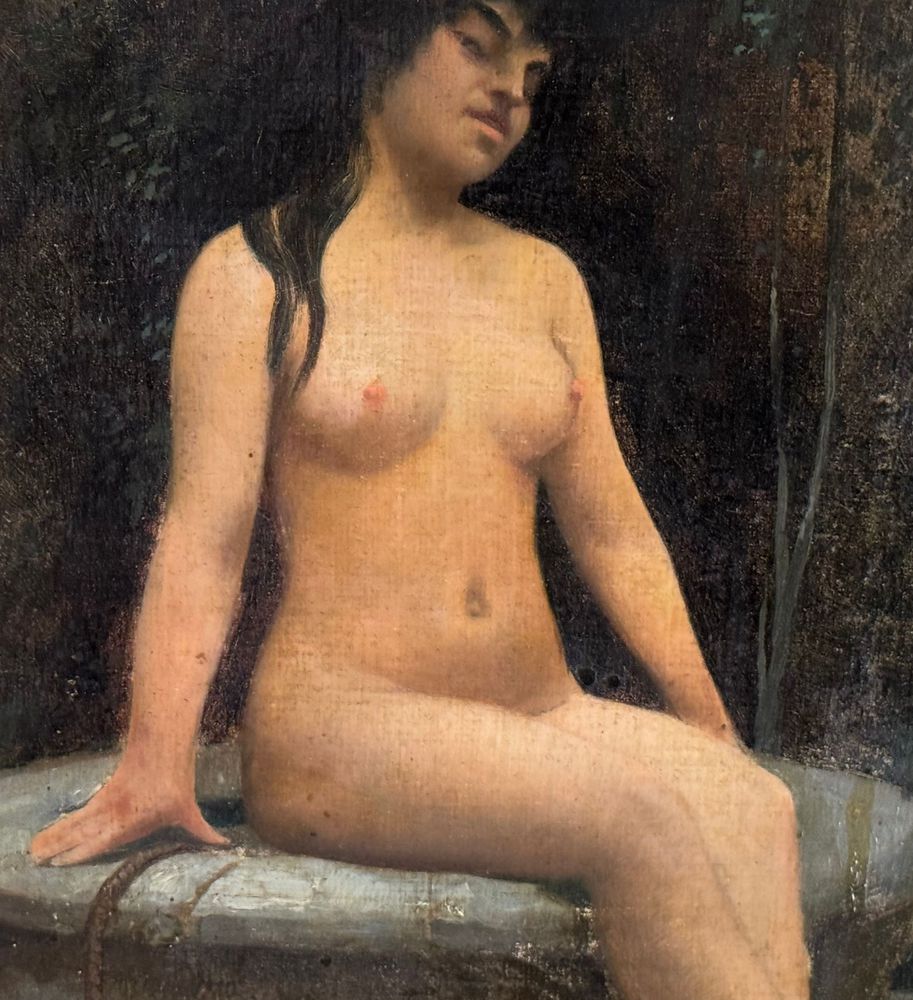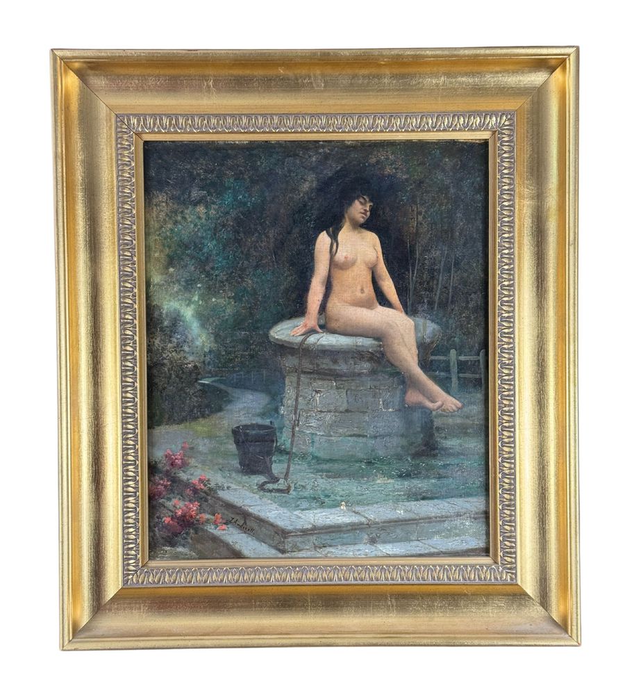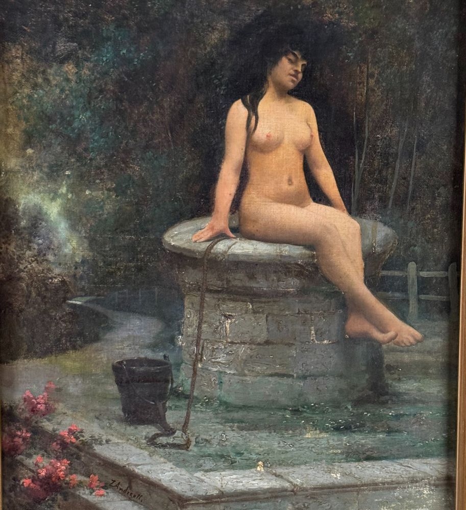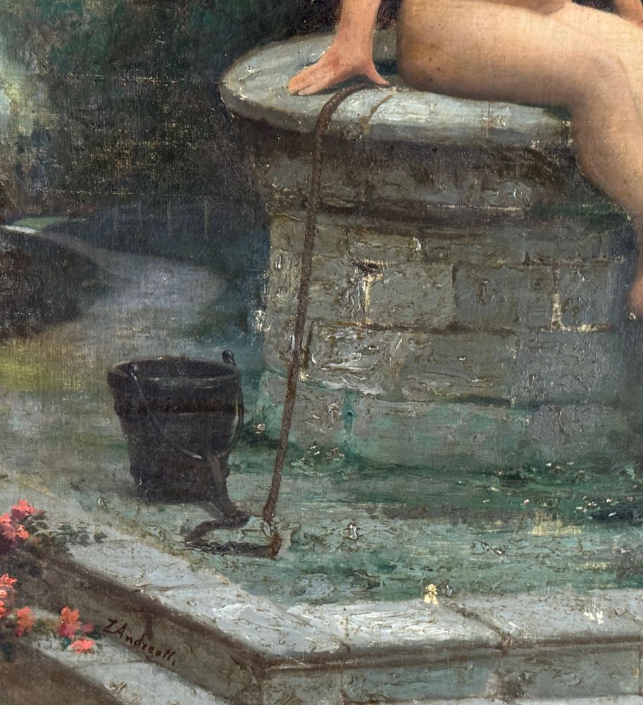 Dipinto olio su tela, periodo XIX secolo scuola italiana raffigurante Nudo di donna al pozzo. Dimensioni compreso cornice: 64x74 cm. Dimensioni interno cornice: 46x56 cm. Firmato in basso a sinistra Federico Andreotti (1847 - 1930). Opera in buone condizioni con lievi segni di vissuto come da foto allegate.