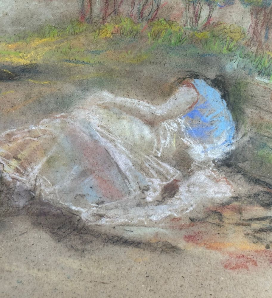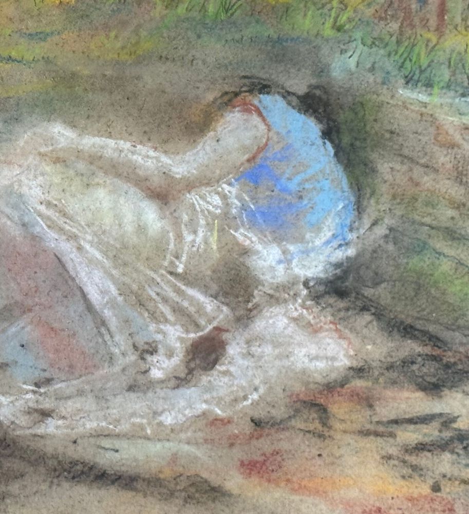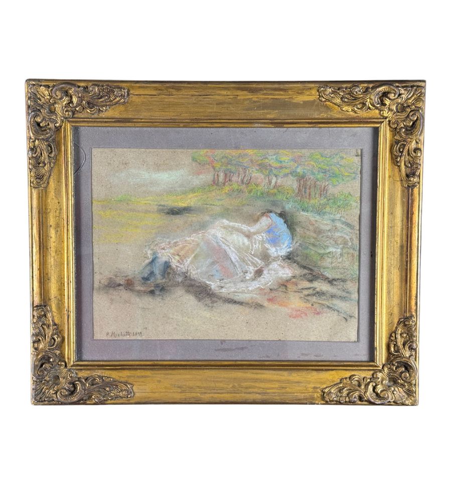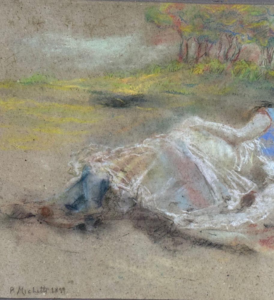 Disegno tecnica mista su cartoncino, periodo XIX secolo scuola italiana raffigurante Donna distesa nei campi. Dimensioni compreso cornice: 61x51 cm. Dimensioni interno cornice: 42x30 cm. Recante firma in basso a sinistra P.Michetti (1899). Opera in buone condizioni.