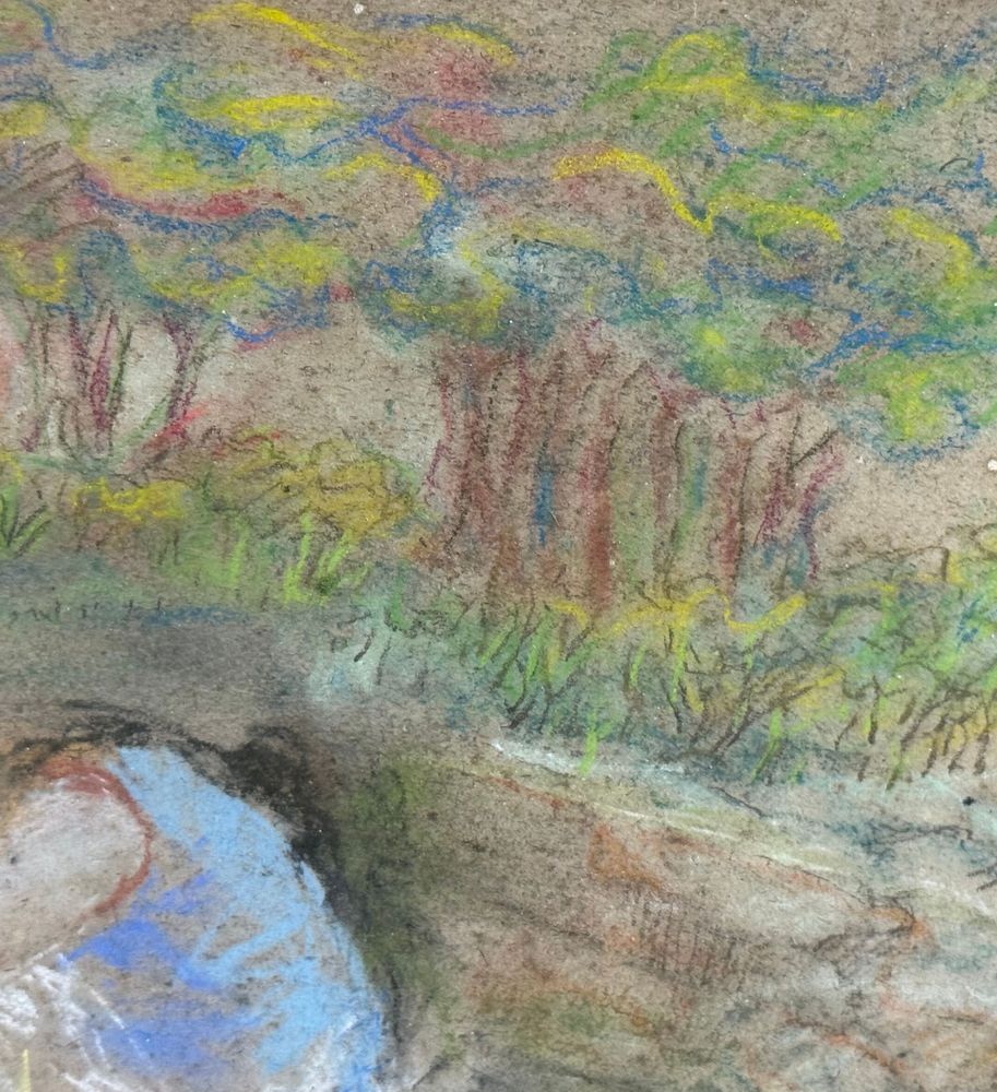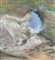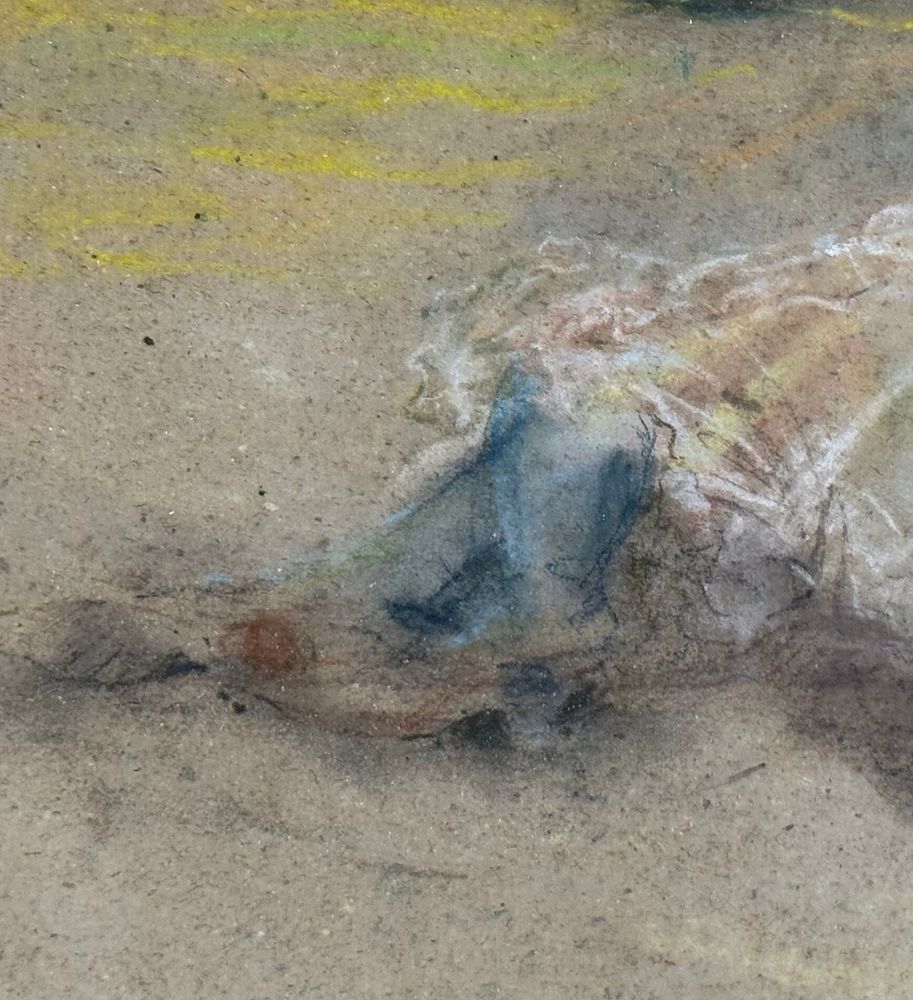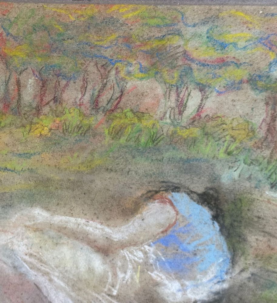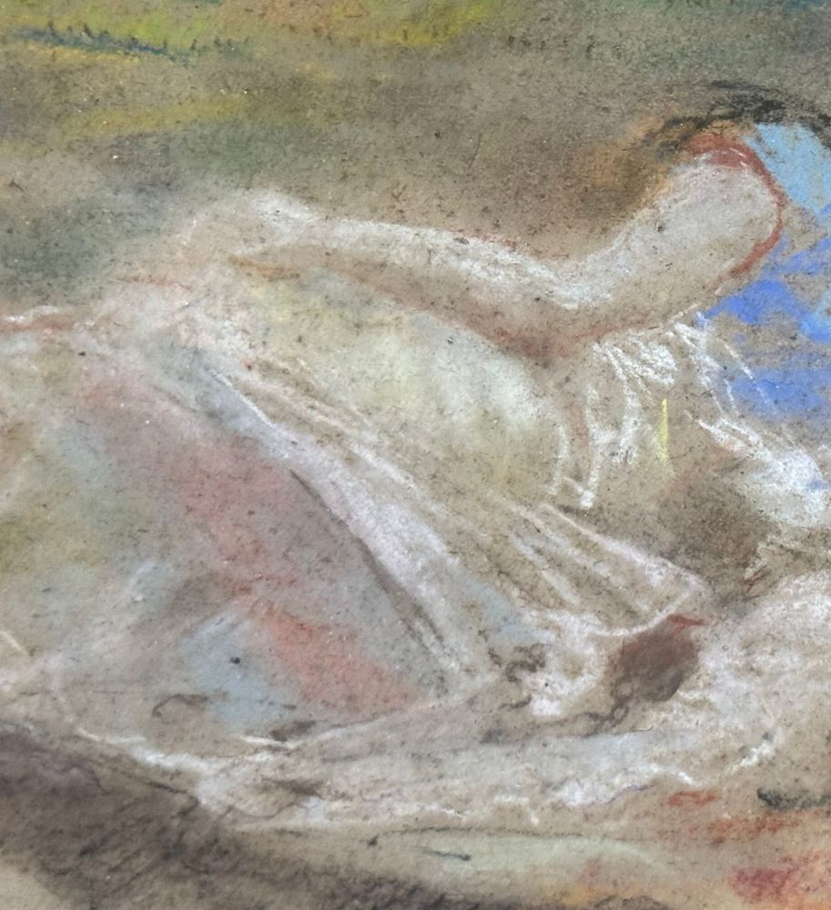 Disegno tecnica mista su cartoncino, periodo XIX secolo scuola italiana raffigurante Donna distesa nei campi. Dimensioni compreso cornice: 61x51 cm. Dimensioni interno cornice: 42x30 cm. Recante firma in basso a sinistra P.Michetti (1899). Opera in buone condizioni.