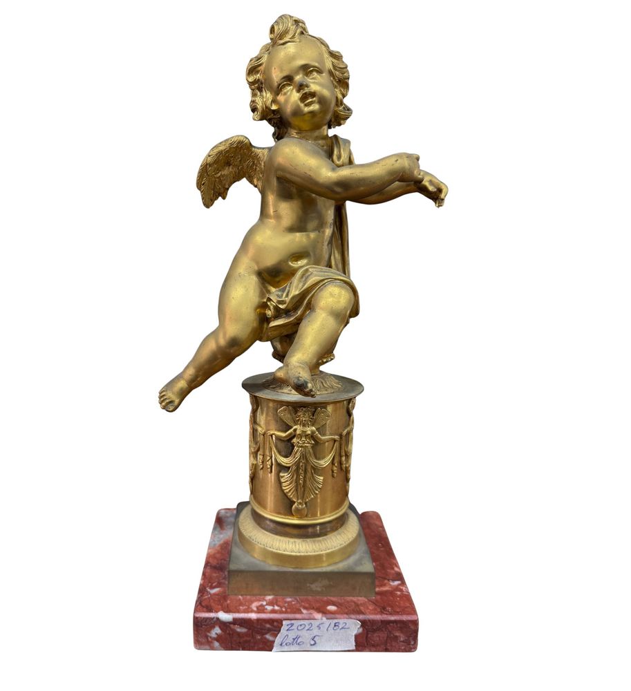 Lotto 96 | Scultura in bronzo dorato, raffigurante Puttino su base in marmo. Periodo XIX...