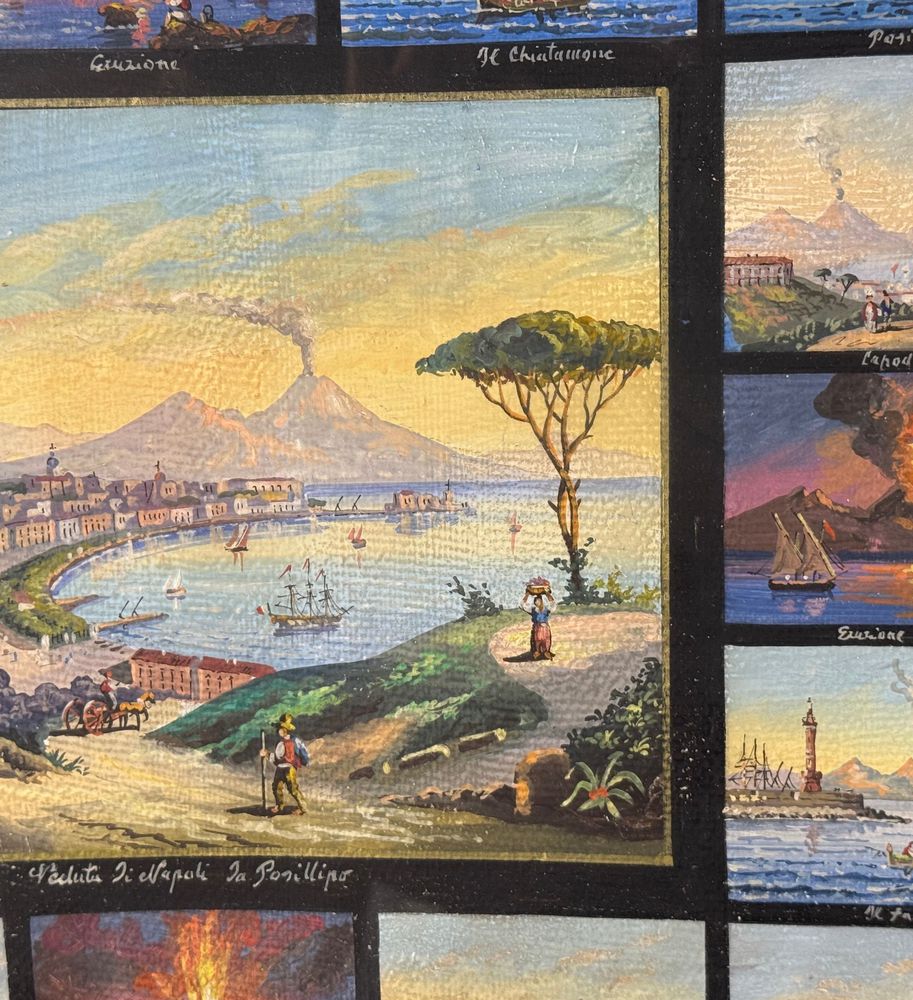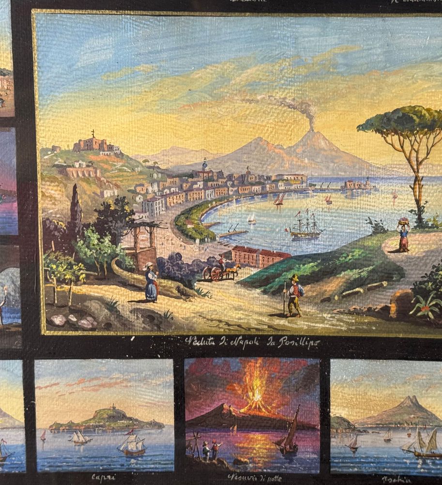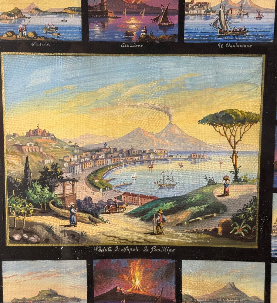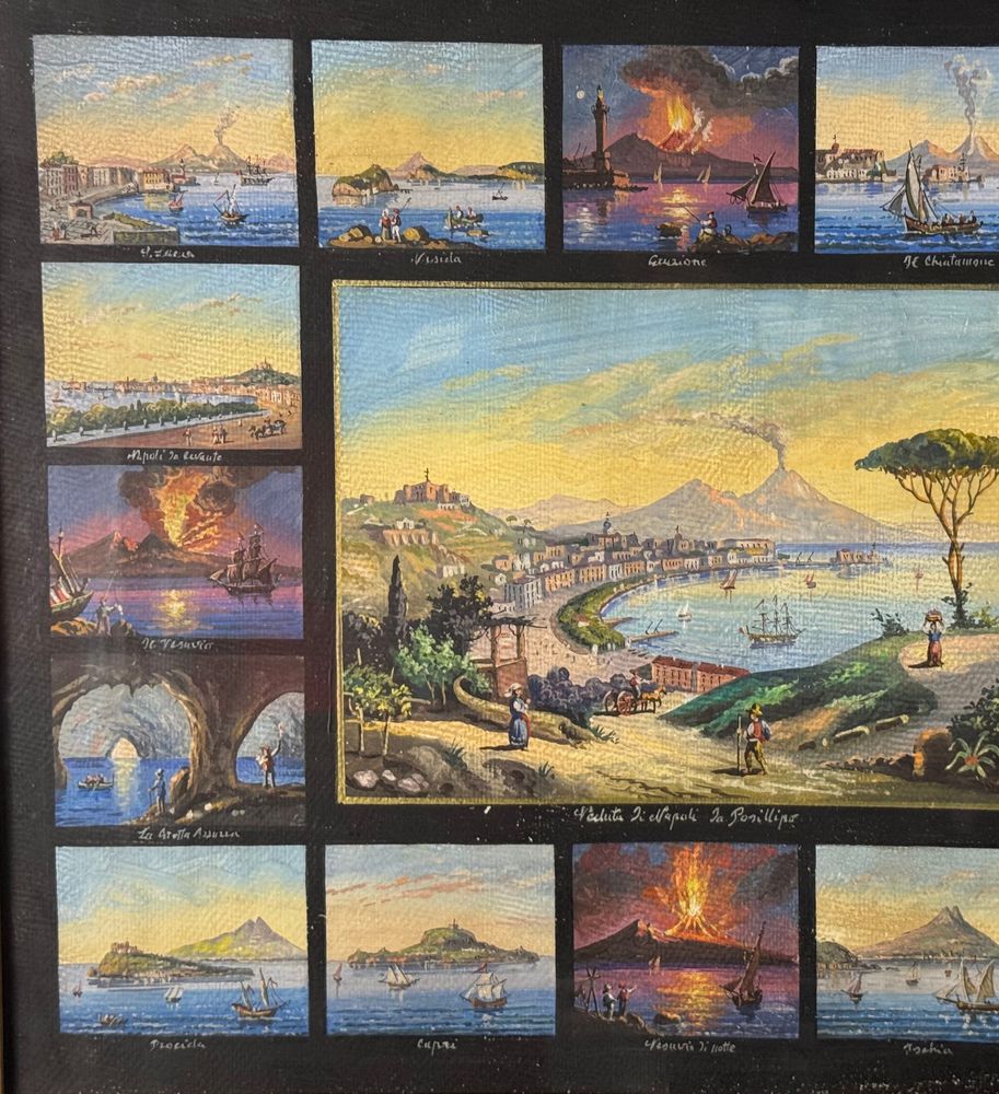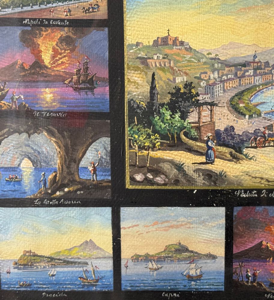 Dipinto guazzo (tempera su carta), periodo prima metà del XX secolo scuola napoletana, raffigurante 17 miniature raggruppate su un unico foglio di varie scene di luoghi napoletani. Dimensioni compreso cornice: 67x58 cm. Dimensioni interno cornice: 51x43 cm. Da artista anonimo. Opera in buone condizioni con lievi segni di visuto come da foto allegate.