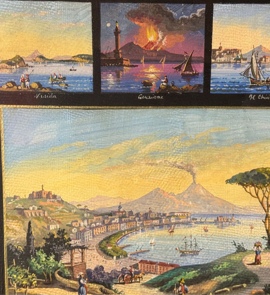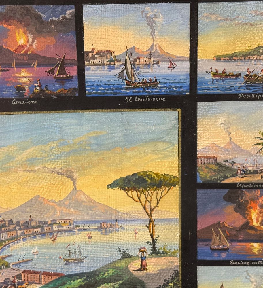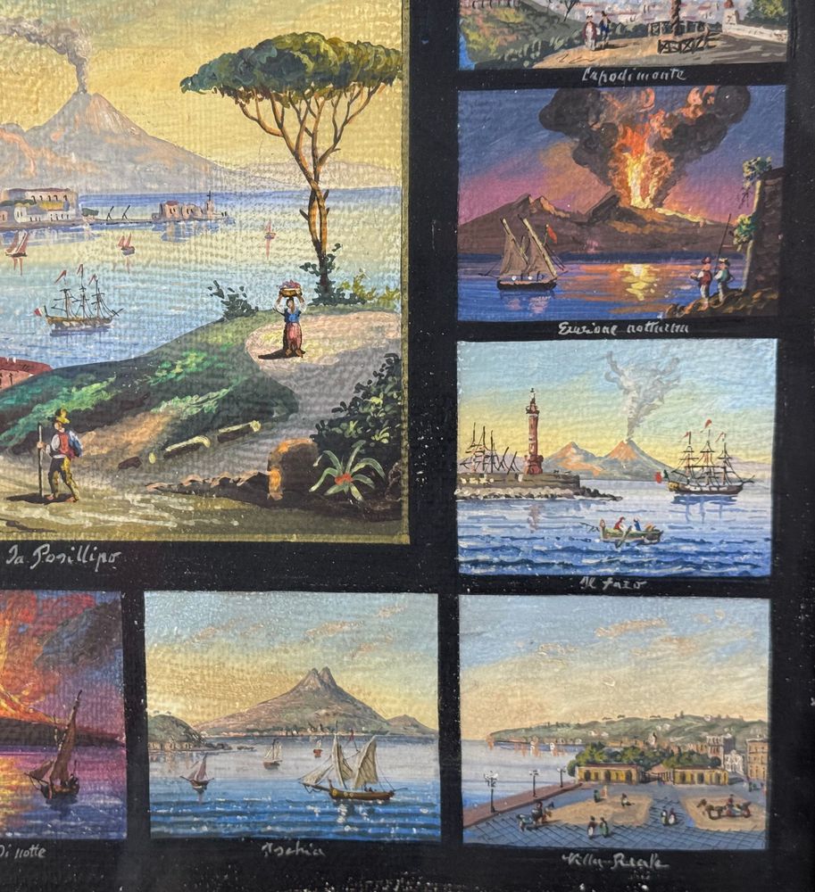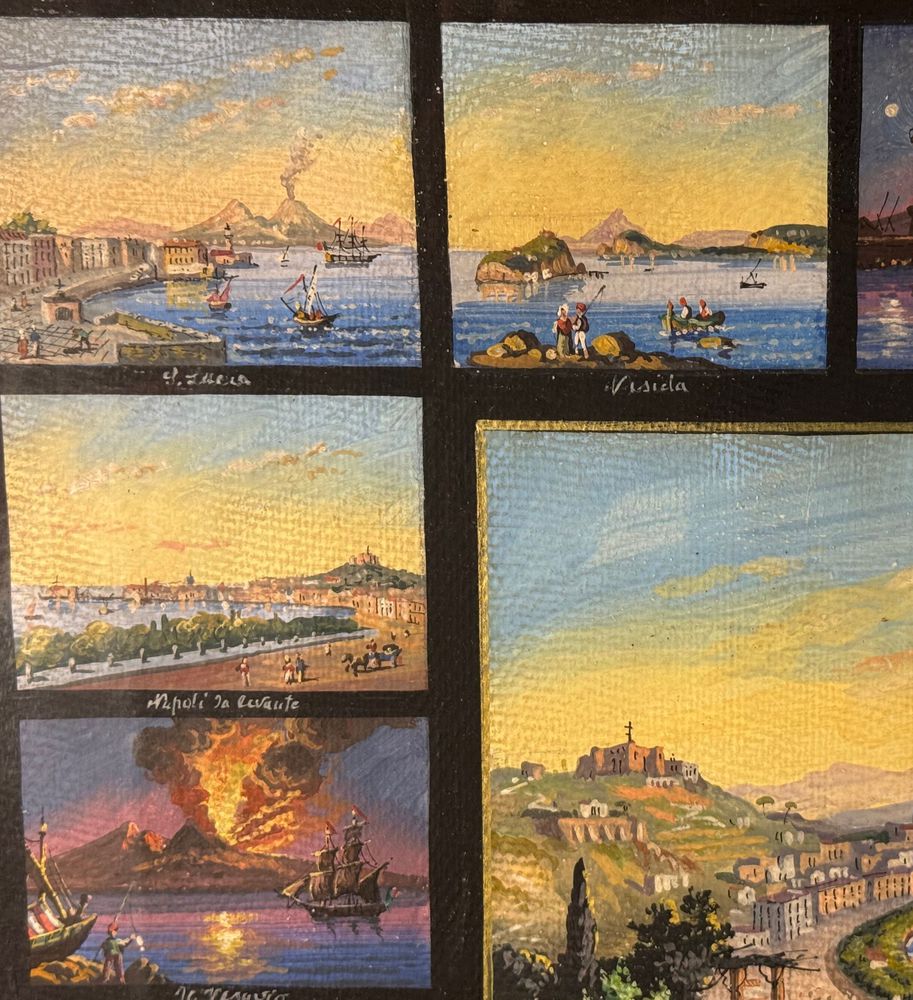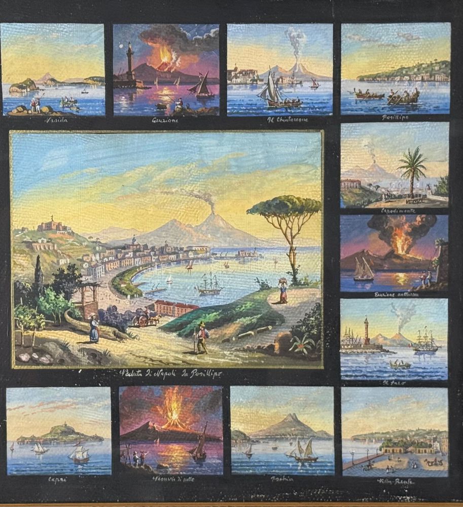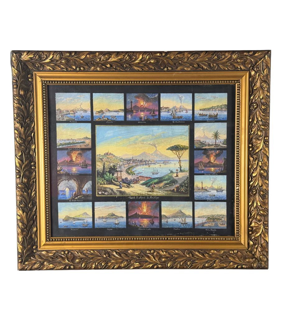 Dipinto guazzo (tempera su carta), periodo prima metà del XX secolo scuola napoletana, raffigurante 17 miniature raggruppate su un unico foglio di varie scene di luoghi napoletani. Dimensioni compreso cornice: 67x58 cm. Dimensioni interno cornice: 51x43 cm. Da artista anonimo. Opera in buone condizioni con lievi segni di visuto come da foto allegate.