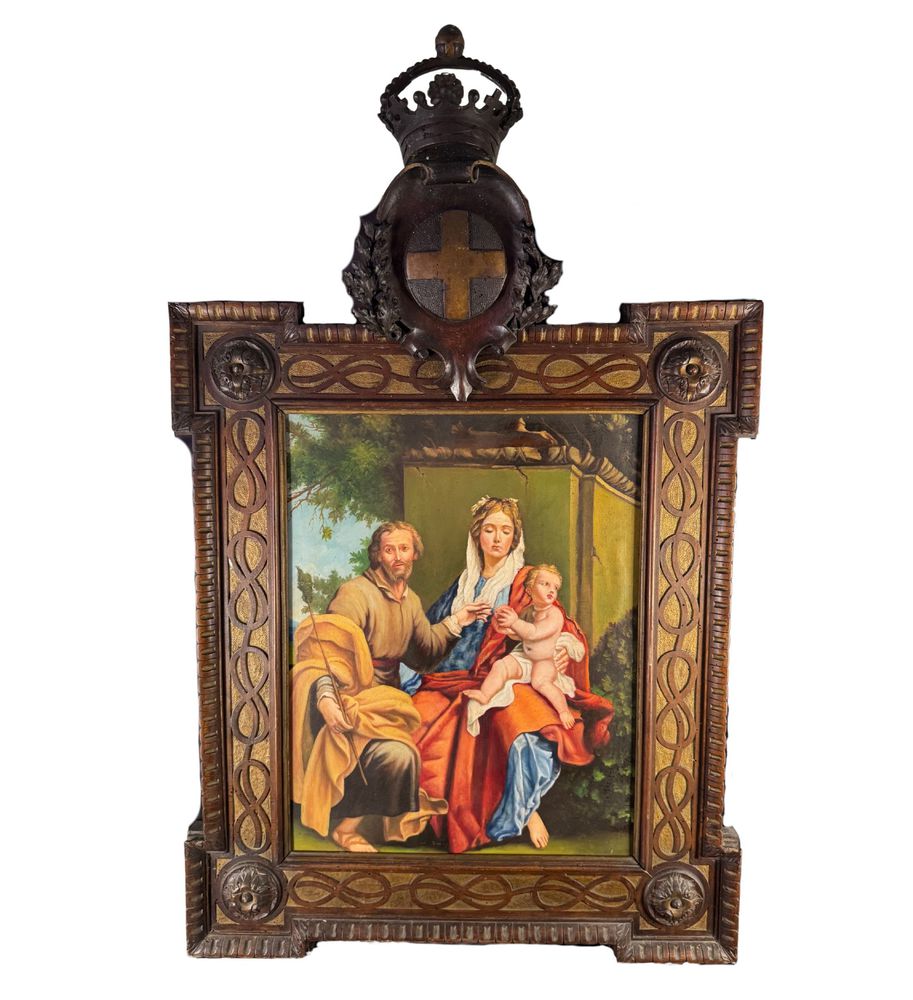 Dipinto olio su tela applicata su pannello, periodo XX secolo, scuola Italiana, raffigurante Sacra Famiglia. Dimensioni compreso cornice: 75x118 cm. Dimensioni interno cornice: 49x52 cm. Da artista anonimo. Opera in buone condizioni. Corredata da una importante cornice in legno intagliato.