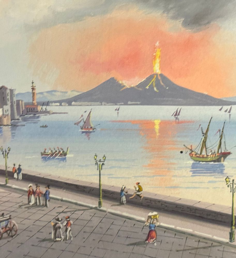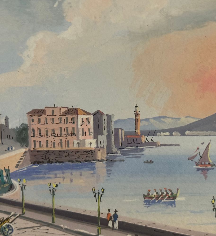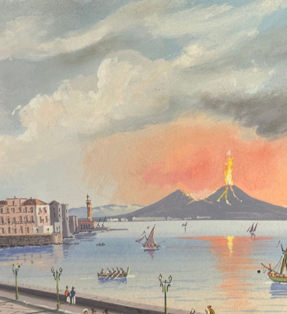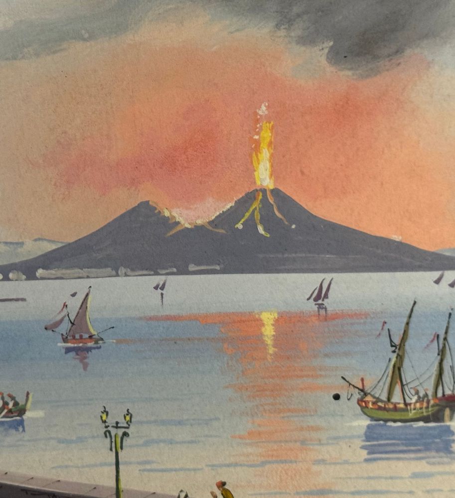 Dipinto guazzo (tempera su carta), periodo XX secolo, scuola Italiana, raffigurante Veduta di Santa Lucia a Napoli con eruzione del Vesuvio. Dimensioni compreso cornice: 47x34. Dimensioni interno cornice: 42x30 cm. Artista anonimo. Opera in buone condizioni.