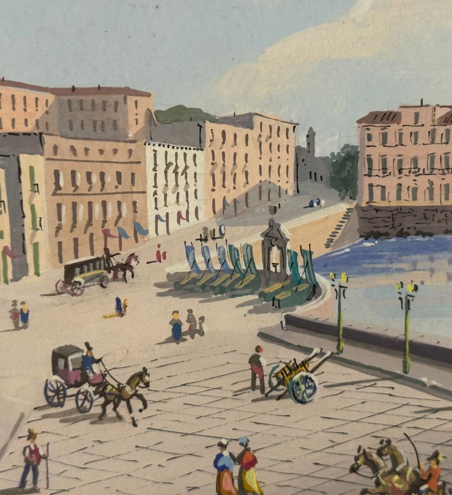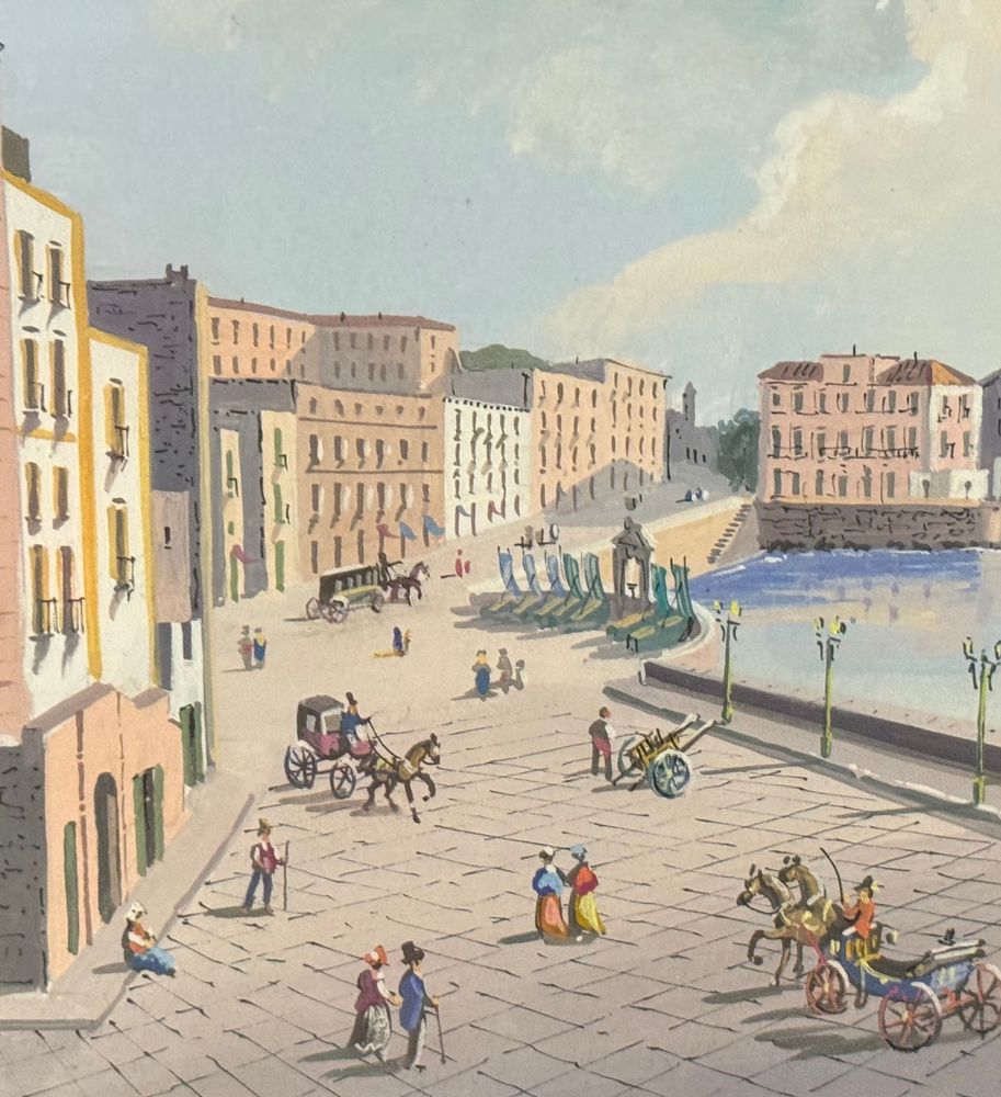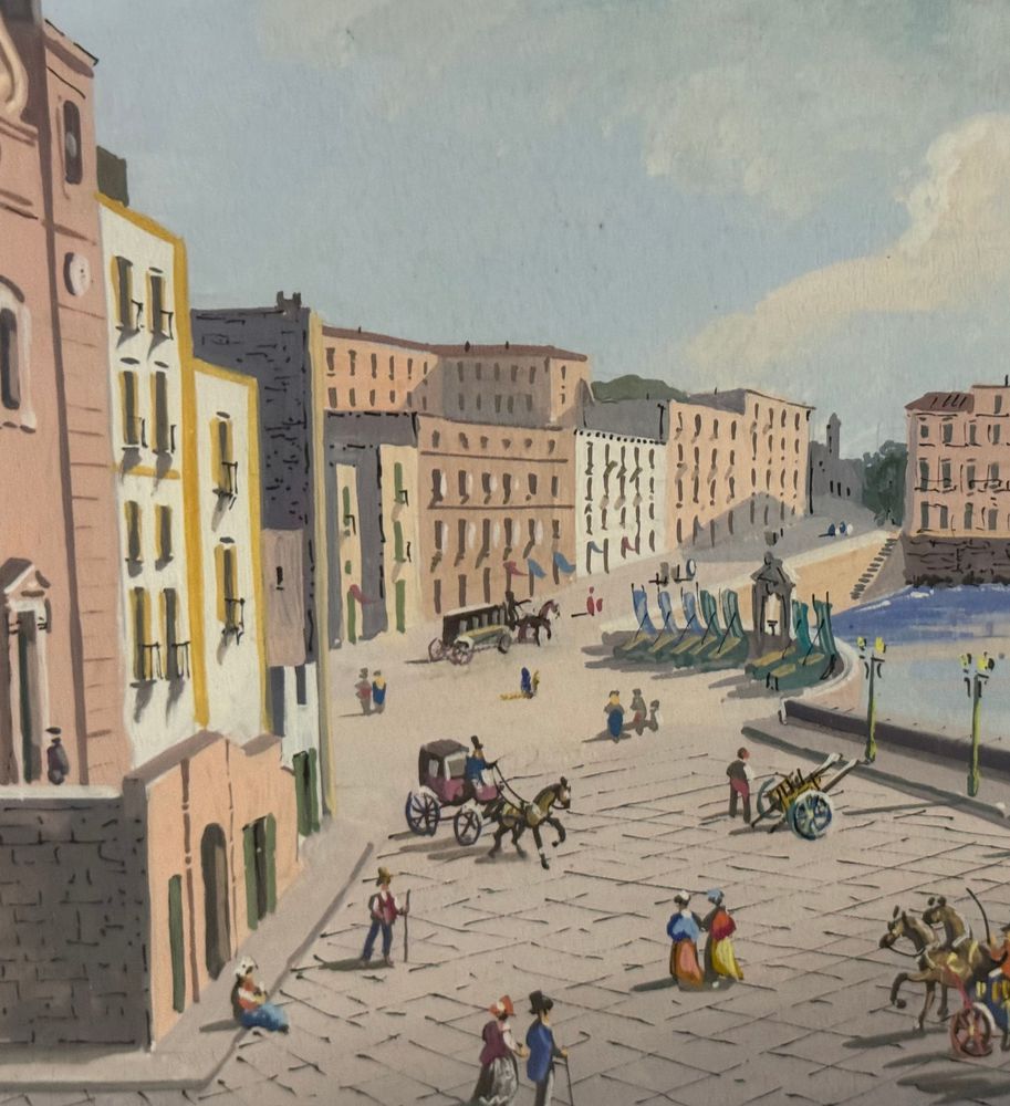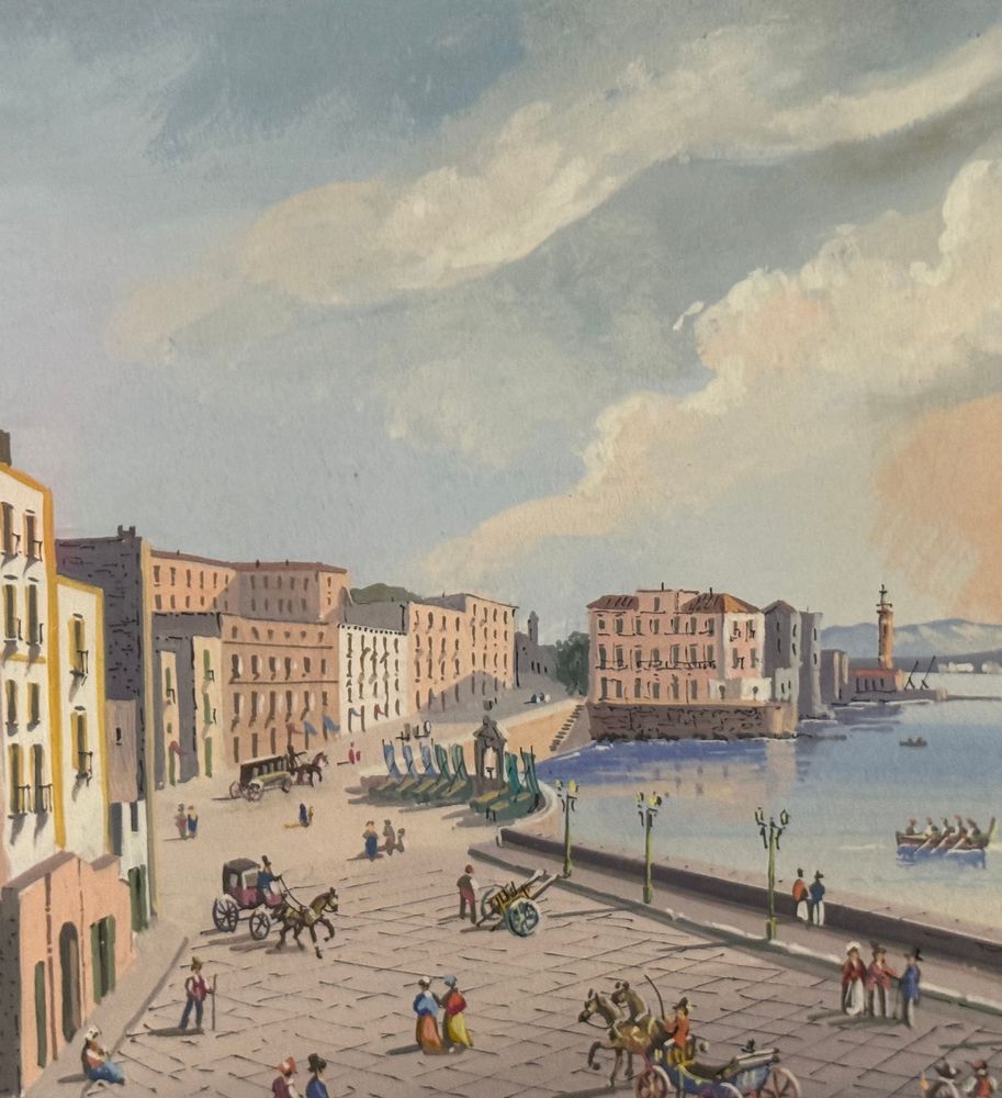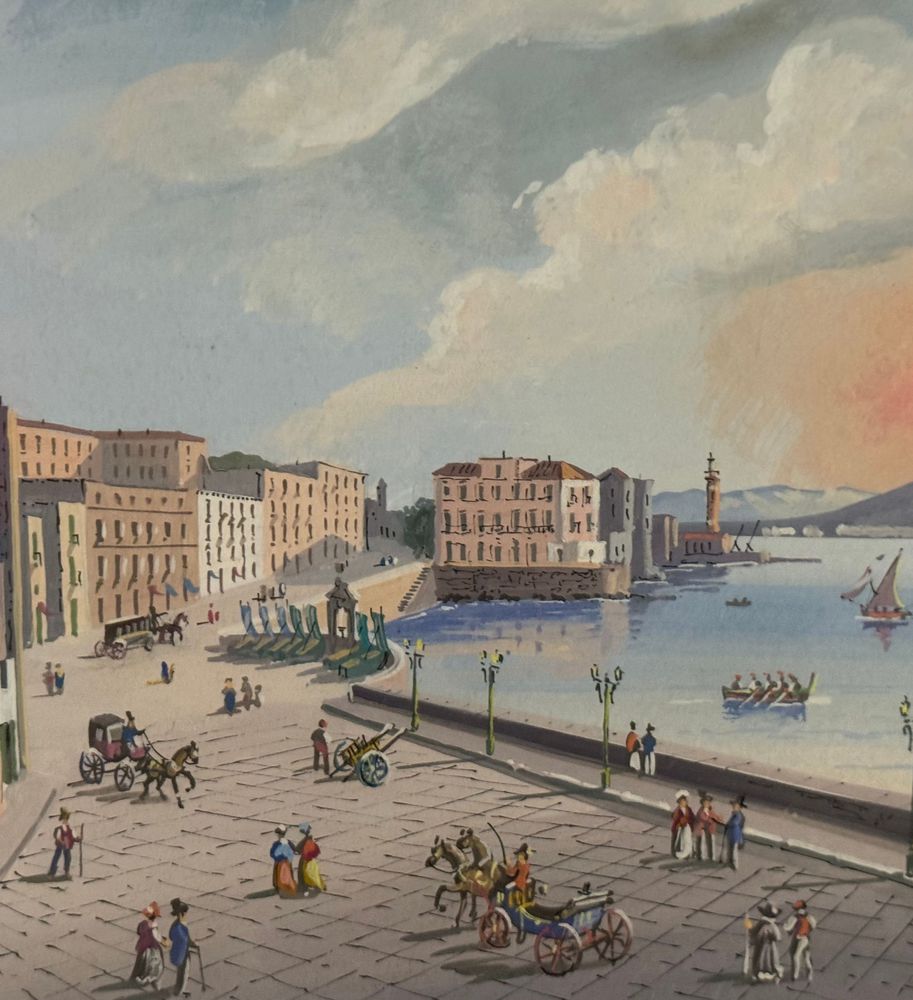 Dipinto guazzo (tempera su carta), periodo XX secolo, scuola Italiana, raffigurante Veduta di Santa Lucia a Napoli con eruzione del Vesuvio. Dimensioni compreso cornice: 47x34. Dimensioni interno cornice: 42x30 cm. Artista anonimo. Opera in buone condizioni.