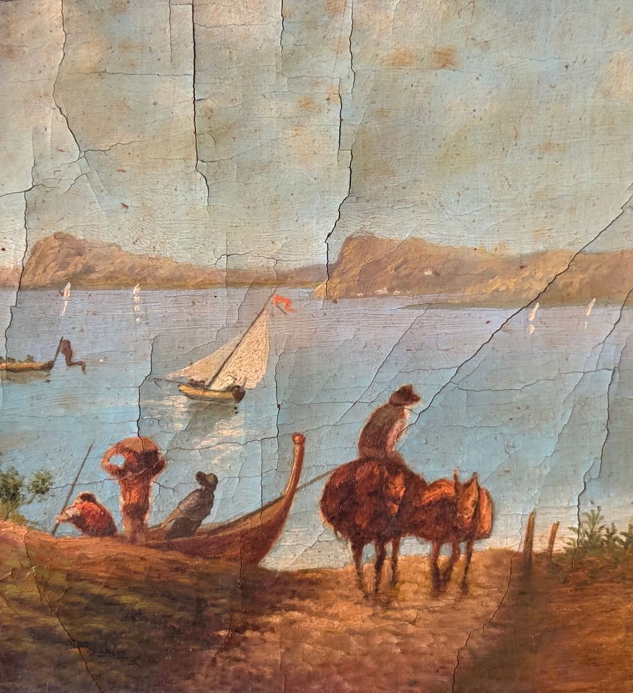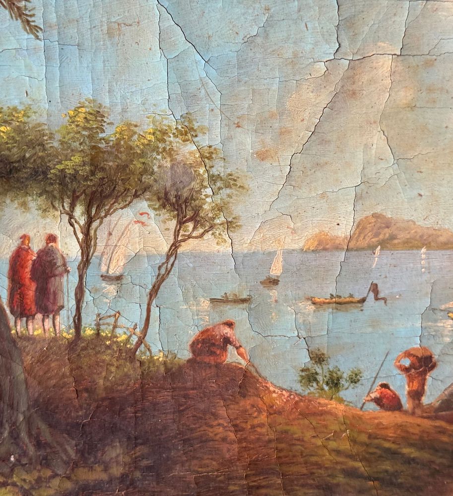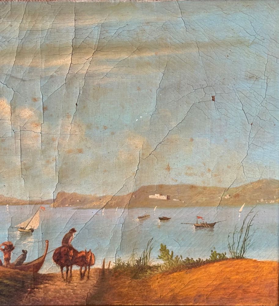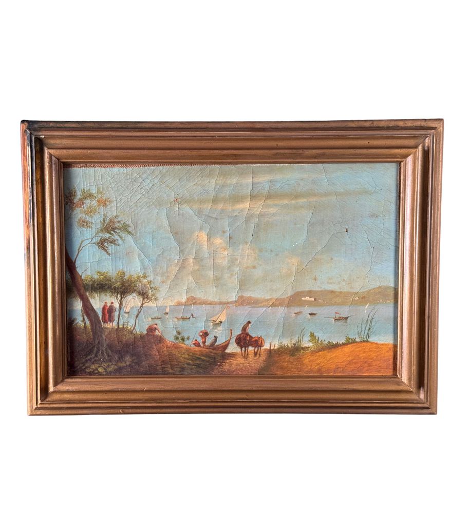 Dipinto olio su tela, periodo XIX/XX secolo, scuola Italiana, raffigurante Marina con personaggi. Dimensioni compreso cornice: 61x44 cm. Dimensioni interno cornice: 49x32 cm. Da artista anonimo. Opera in discrete condizioni come da foto allegate, da segnalare un vecchio rintelo.