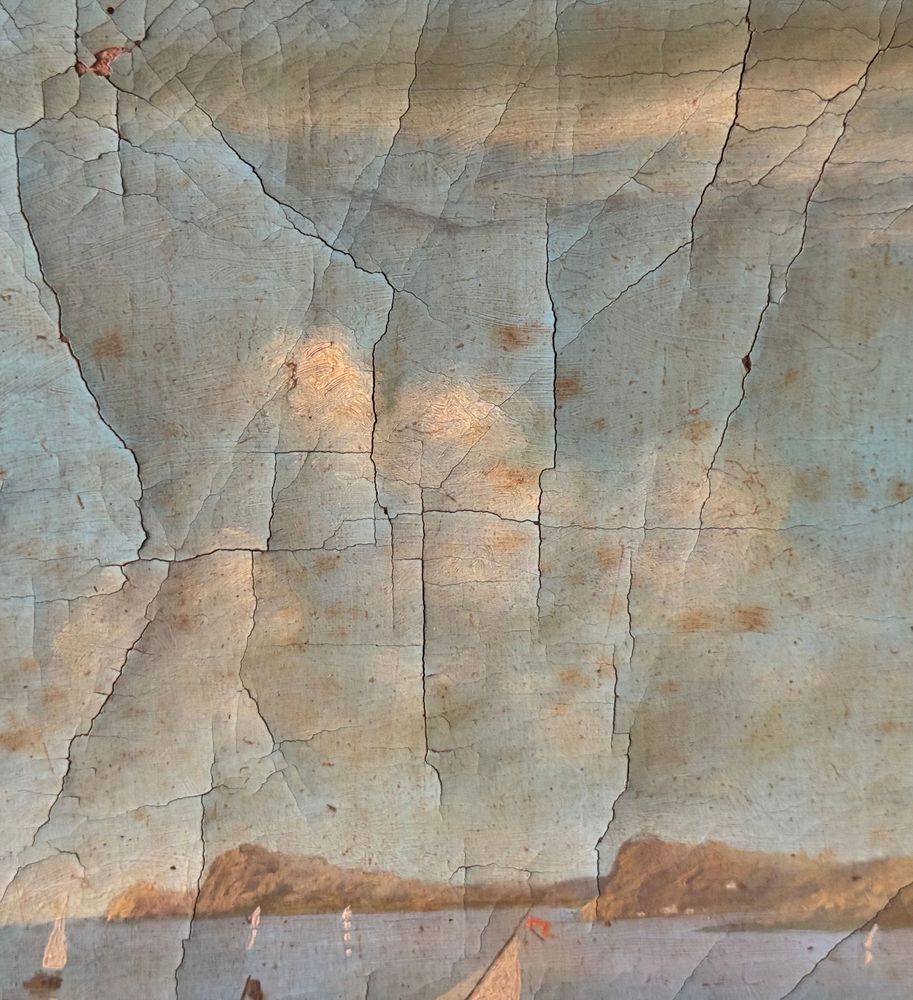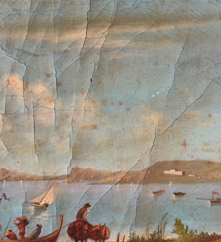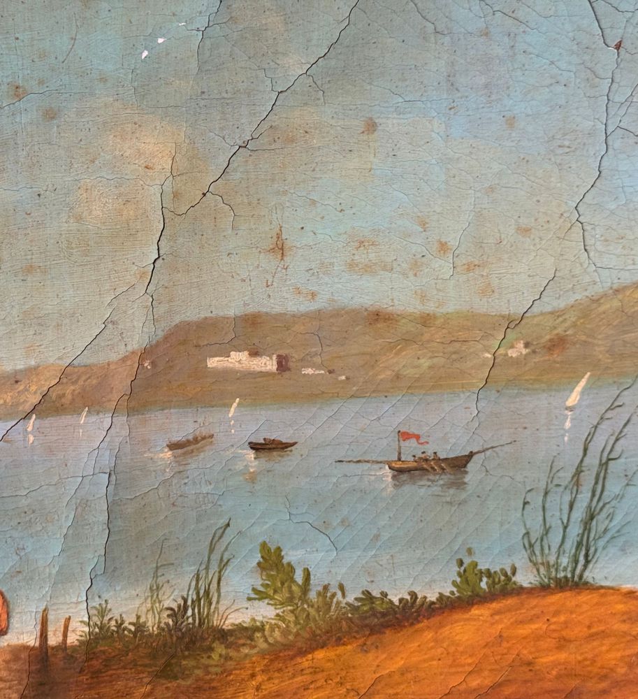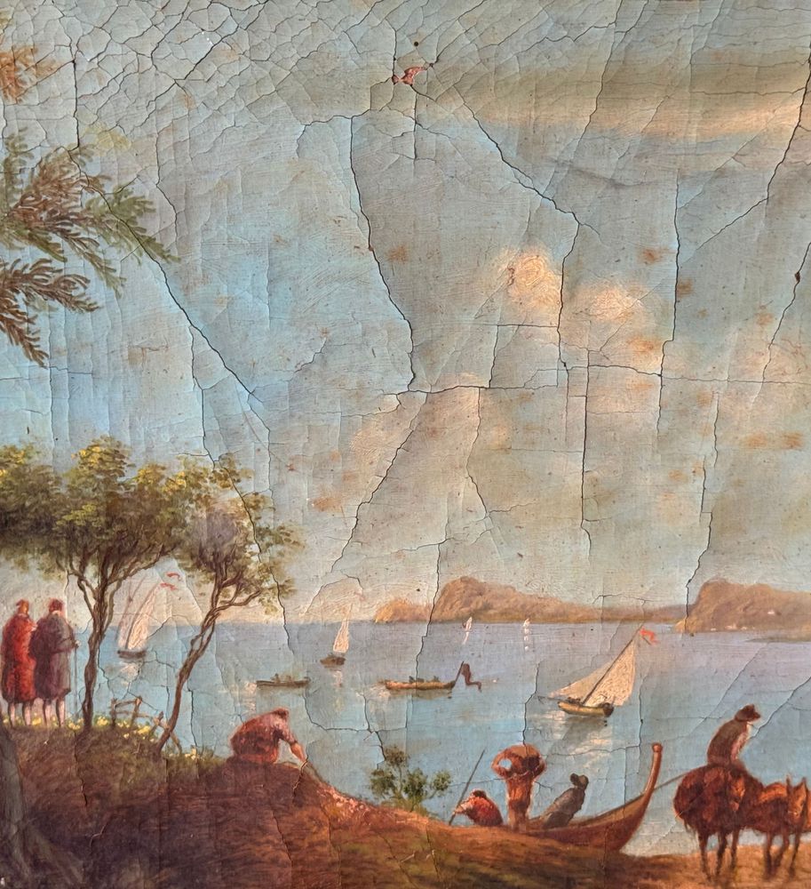 Dipinto olio su tela, periodo XIX/XX secolo, scuola Italiana, raffigurante Marina con personaggi. Dimensioni compreso cornice: 61x44 cm. Dimensioni interno cornice: 49x32 cm. Da artista anonimo. Opera in discrete condizioni come da foto allegate, da segnalare un vecchio rintelo.