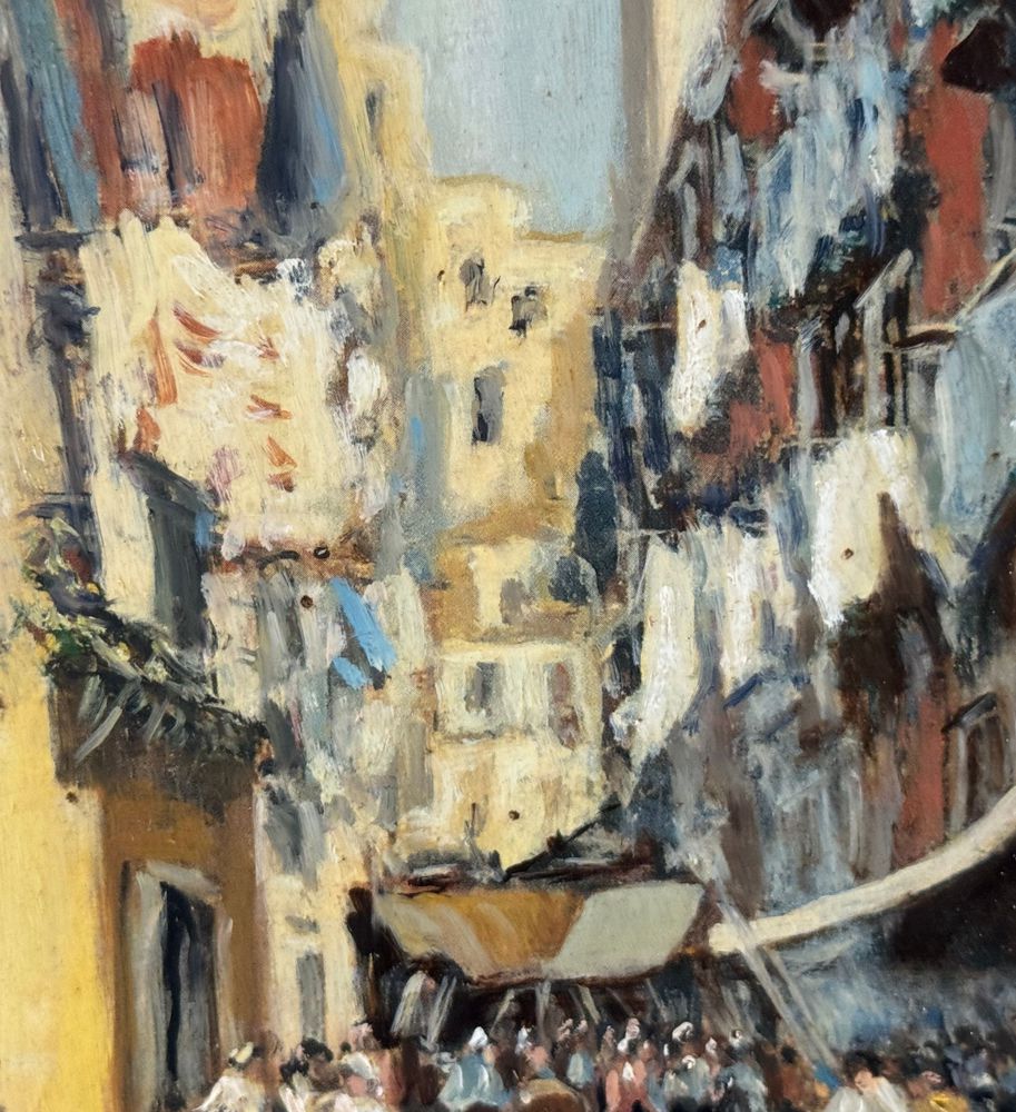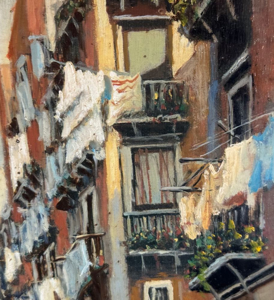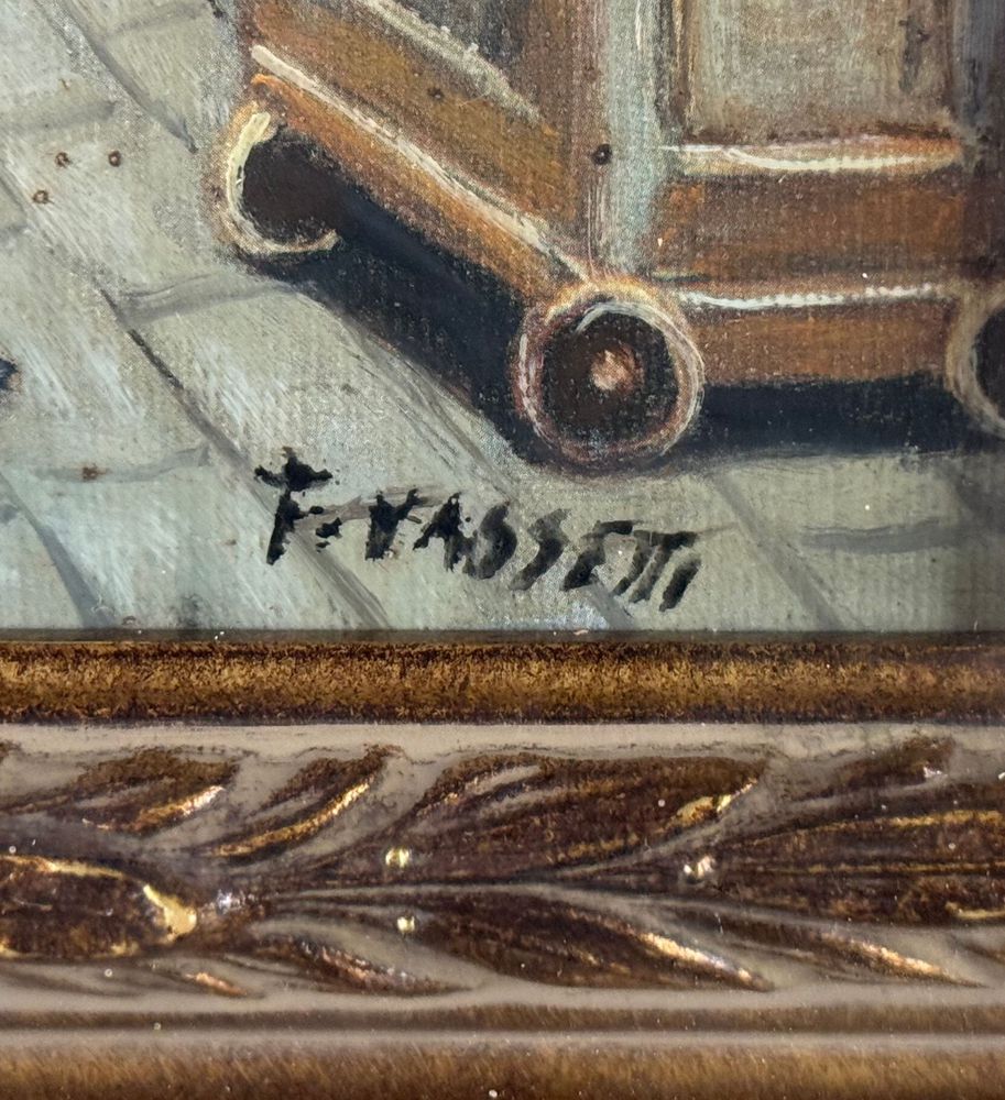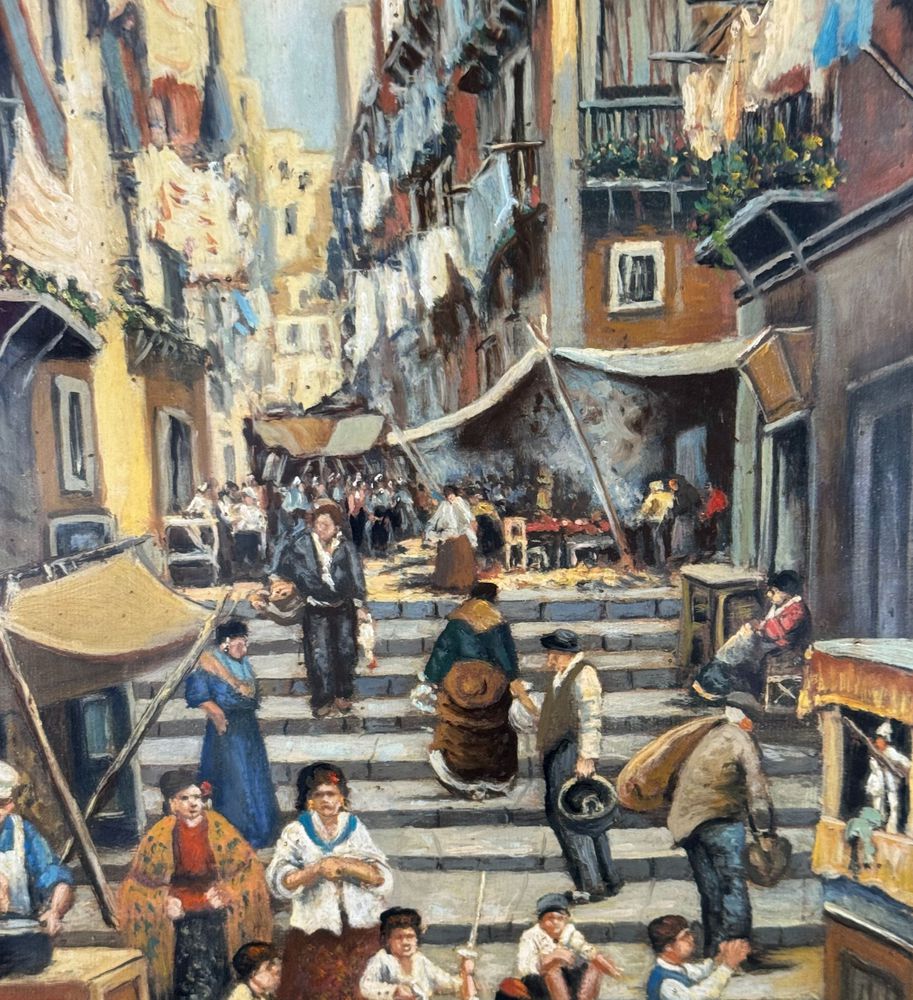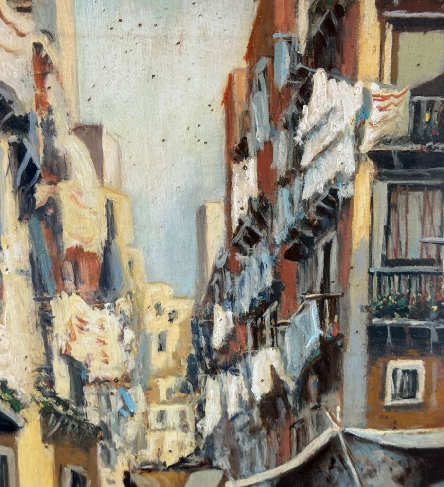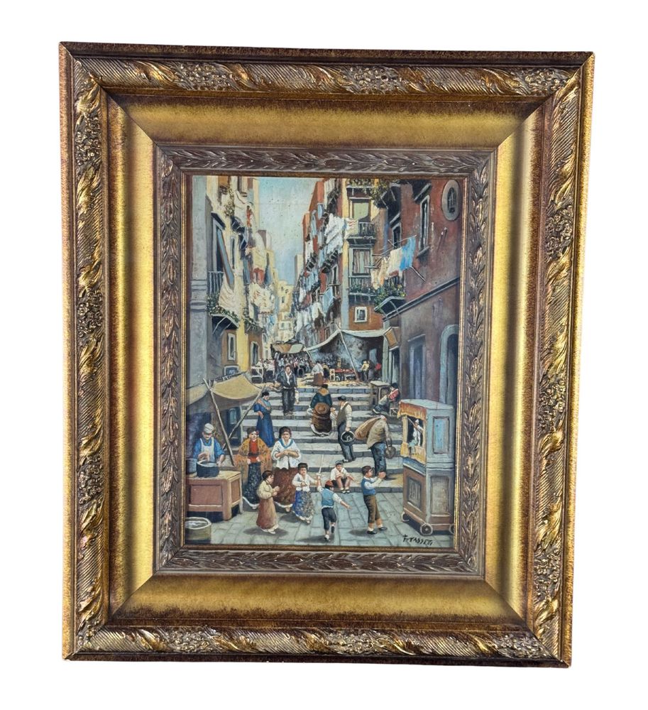 Dipinto olio su tela, periodo XX secolo, scuola Italiana, raffigurante Stradina napoletana con personaggi. Dimensioni compreso cornice: 55x65 cm. Dimensioni interno cornice: 30x40 cm. Firmato in basso a destra Vassetti. Opera in buone condizioni.