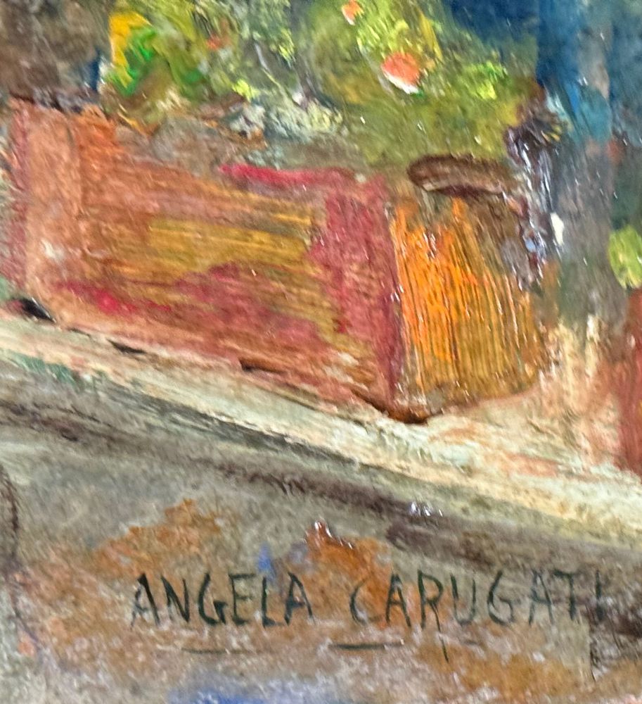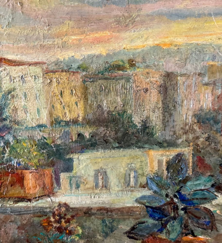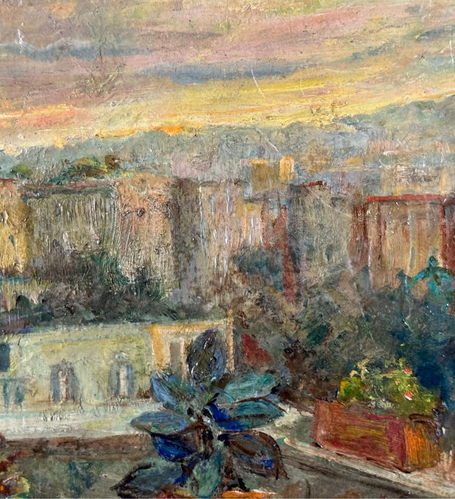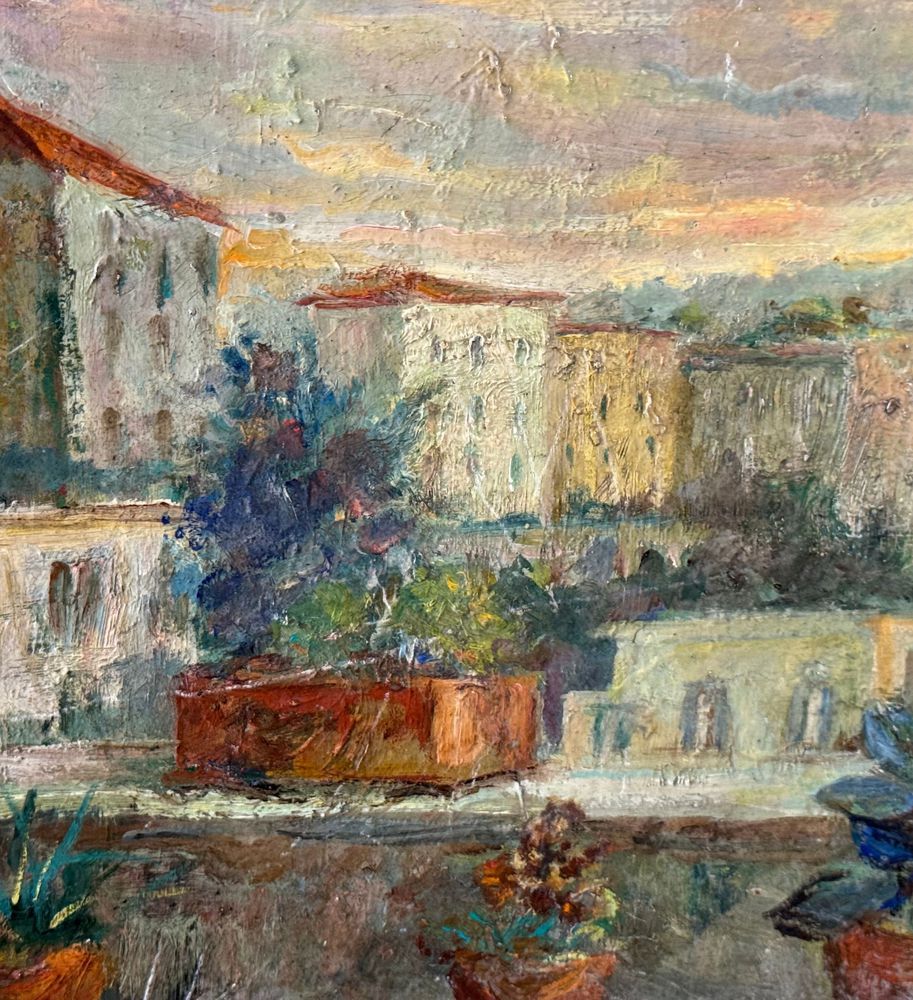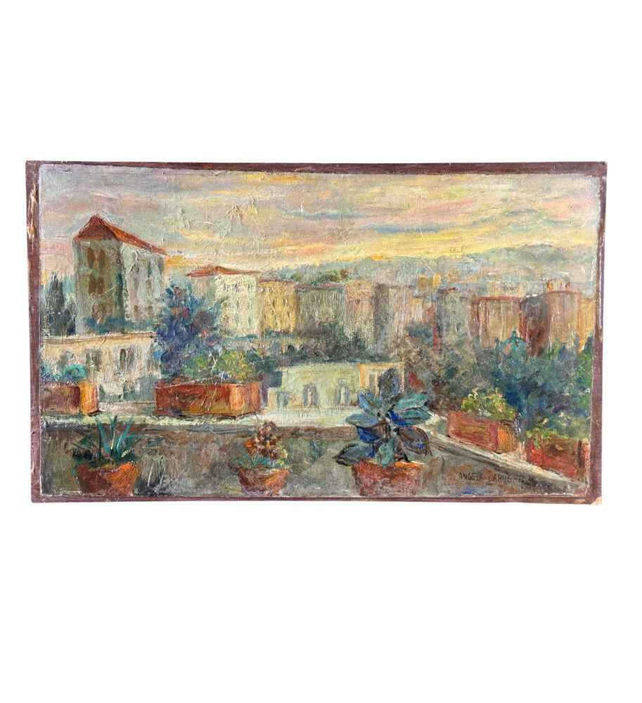 Dipinto olio su pannello, periodo XX secolo, scuola Italiana, raffigurante Veduta di città da una terrazza. Dimensioni: 50x30 cm. Firmato in basso a destra Angela Carugati. Opera in buone condizioni.
