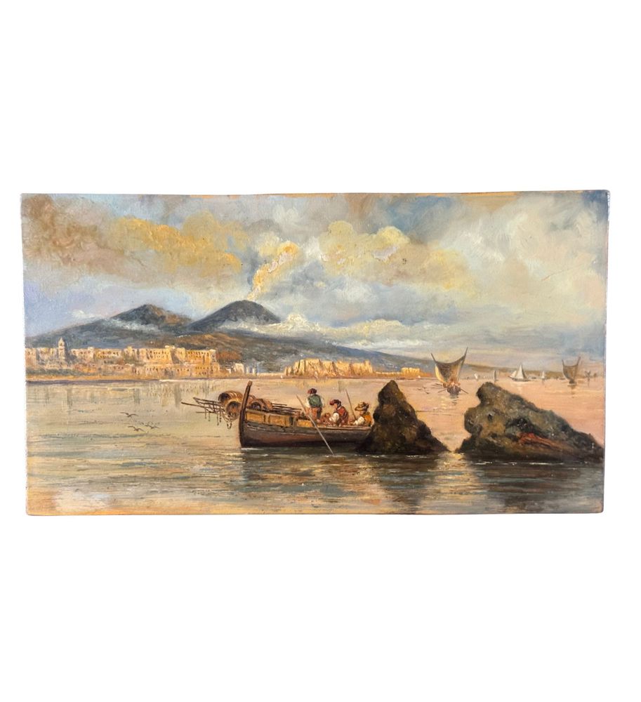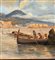 Dipinto olio su tavola, periodo XX secolo, scuola Italiana, raffigurante Marina napoletana con barche e pescatori. Dimensioni: 30x17 cm. Artista anonimo. Opera in buone condizioni.