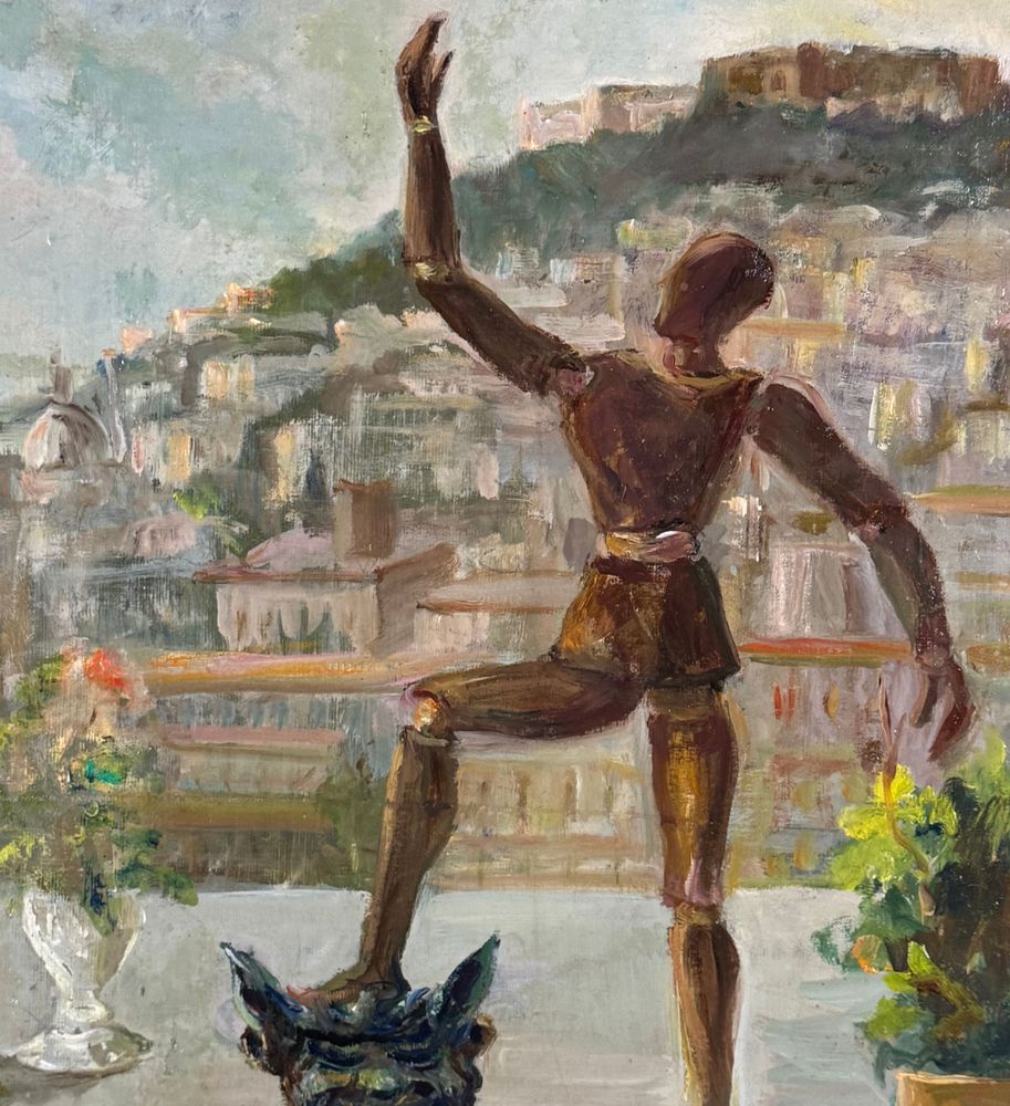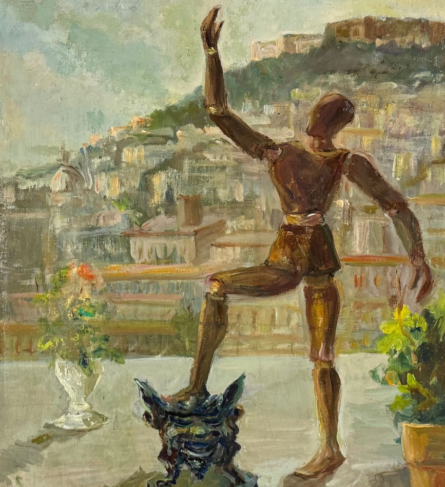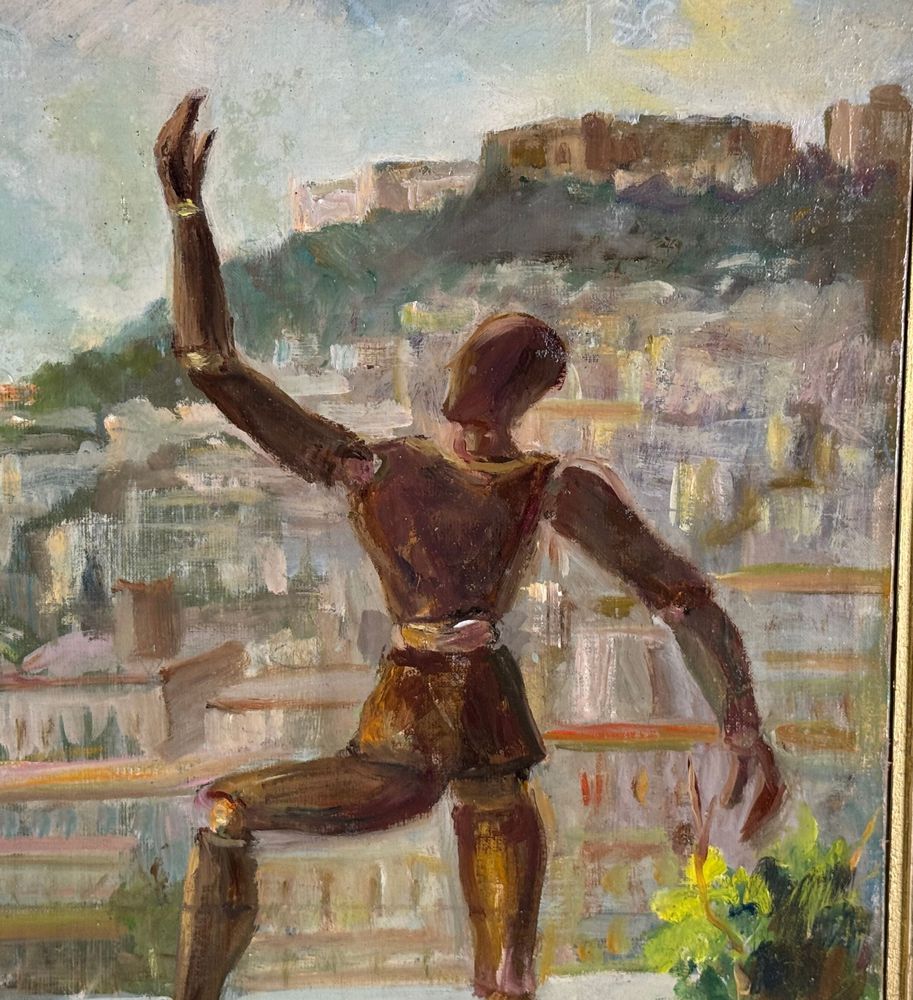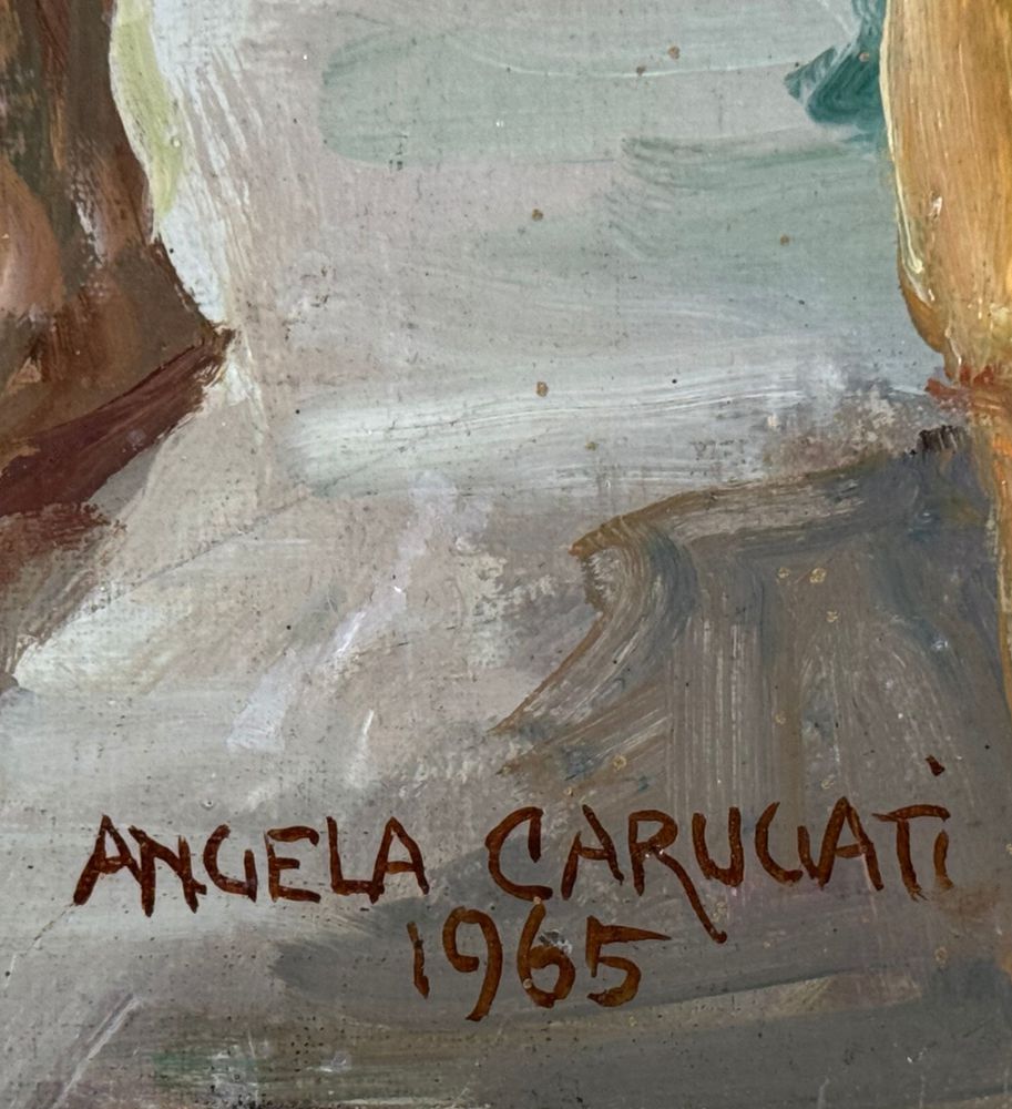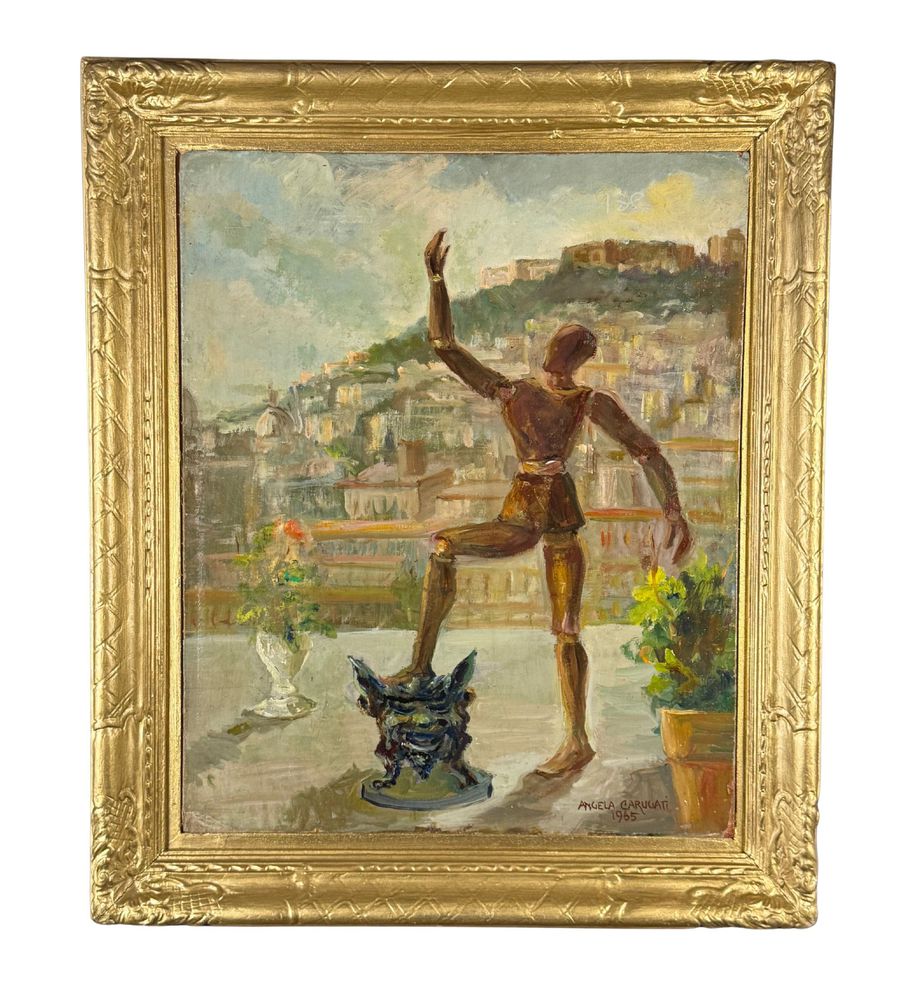 Dipinto olio su tela applicata su pannello, periodo XX secolo, scuola Italiana, raffigurante Paesaggio con manichino. Dimensioni compreso cornice: 59x69 cm. Dimensioni interno cornice: 45x55 cm. Firmato in basso a destra Angela Carugati. Opera in buone condizioni.