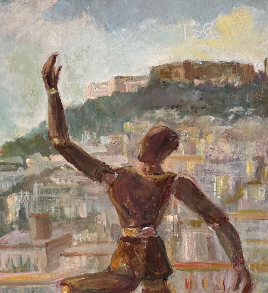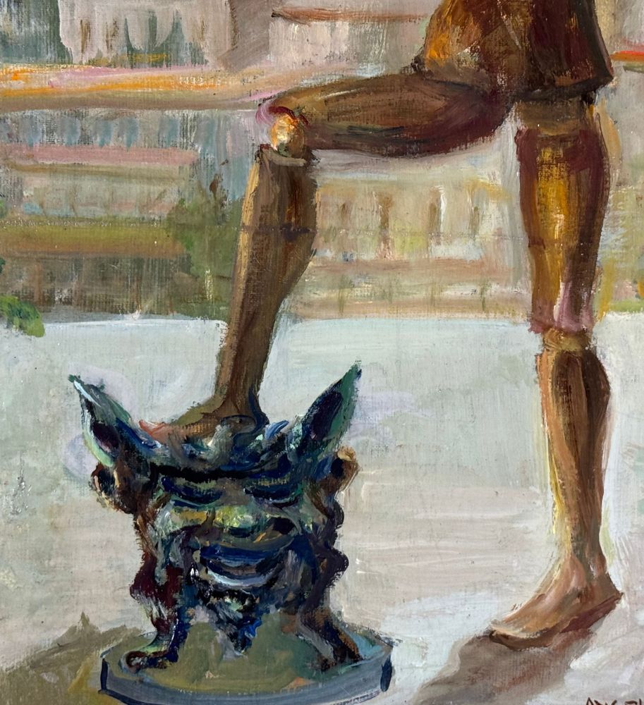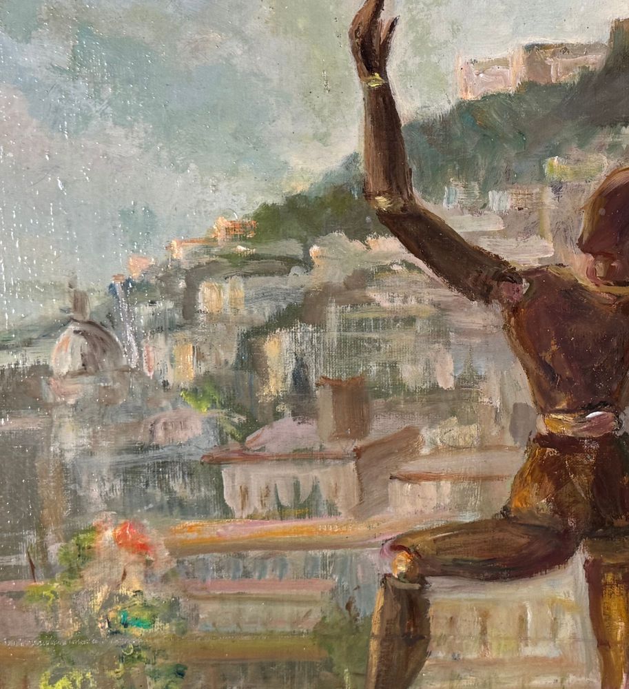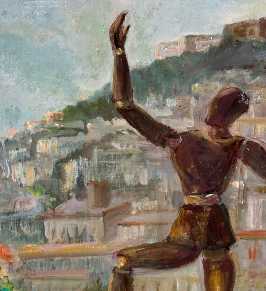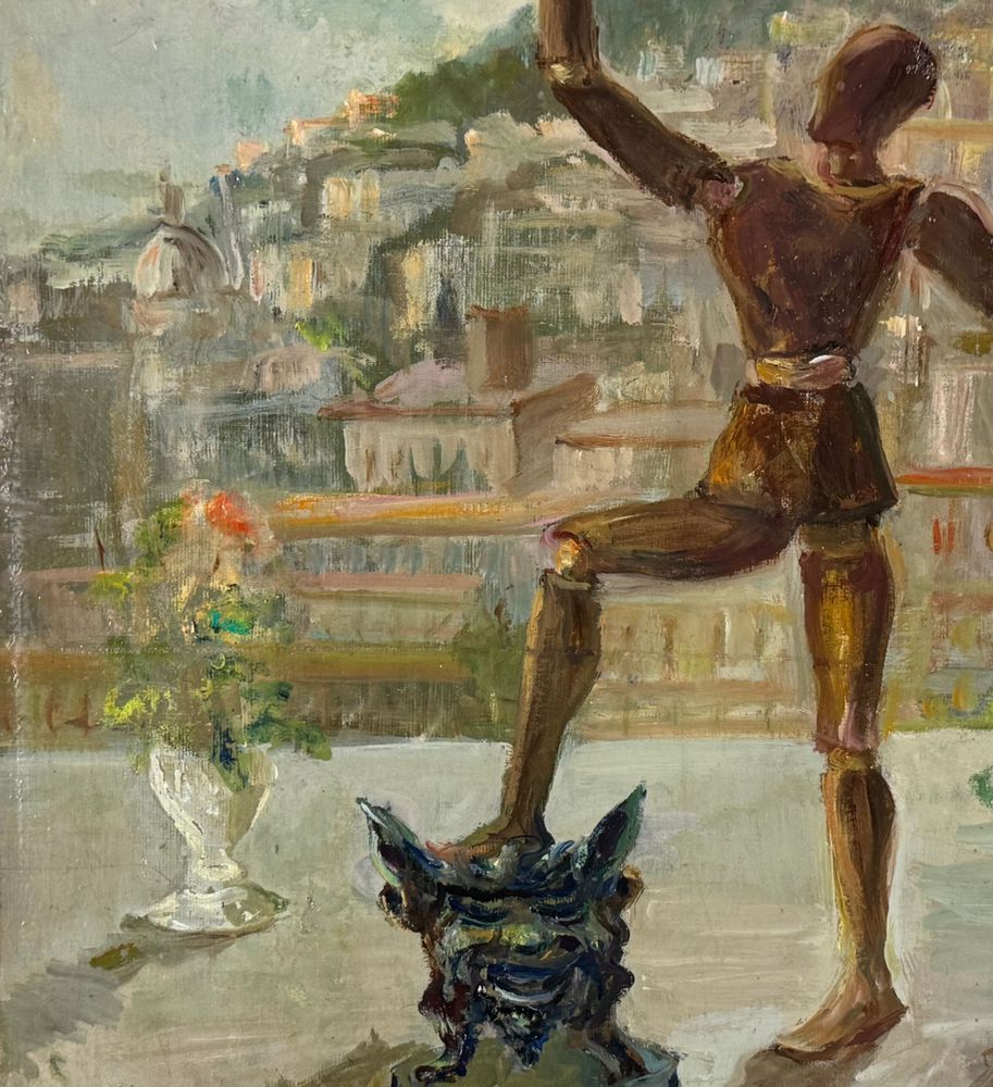 Dipinto olio su tela applicata su pannello, periodo XX secolo, scuola Italiana, raffigurante Paesaggio con manichino. Dimensioni compreso cornice: 59x69 cm. Dimensioni interno cornice: 45x55 cm. Firmato in basso a destra Angela Carugati. Opera in buone condizioni.