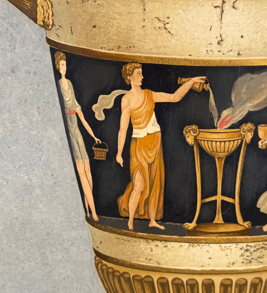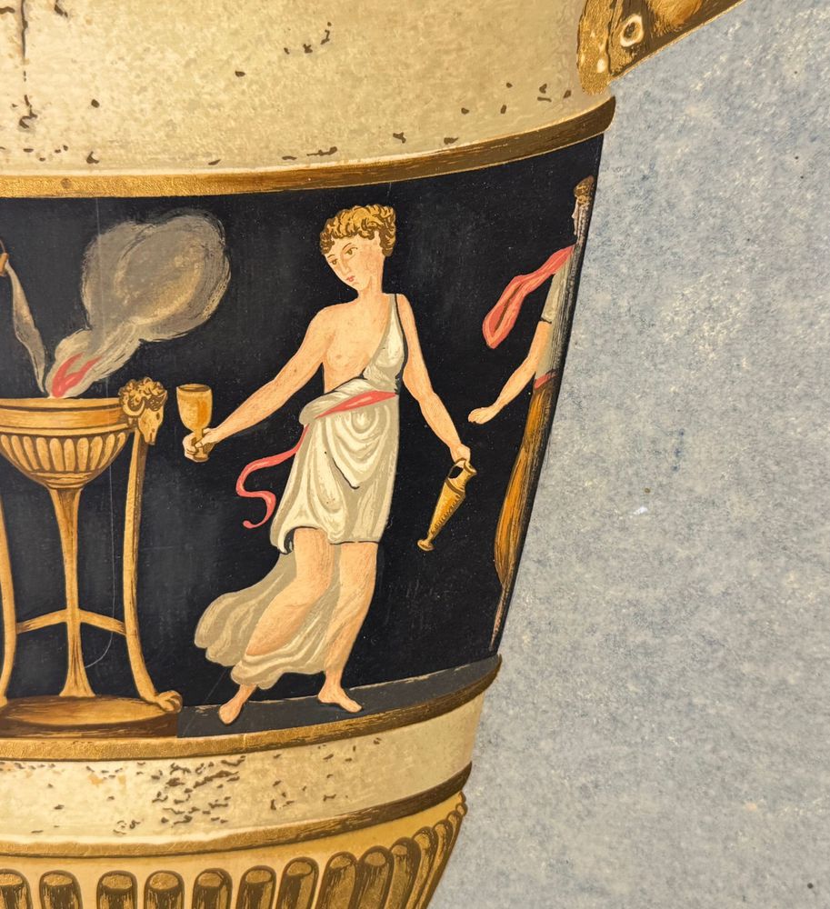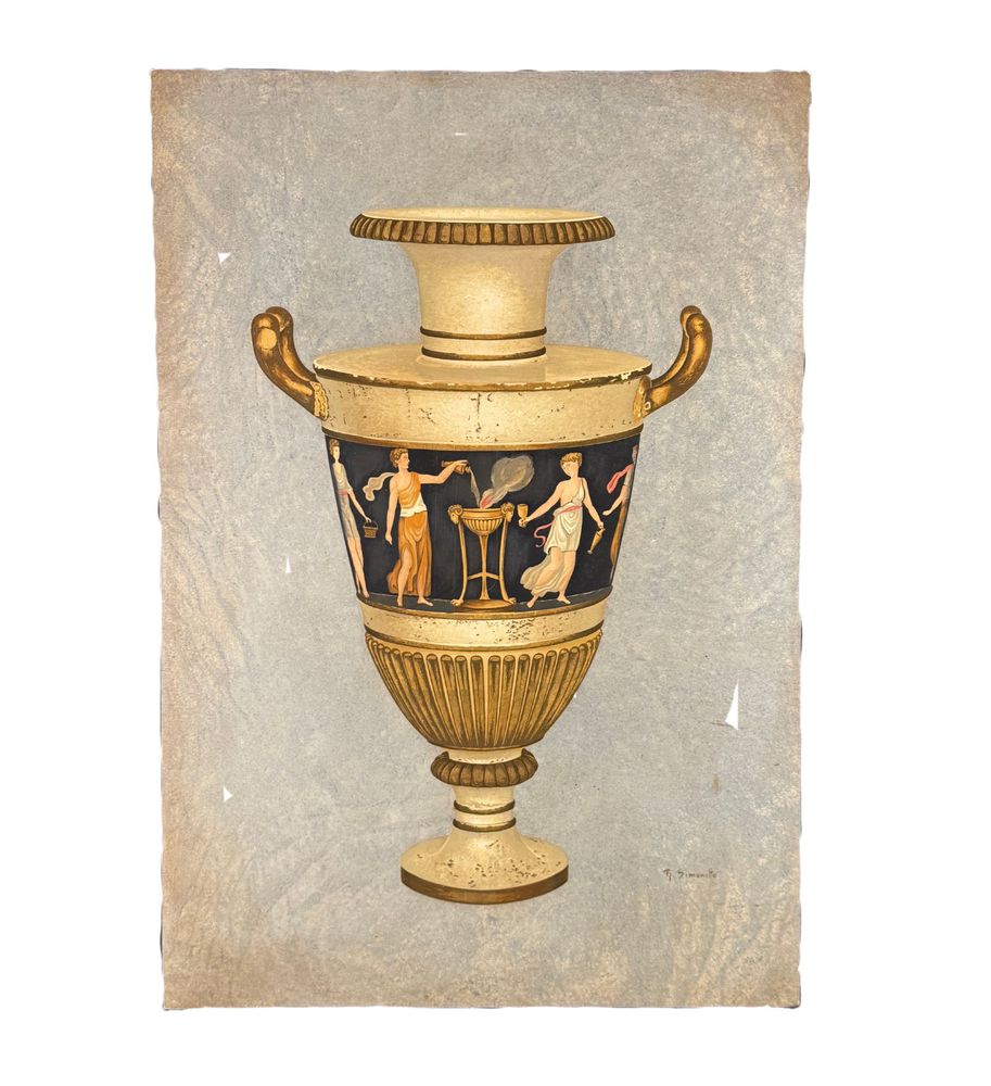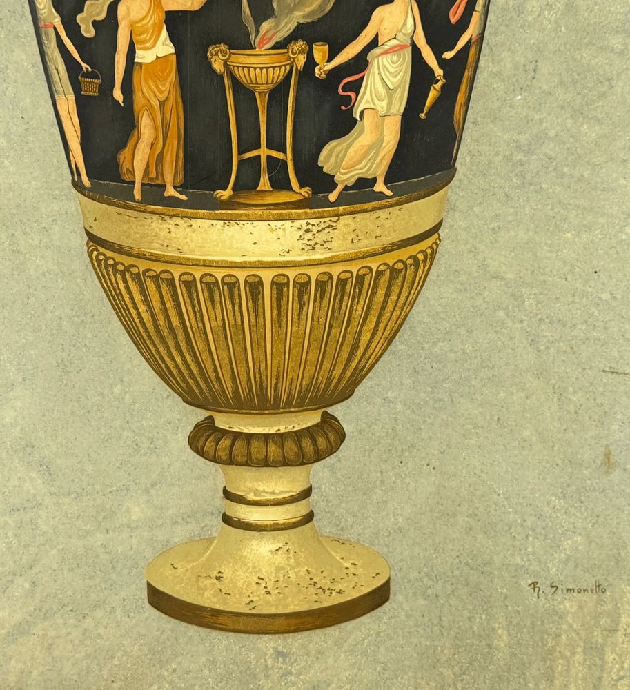 Pannello decorativo, periodo XX secolo, scuola Italiana, raffigurante Vaso con scena Pompeiana. Dimensioni: 64x44 cm. Firmato in basso a destra R. Simonetto. Opera in buone condizioni.
