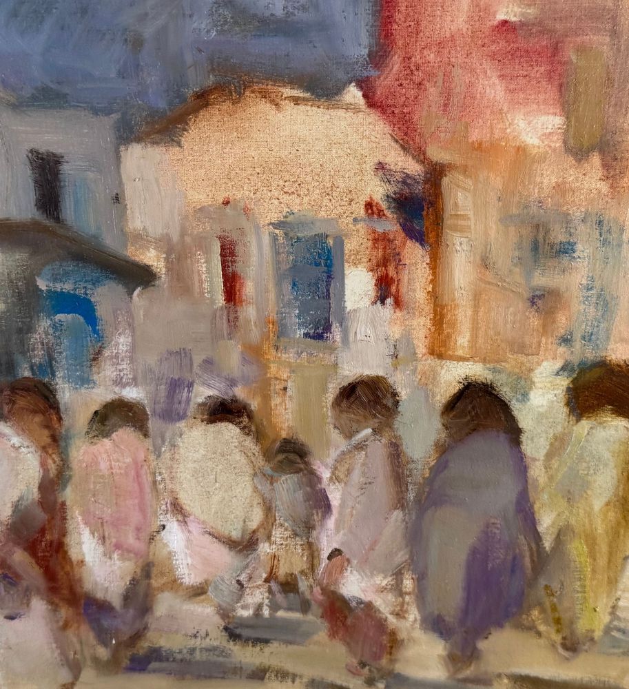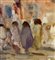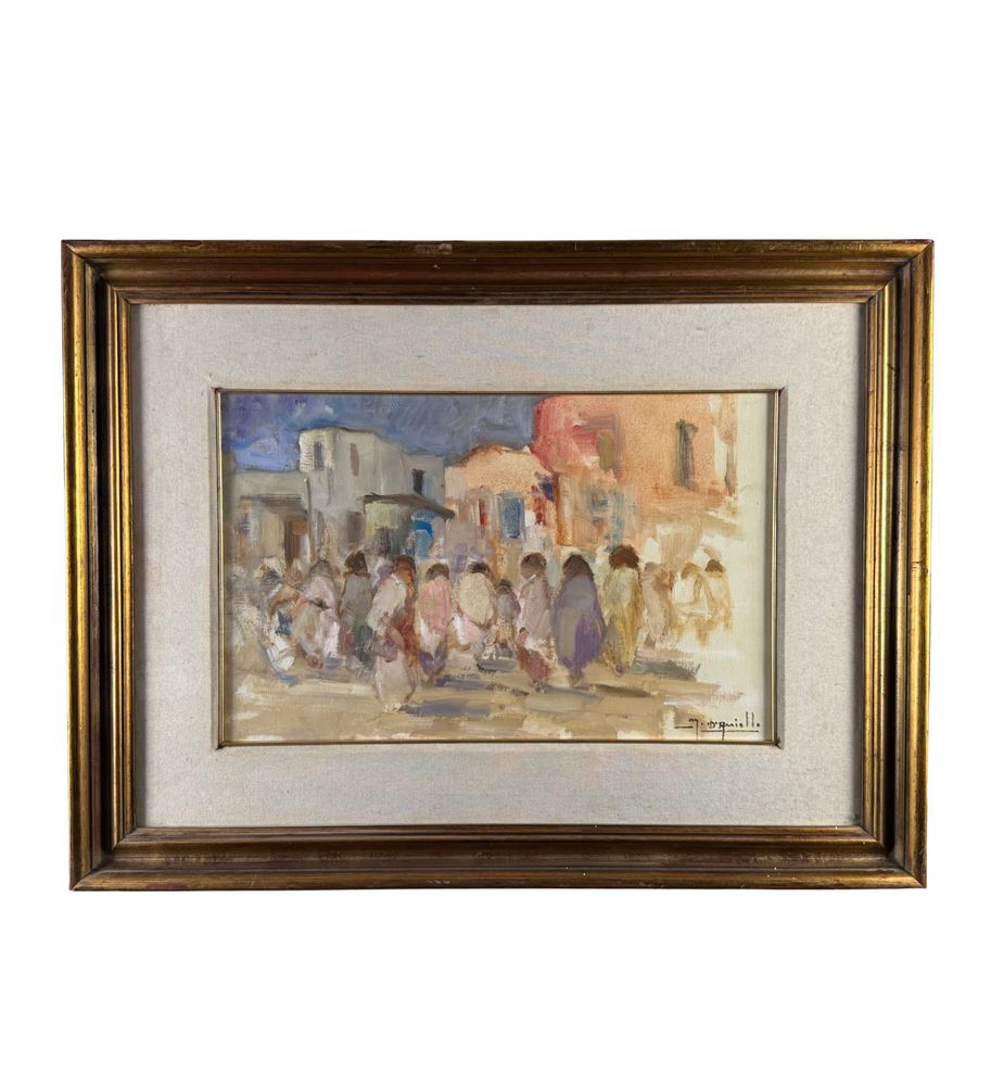 Dipinto olio su tavola, periodo XX secolo, scuola Italiana, raffigurante Personaggi. Dimensioni compreso cornice: 84x64 cm. Dimensioni interno cornice: 57x37 cm. Firmato in basso a destra Michele D'Aniello. Opera in buone condizioni.