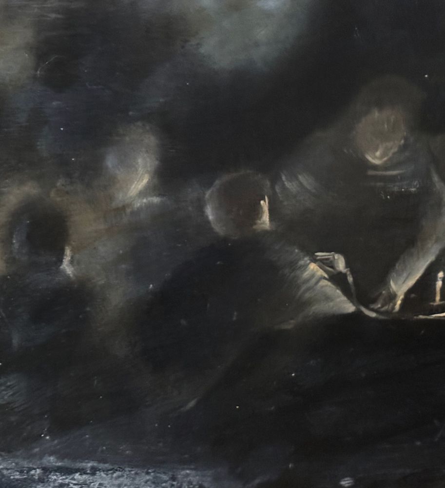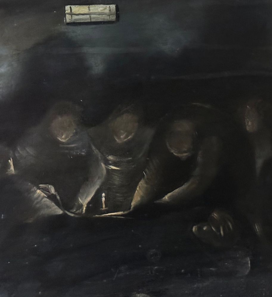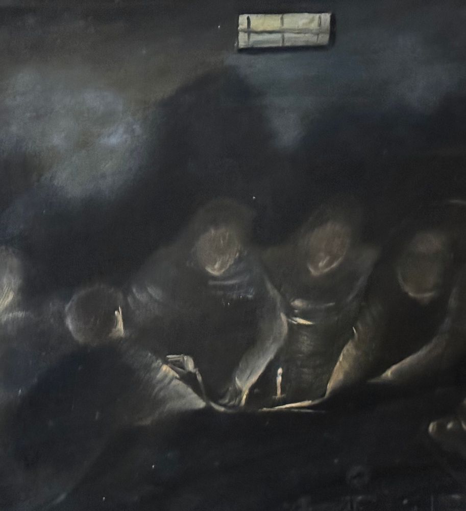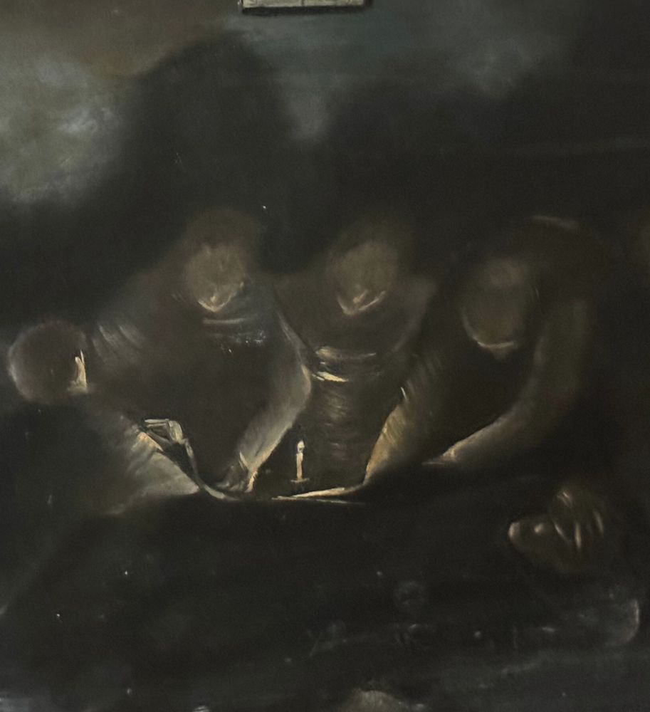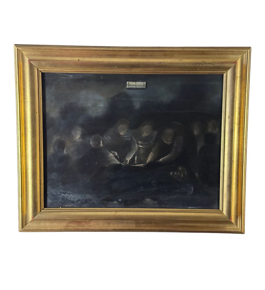 Dipinto olio su pannello, periodo XX secolo, raffigurante Personaggi al tavolo con candela. Dimensioni compreso cornice: 63x51 cm. Dimensioni interno cornice: 50x39 cm. Da artista anonimo. Opera in buone condizioni con lievi segni di vissuto come da foto allegate.