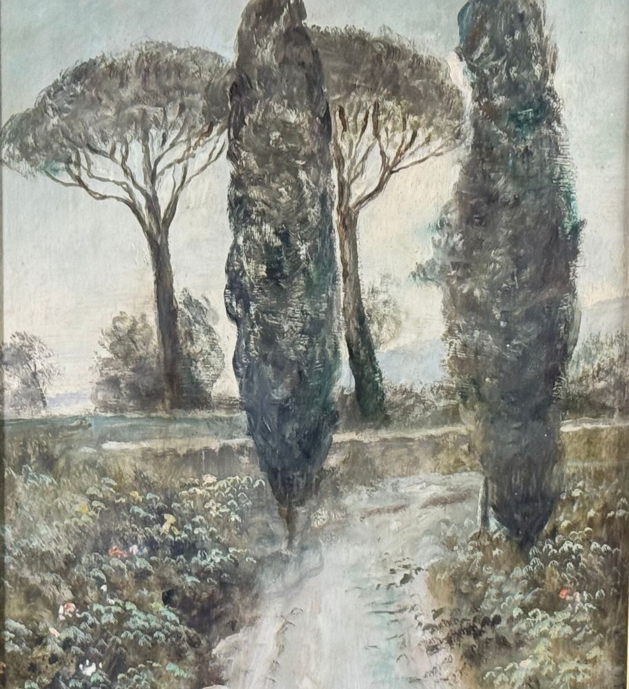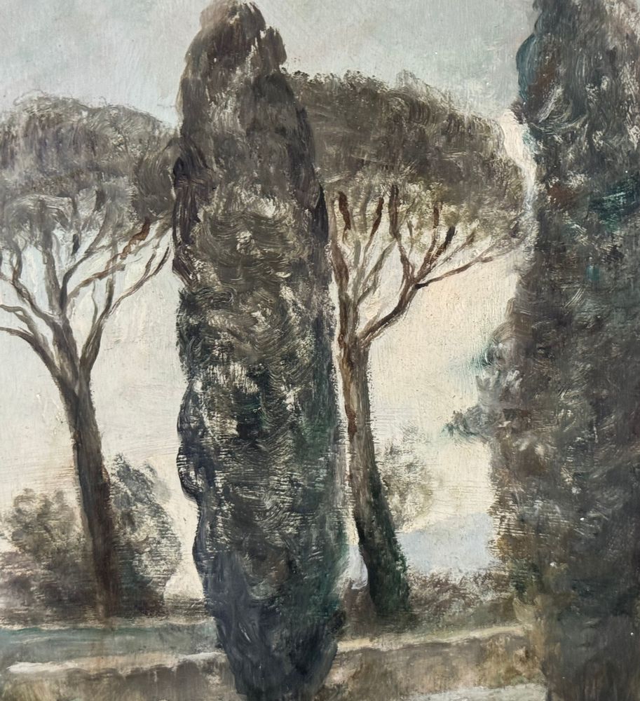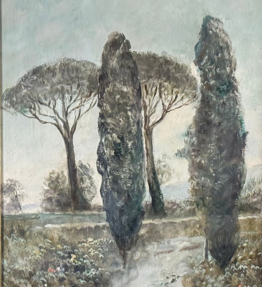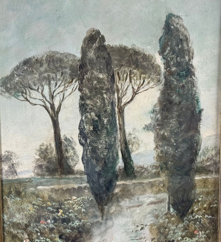 Dipinto olio su tavola, periodo XX secolo, scuola Italiana, raffigurante Paesaggio alberato. Dimensioni compreso cornice: 35x49 cm. Dimensioni interno cornice: 25x40 cm. Firmato in basso a destra di difficle lettura. Opera in buone condizioni.