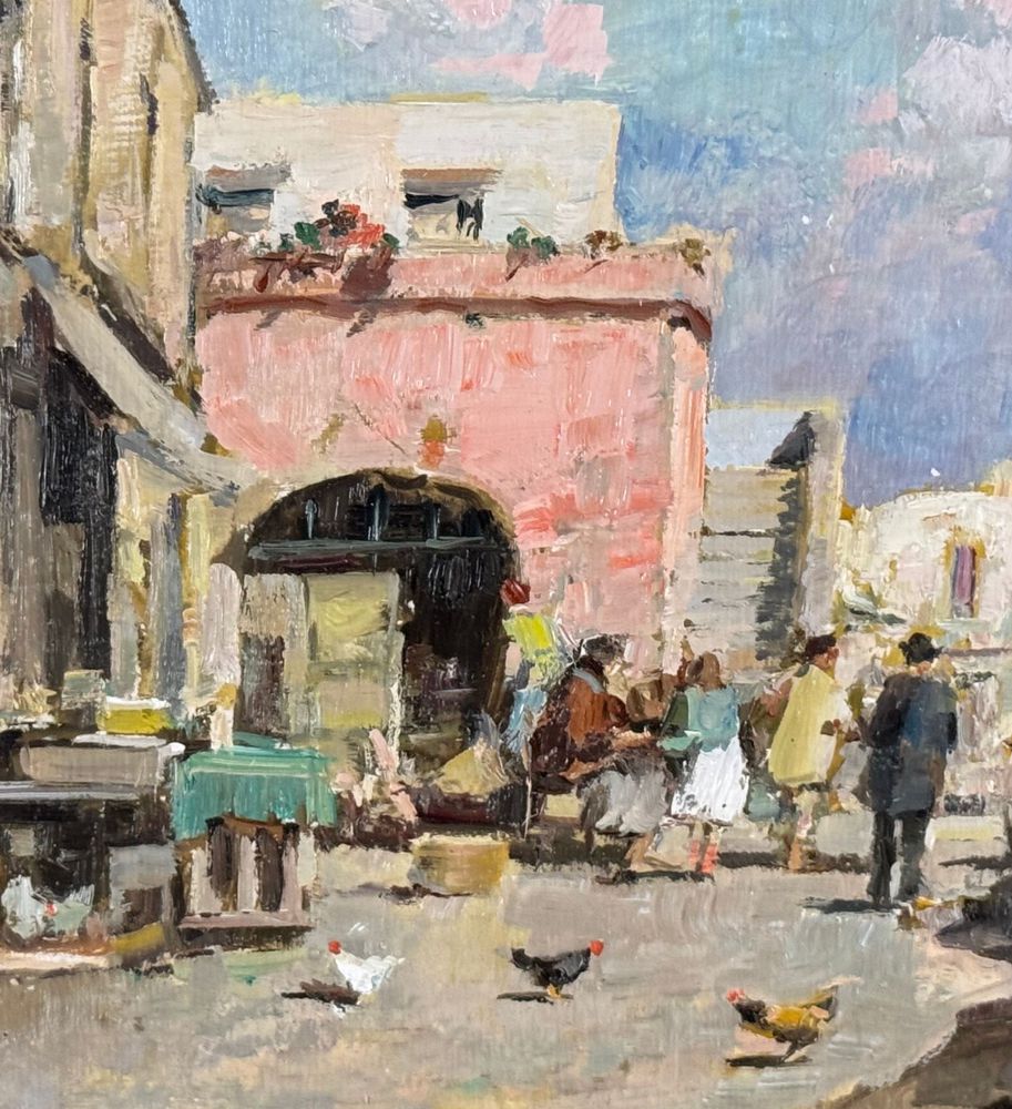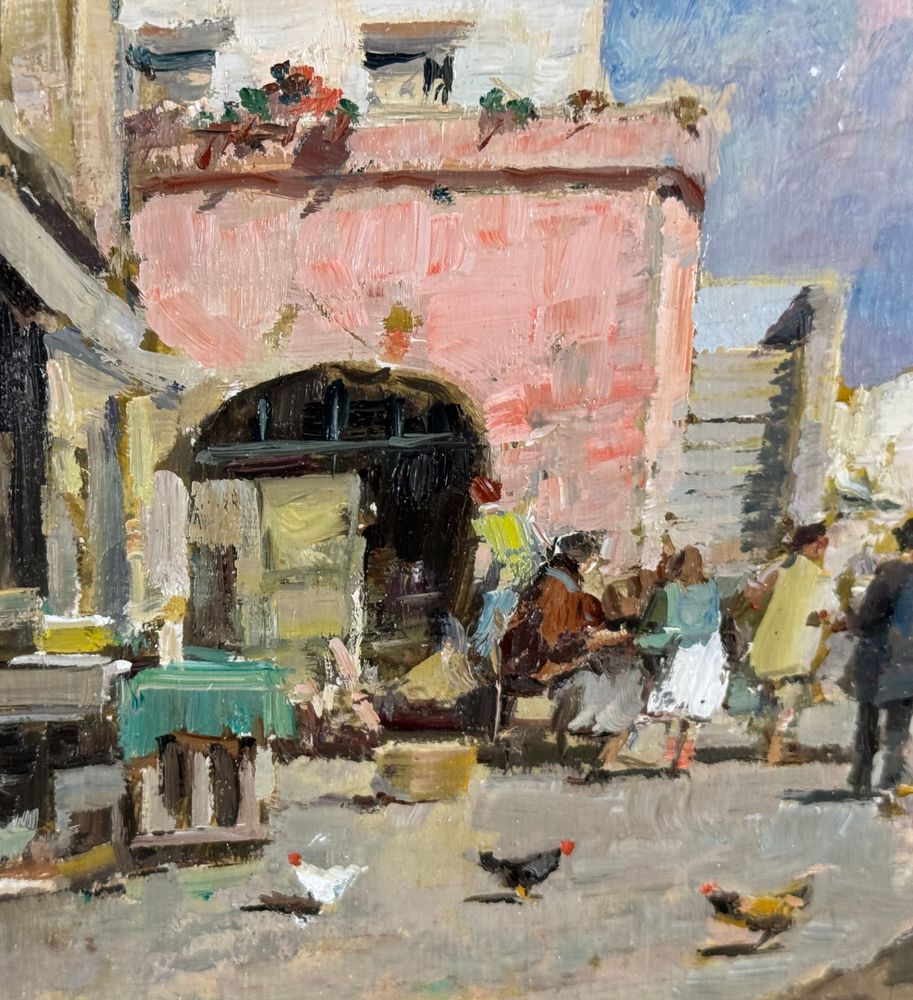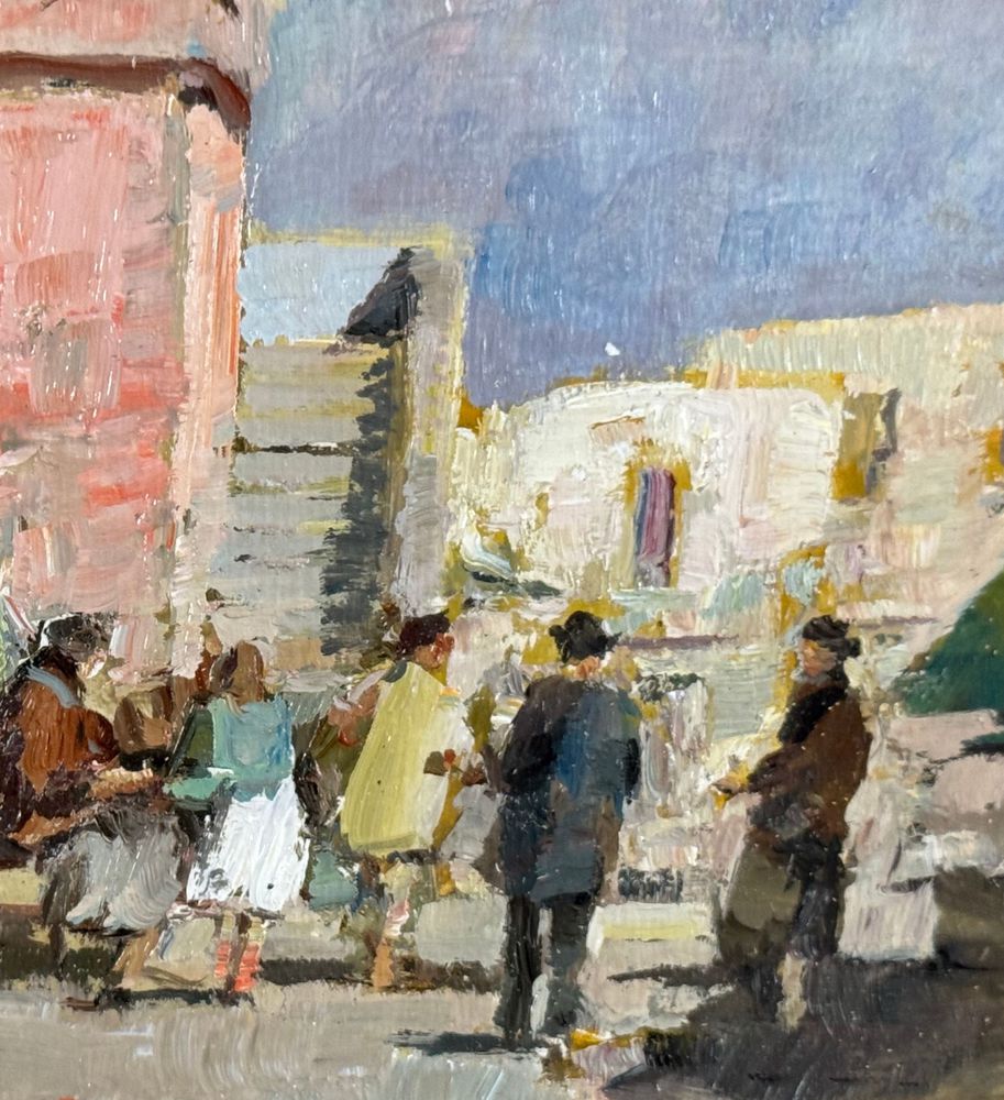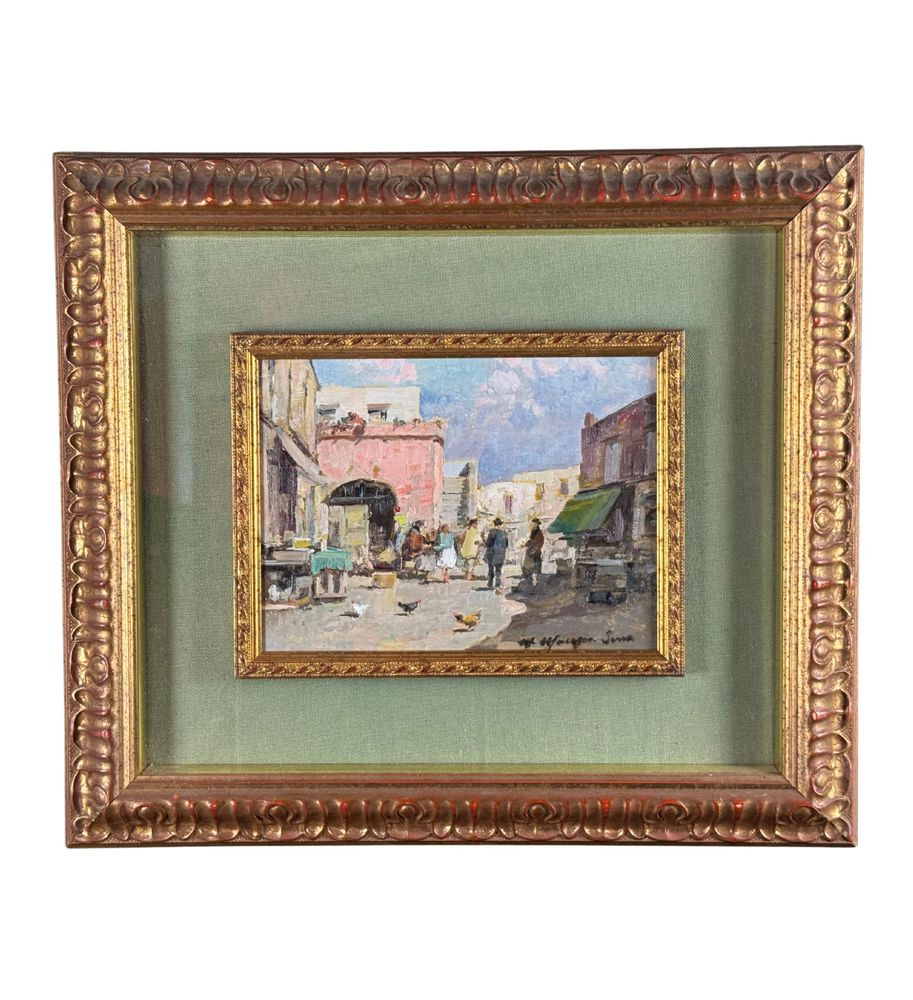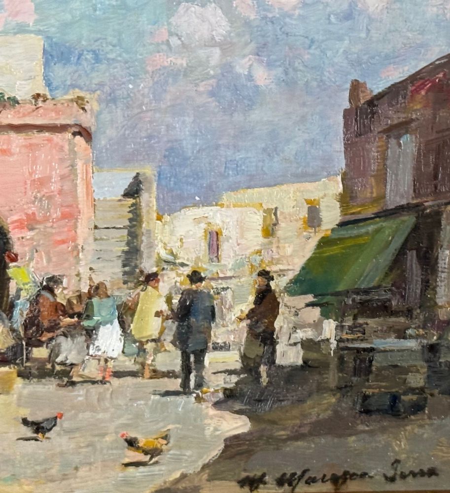 Dipinto olio su tavola, periodo XX secolo, scuola Italiana, raffigurante Mercatino con personaggi. Dimensioni compreso cornice: 46x40 cm. Dimensioni interno cornice: 18x24 cm. Firmato in basso a destra Mario Maresca Serra. Opera in buone condizioni.