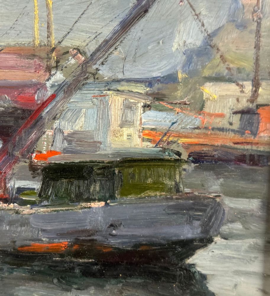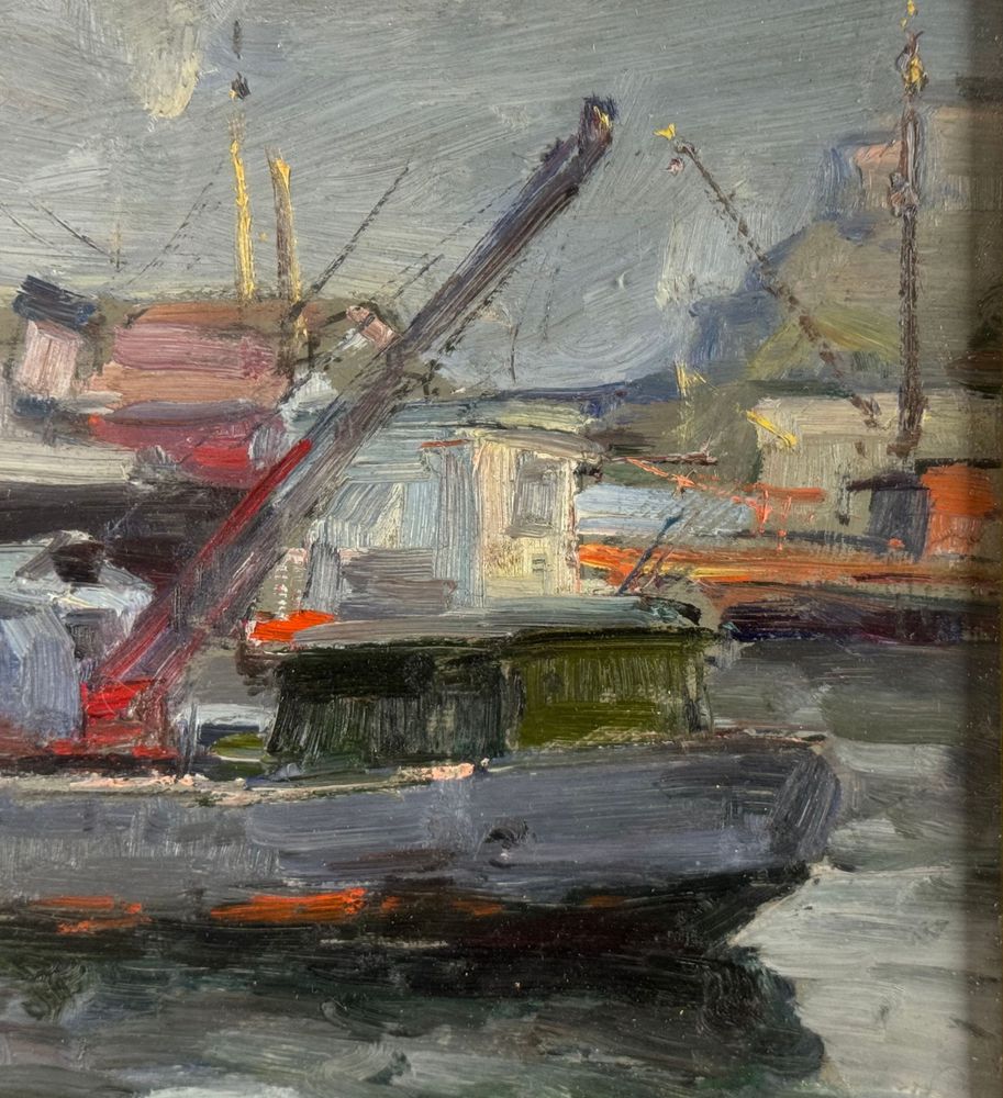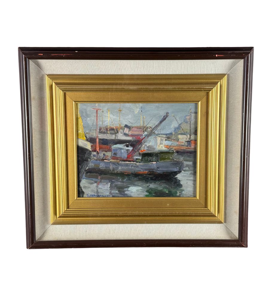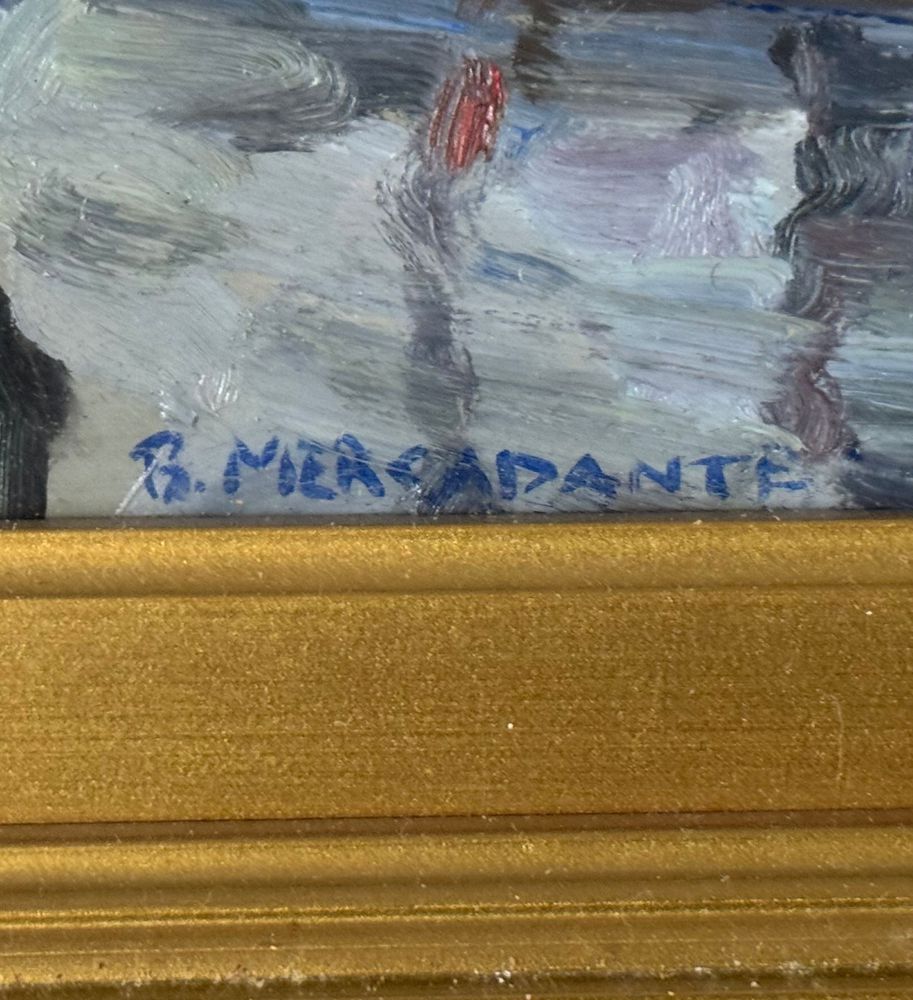 Dipinto olio su tavola, periodo XX secolo, scuola Italiana, raffigurante Porto con barche. Dimensioni compreso cornice: 55x49 cm. Dimensioni interno cornice: 24x30 cm. Firmato in basso a sinistra Biagio Mercadante (12 maggio 1892, Torraca