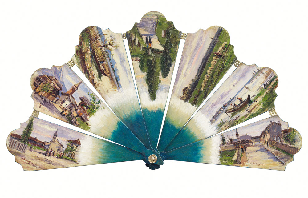 PITTORE DEL XX SECOLO Scene di paesaggiventaglio in legno con pittura ad olio...