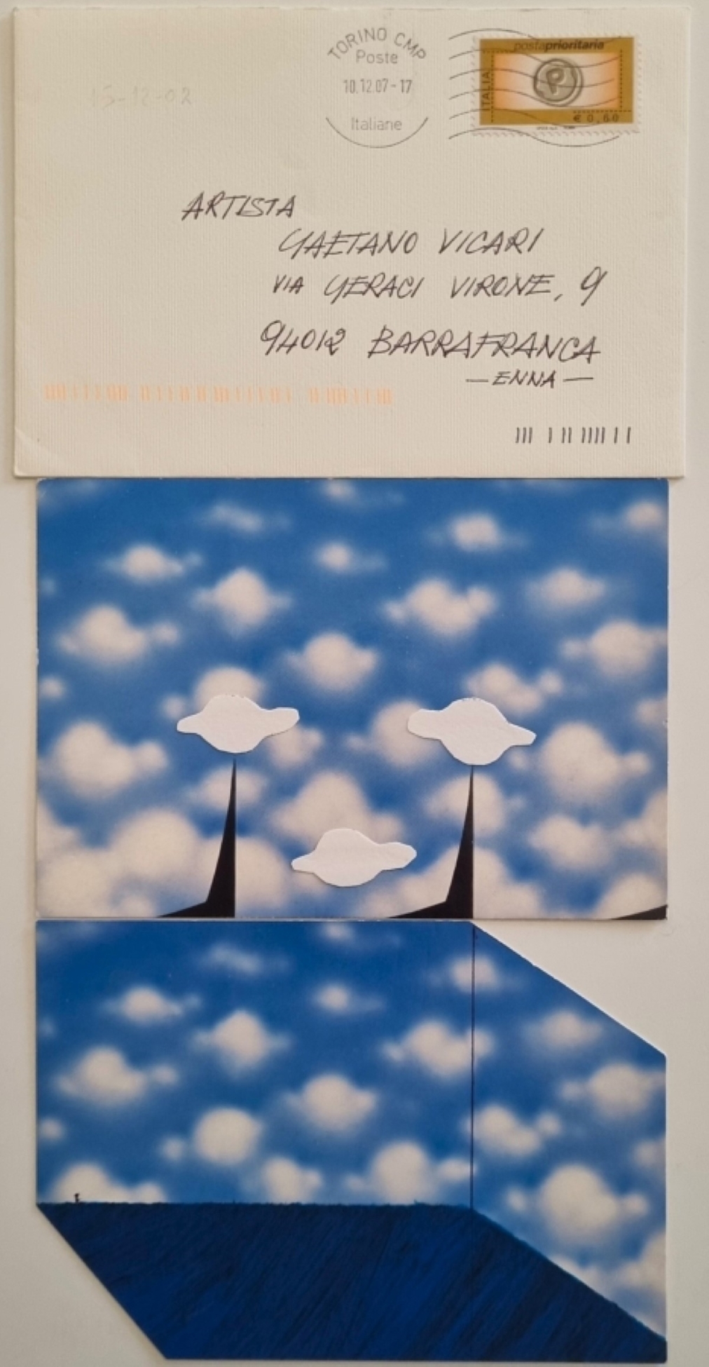 CARENA ANTONIO Rivoli 1925 - 2010 "Senza titolo" Collage su cartolina cm 14,5x15 del 2003. Firmata e datata al verso. Collage su cartolina cm 10,5x15 del 2008. Firmata e datata al verso. Corredate da busta per lettera originale.