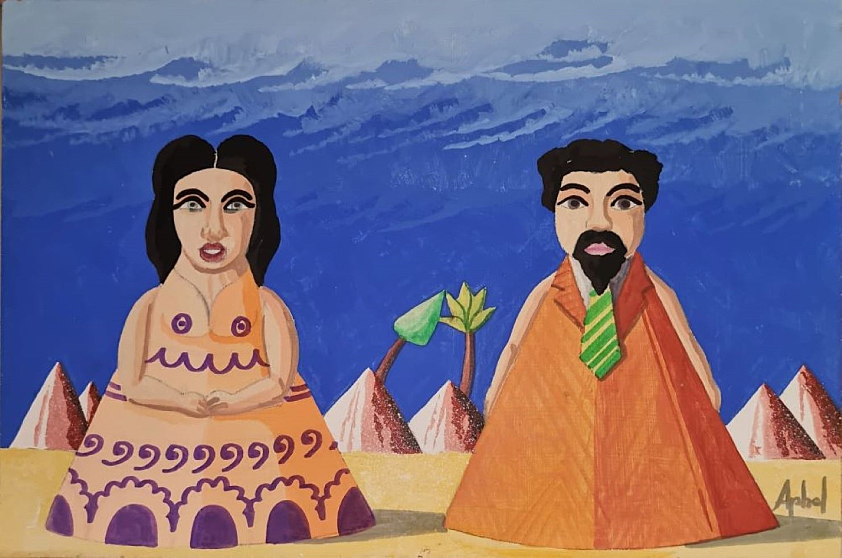APHEL FABIO Cavalese (TN) 1957 "La coppia conica" Olio su tavola cm 30x20. Firmato sul fronte in basso a destra. Al verso firma e titolo.