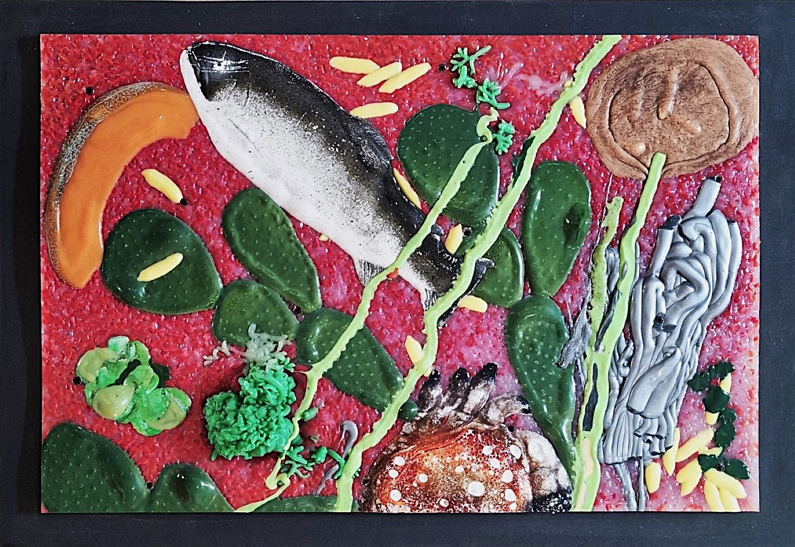RONDA OMAR Portula 1947 - Biella 2017 "Fusion Genetic" Plastiche fuse ed applicate su legno cm 63x44,5 del 1990. Al retro etichetta descrittiva con firma dell'Artista per autenticità, timbri e data.