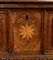 in legno di noce, con pannelli in radica di noce finemente lavorati con intarsio centrale a stella ad otto punte, elemento ricorrente nell'ebanisteria rinascimentale e barocca, spesso legato a simbologie religiose o cavalleresche. I montanti laterali sono ornati da figure femminili intagliate a tutto tondo. La struttura è arricchita da cornici modanate, base intagliata a baccellature e piedi sagomati.