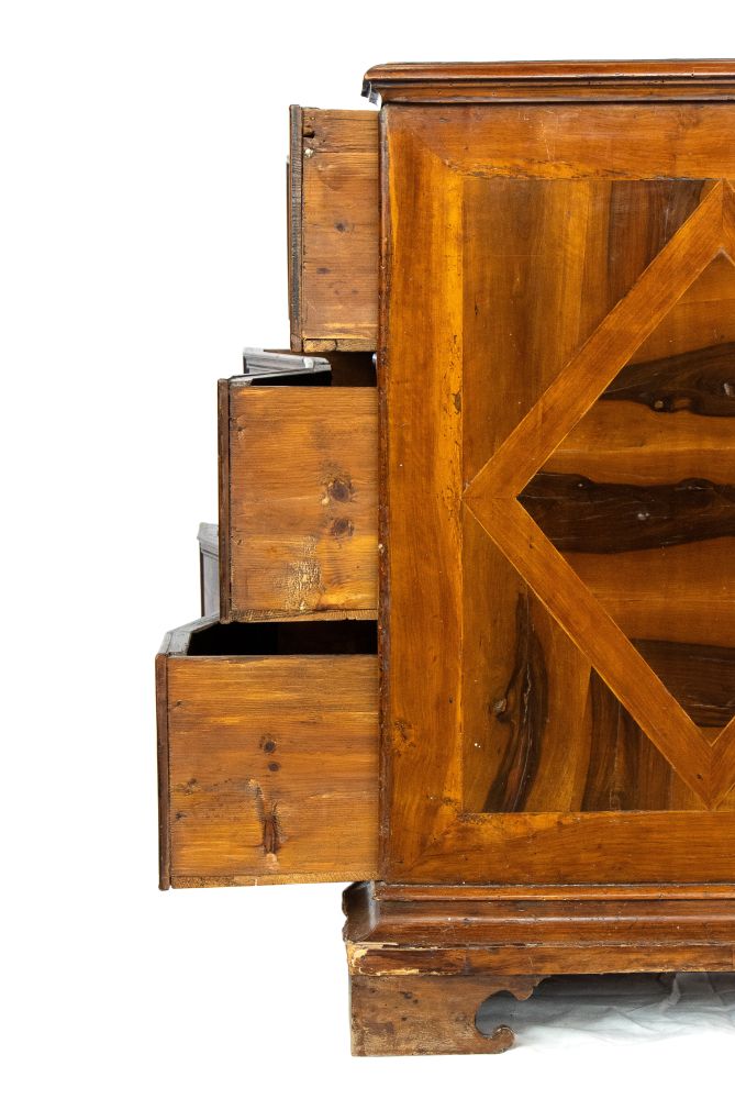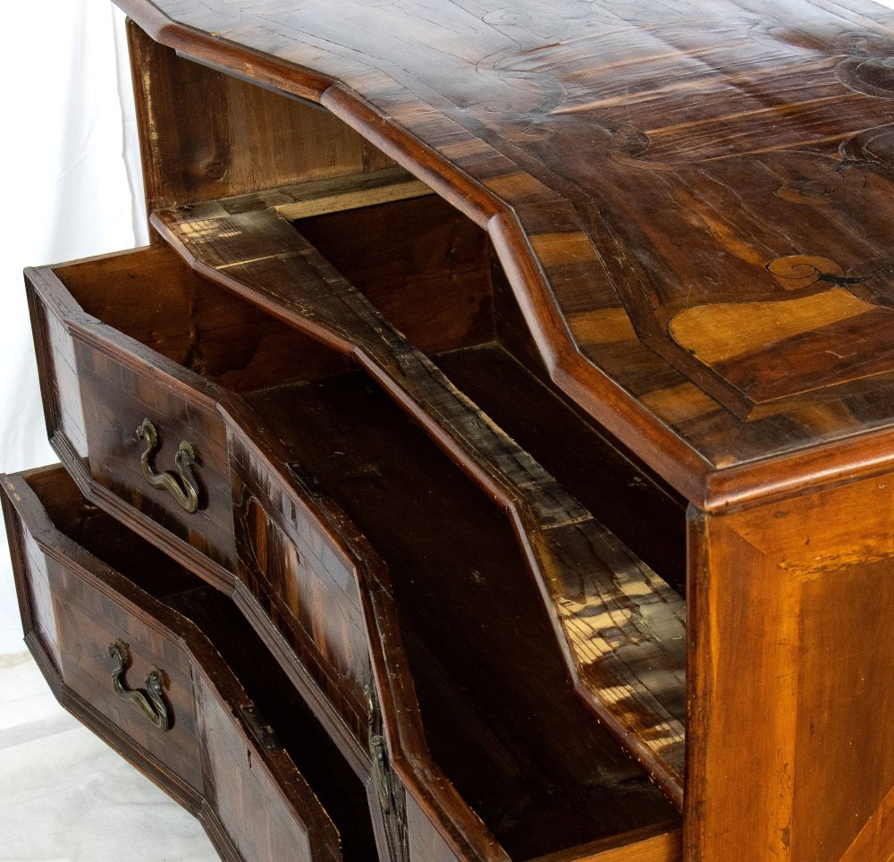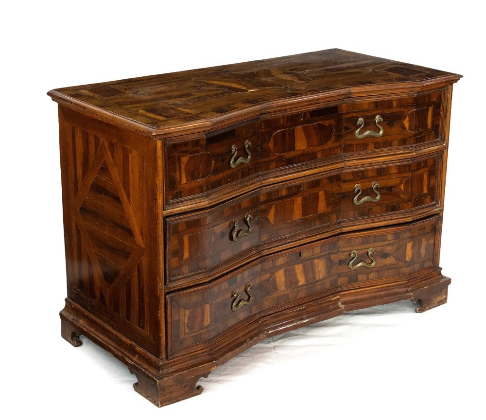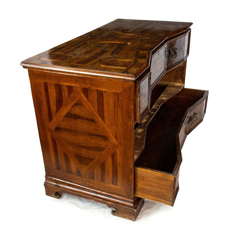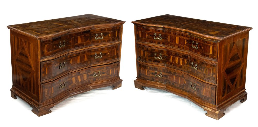 lastronati in noce e con intarsiato, il piano sagomato con angoli scantonati, fronte mosso a tre cassetti, basamento modanato. Le misure differiscono leggermente tra loro.