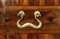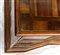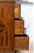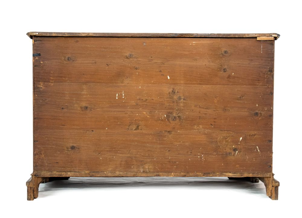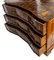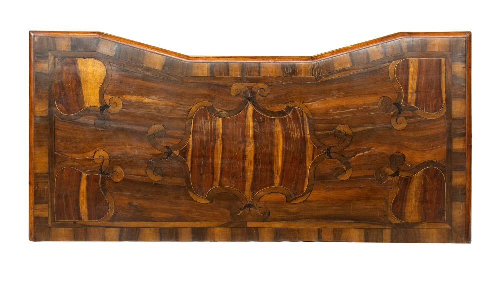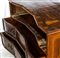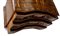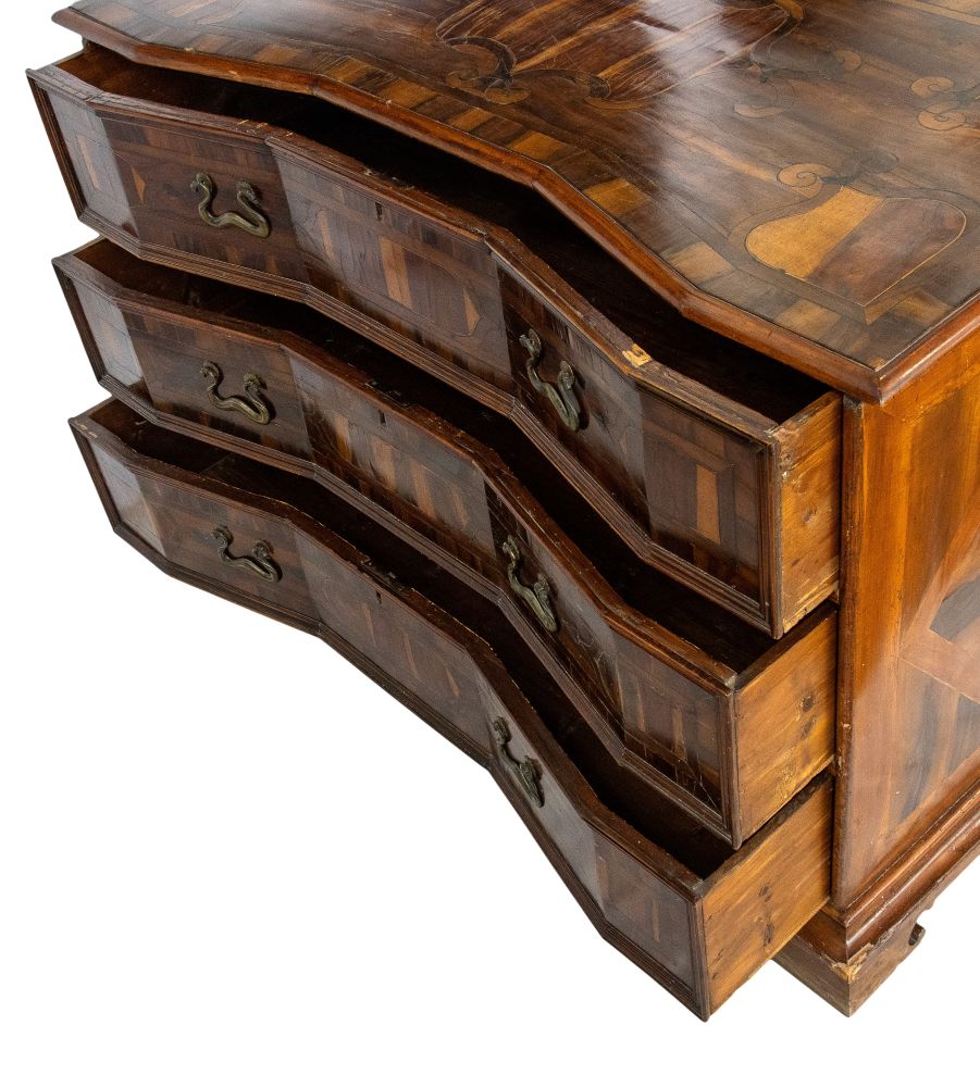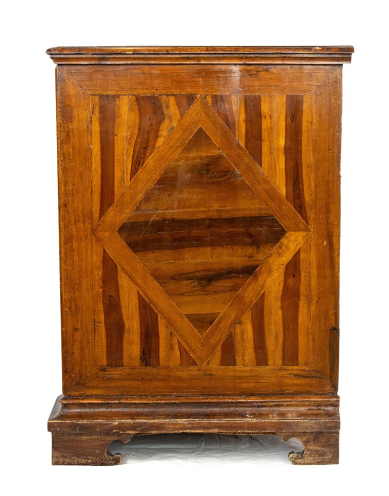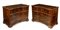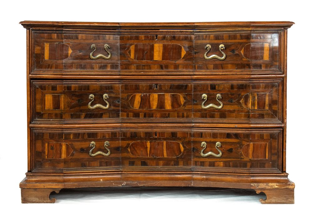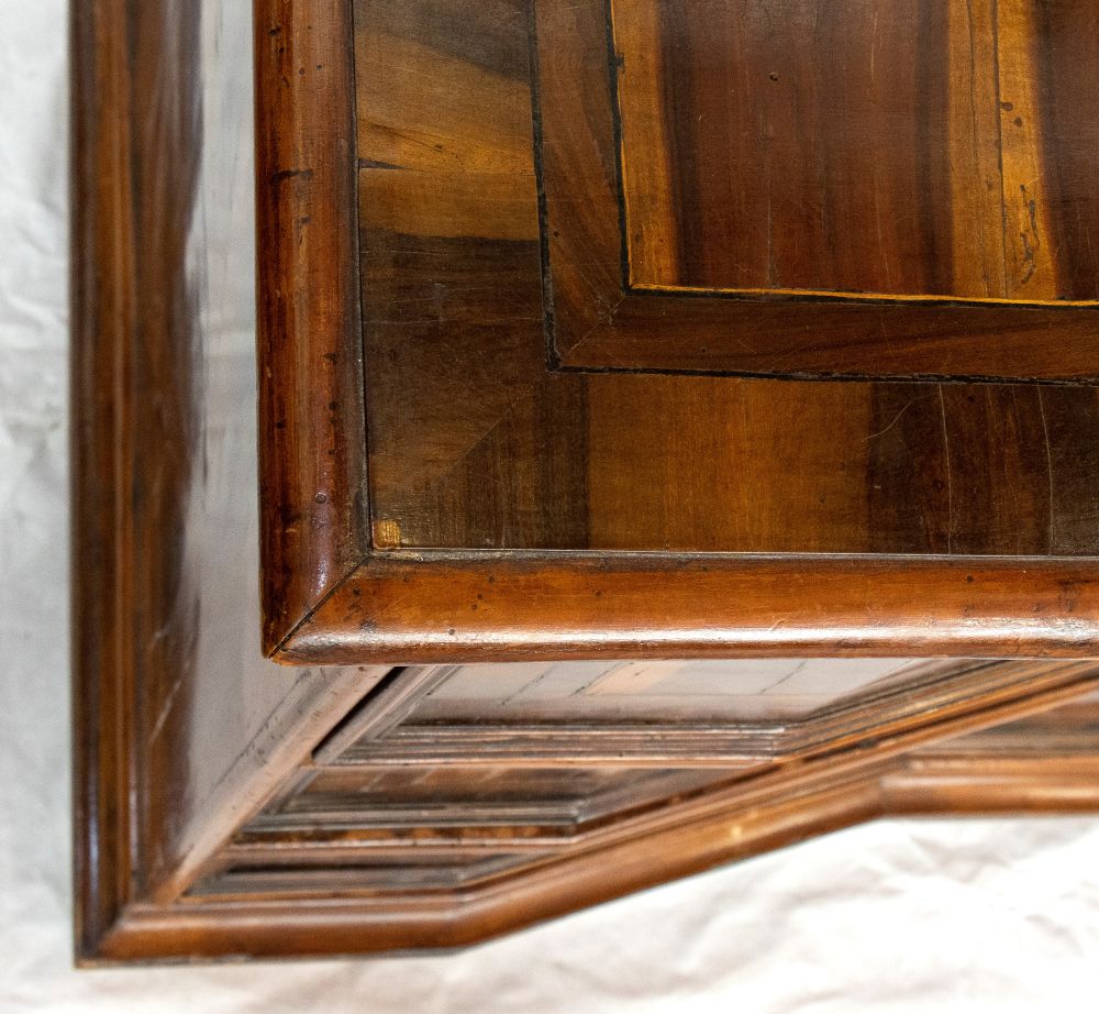 lastronati in noce e con intarsiato, il piano sagomato con angoli scantonati, fronte mosso a tre cassetti, basamento modanato. Le misure differiscono leggermente tra loro.
