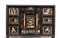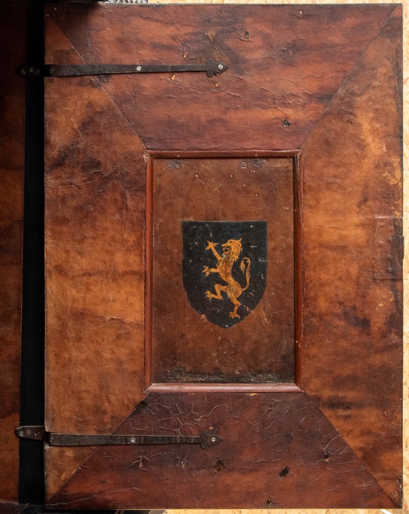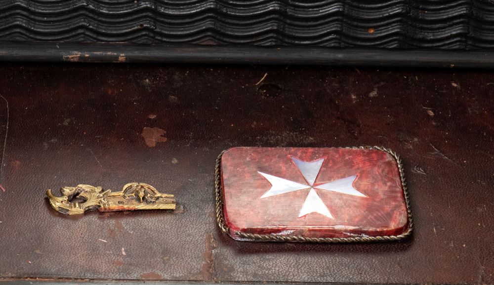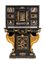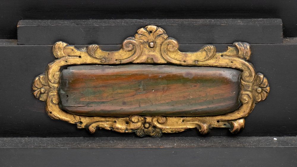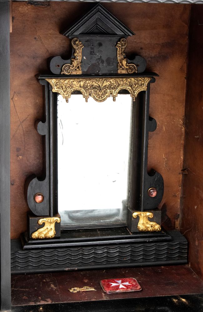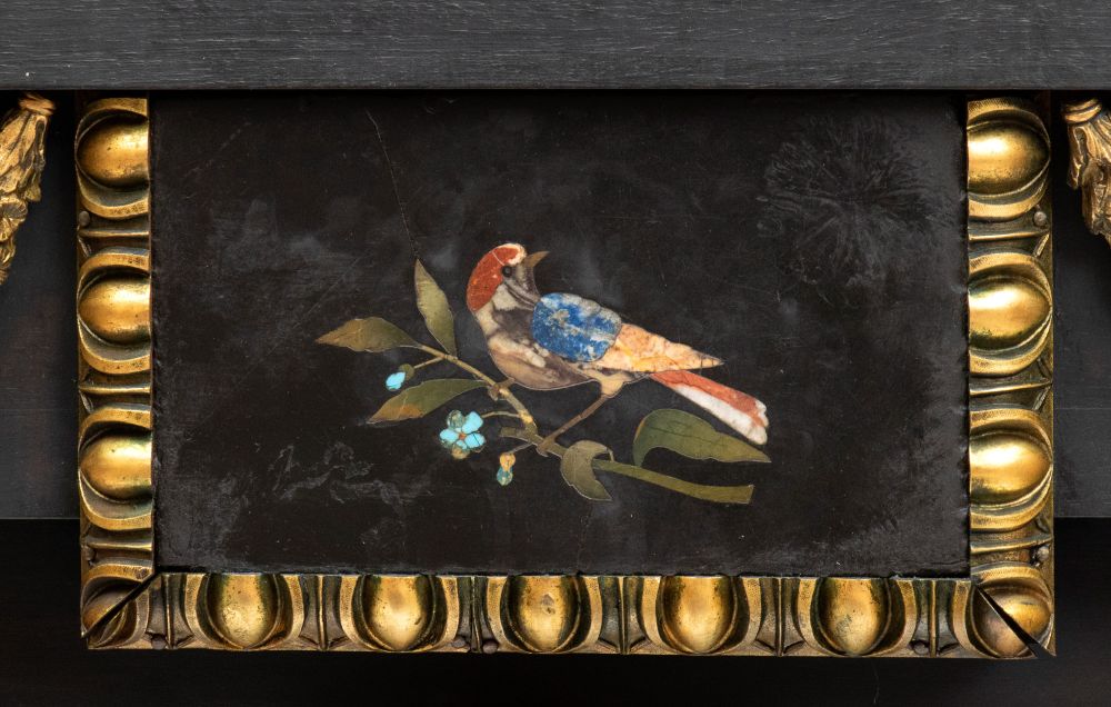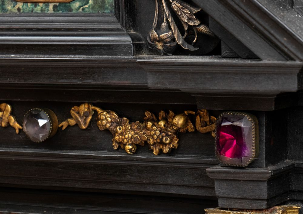 in ebano (Diospyros spp.), pietre dure, pannelli in commesso di pietre dure, e bronzi dorati. La parte superiore è composta da sei cassetti col davanti di una placca di pietre dure con fiori ed uccelli, al centro grande sportello a forma di portale con due colonne in pietra ed in mezzo un albero con frutta e foglie su cui spicca un pappagallo variopinto, il tutto in pietre dure, sotto al portale una striscia di pietre dure di diversi tipi e forme. L'interno del vano del tempio è foderato di cuoio e ornato da uno specchio con colonne ed una trabeazione di bronzo dorato. La parte inferiore, non coeva al sopra (XX secolo) è composta da un mobile la cui parte superiore a mo' di tamburo di tavolo è ornata da una placca in pietre dure con uccello su di un ramo, ghirlande ,di putto in bronzo dorato. Ai lati due grandi volute in legno dorato di bellissimo disegno. Al centro del mobile un grande quadro in commesso di pietre dure, incorniciato di bronzo dorato e testa di puto, rappresenta un albero ricco di frutta e foglie su cui poggia un pappagallo a ricco piumaggio colorato, agli angoli quattro fiori bianchi. La base del mobile è ornata da pietre dure contornate da decori in bronzo dorato. Piedi a toupie schiacciata in legno dorato. Il mobile è arricchito da un cofano in ebano, decorato da placche in commesso di pietre dure, rappresentanti uccelli su rami fioriti. Il mobile è stato eseguito dal'Opificio Granducale del pietre dure per i Brancaleoni della Rocca Leonella li cui stemma è impresso e dipinto sul retro dello sportello della parte superiore.