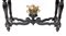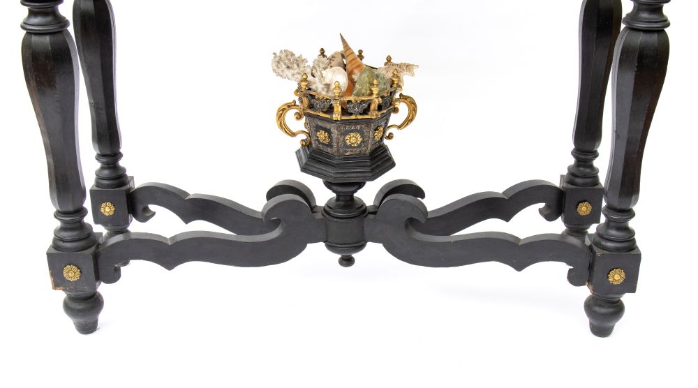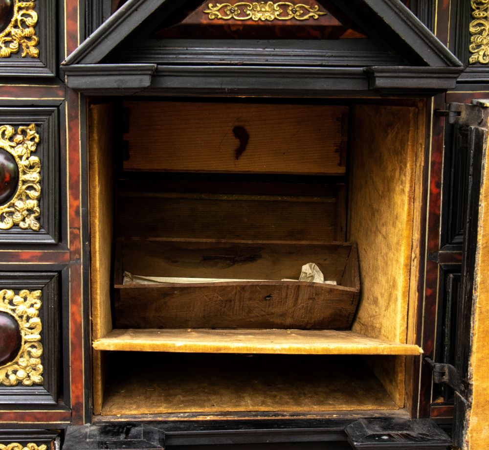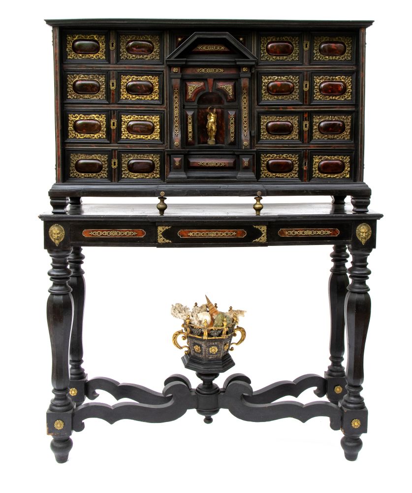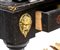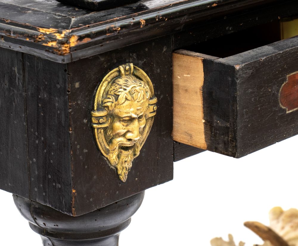 L’insieme decorativo gioca sul contrasto cromatico fra la profondità scura dell’ebano e la luminosità della tartaruga, con tocchi metallici che ne sottolineano i punti focali.