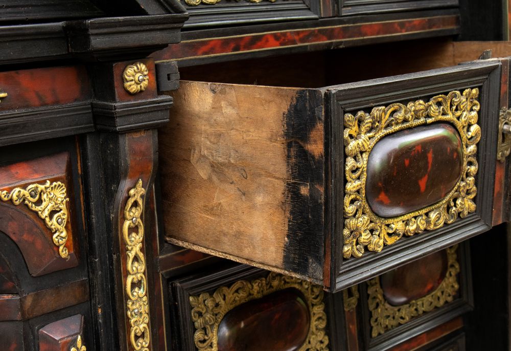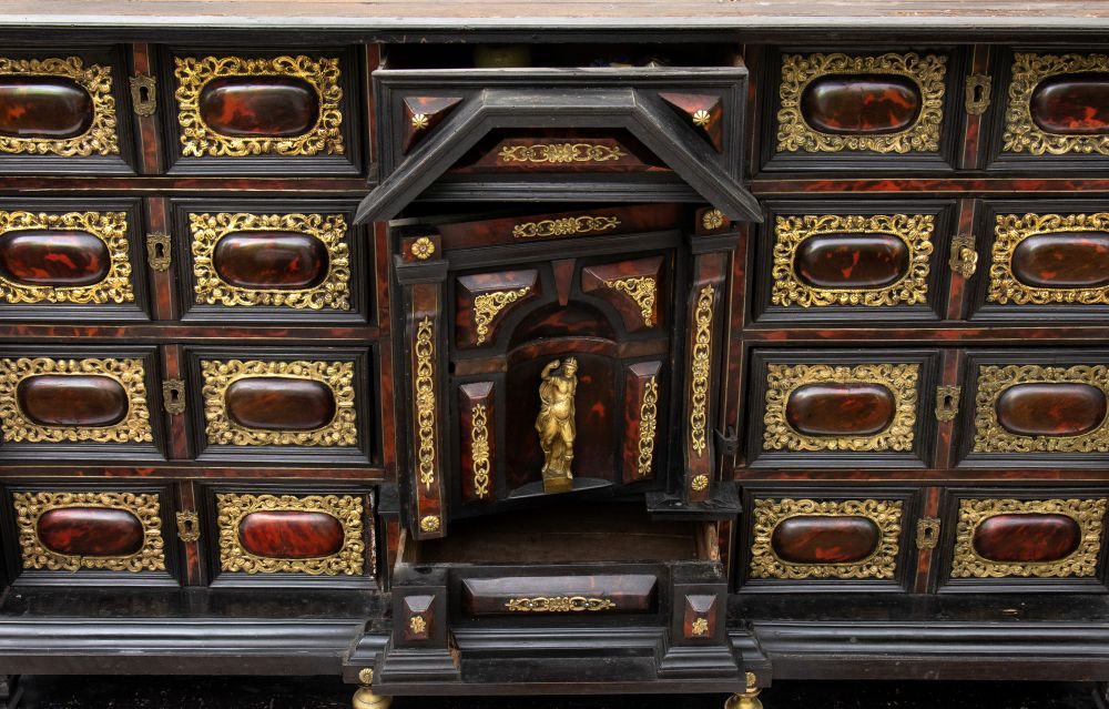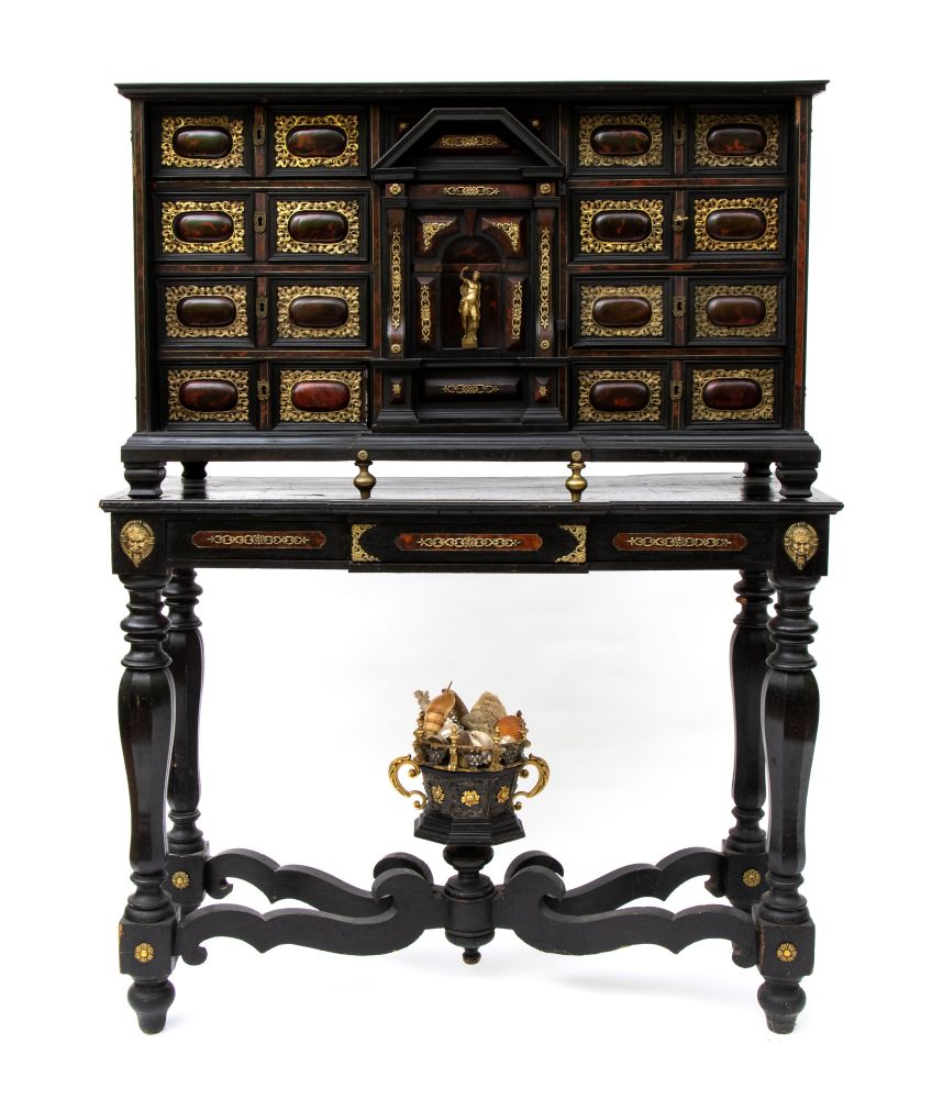 con struttura in pioppo, legno ebanizzato, tartaruga (hawksbill sea turtle, Eretmochelys imbricata, Cheloniidae) e inserti in bronzo, poggianti su basi finemente intagliate.