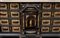 La coppia di monetieri presenta un impianto architettonico di grande raffinatezza: il fronte articolato in quattro file verticali di cassetti disposti simmetricamente, ciascuno ornato al centro da elemento in tartaruga di forma ovale, circondato da applicazioni in bronzo dorato a volute. Al centro cassetto sormontato da sportello architettonico a timpano, il cui interno cela segreto con tre piccoli cassetti. Lo sportello arricchito al centro da una figura di un guerriero romano per ogni monetiere, inserita entro impianto a edicola che conferisce solennità scenografica alla facciata.