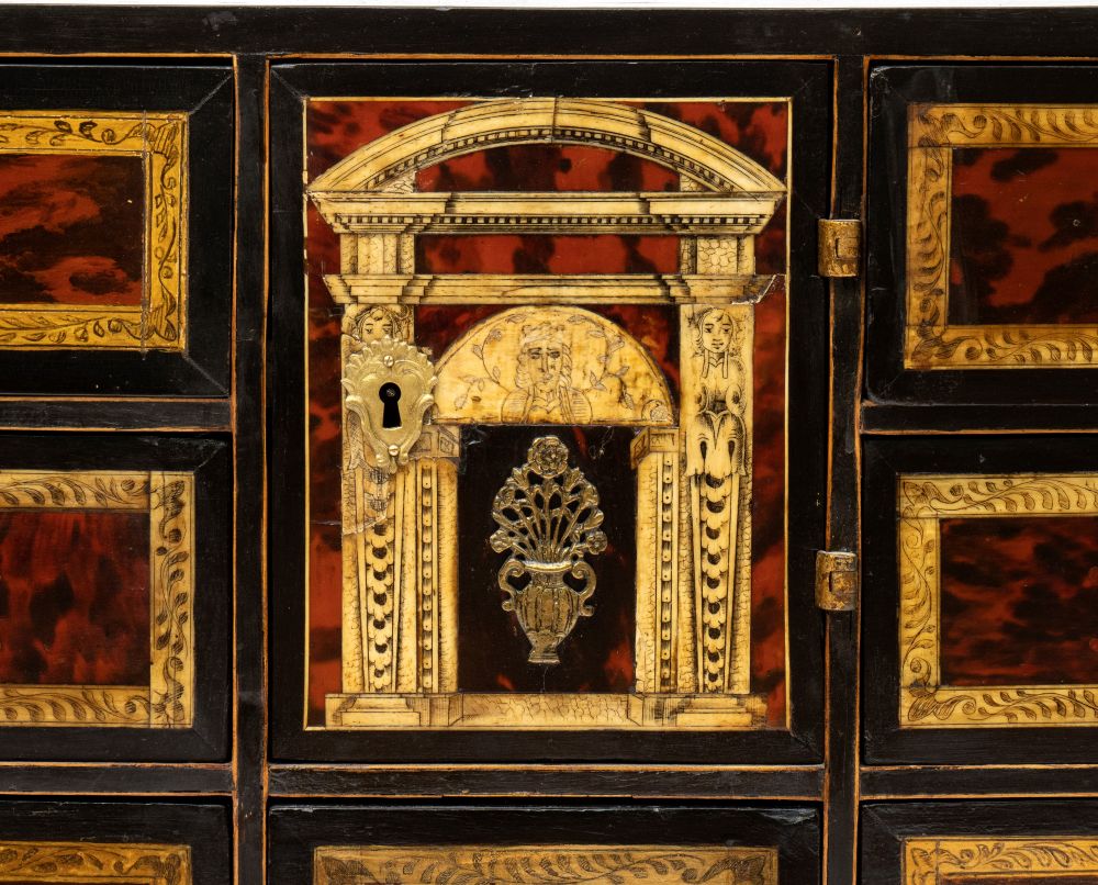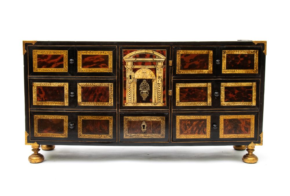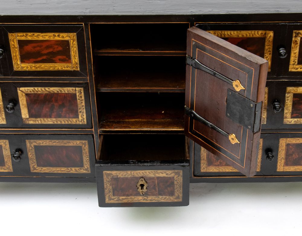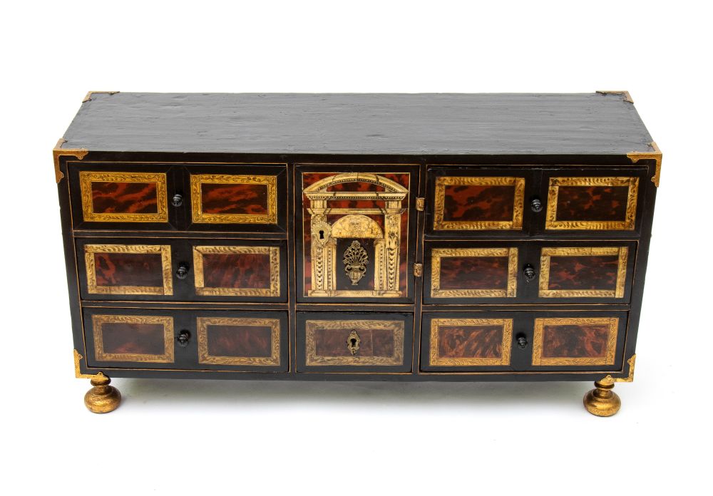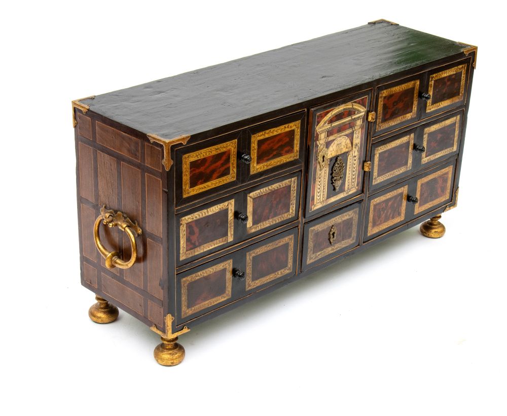 Lotto 22 | Monetiere lastronato in tartaruga Luigi XVI Italia settentrionale, XVIII secolo Altezza x larghezza x profondità: 48 x 93 x 28,5 cm.