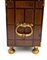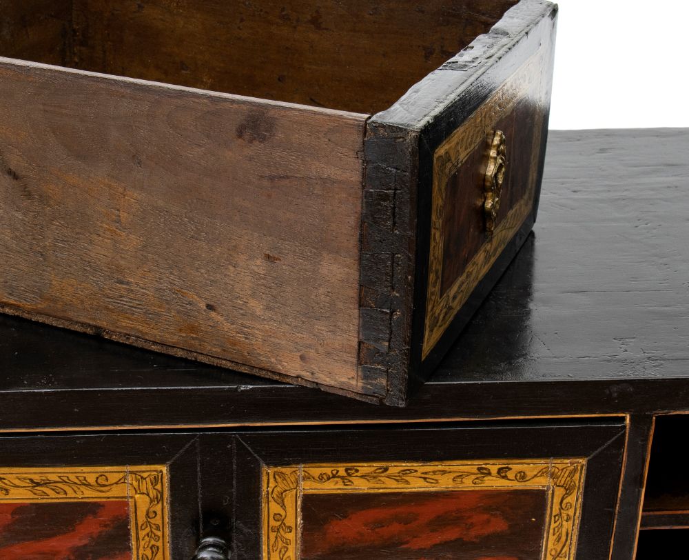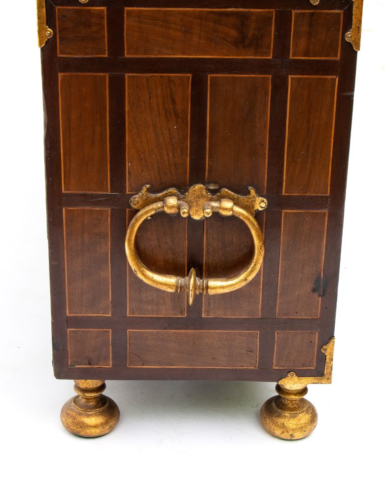 in abete, rivestita in legno ebanizzato con applicazioni in tartaruga (hawksbill sea turtle, Eretmochelys imbricata, Cheloniidae) e osso inciso. I fianchi sono decorati con un raffinato motivo geometrico ottenuto tramite lastronatura in noce e palissandro, mentre sui lati sporgono due maniglie in bronzo, funzionali al trasporto. Il mobile poggia su due piedini torniti sferici dorati, che alleggeriscono la massa e ne elevano l’eleganza.