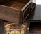 Il prospetto frontale è organizzato secondo uno schema regolare: sei piccoli cassetti laterali, disposti simmetricamente e privi di serratura, incorniciati da filetti in osso e pannelli in tartaruga, che conferiscono ritmo e vivacità cromatica all’insieme. Al centro spicca uno sportello architettonico intarsiato, ornato da motivi classici con colonne e timpano, che cela al suo interno vani e cassettini nascosti. Sotto di esso si trova un ulteriore cassetto, dotato di serratura, destinato a custodire gli oggetti di maggior valore.