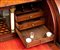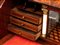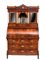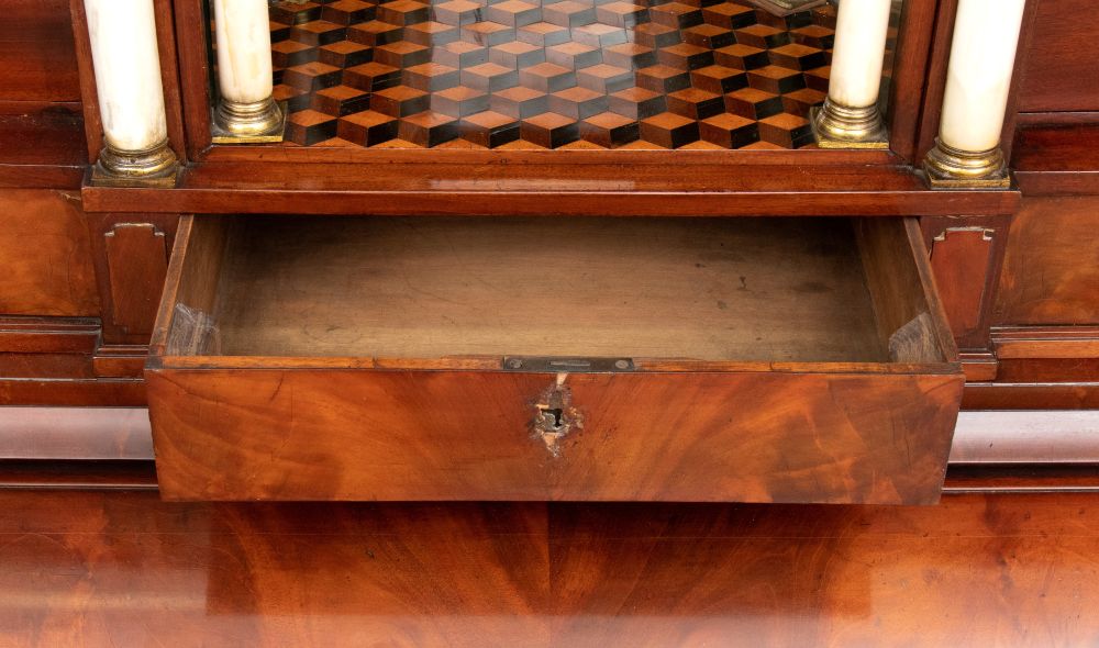 realizzato tra la fine del periodo Luigi XVI e il primo Biedermeier, in piuma di mogano e mogano, applicazioni in bronzo dorato. Parte superiore architettonica a tempietto con frontone triangolare, colonne in alabastro e specchi laterali. Ribalta centinata con interno a cassetti e vani; parte inferiore che cela nel primo cassetto un forte piano, con intarsiato produttore e anno di produzione (1798), seguono due cassetti. Bocchette e maniglie in bronzo dorato.