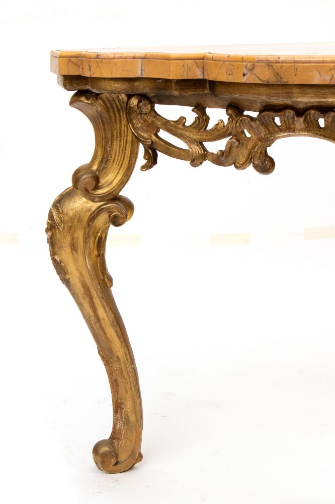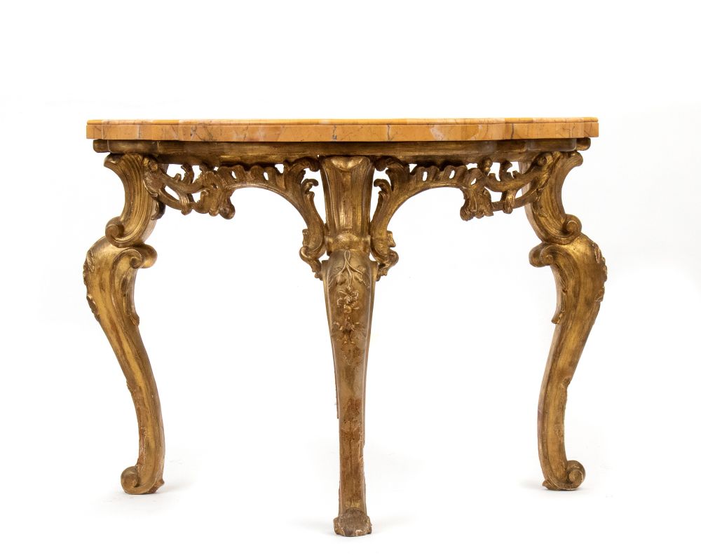 in legno dorato, finemente intagliata a motivi floreali e vegetali, la struttura è sorretta da tre gambe cabriolet. Piano in marmo giallo Siena.