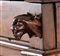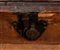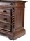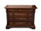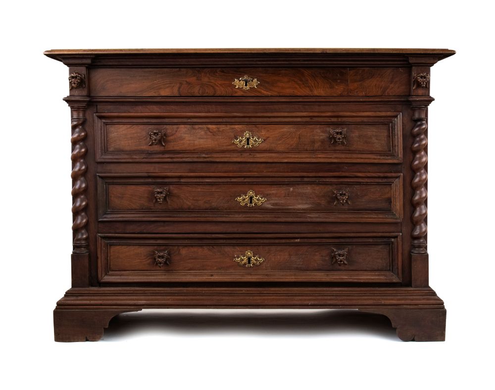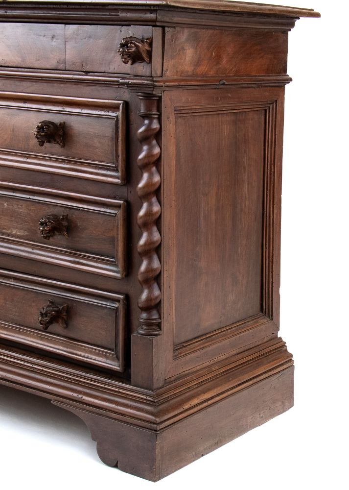 in legno di noce e radica di noce con lesene scolpite a torciglione, quattro cassetti, di cui tre con pomoli intagliati a forma di testa di animale. Serrature a forma di cuore originali.