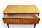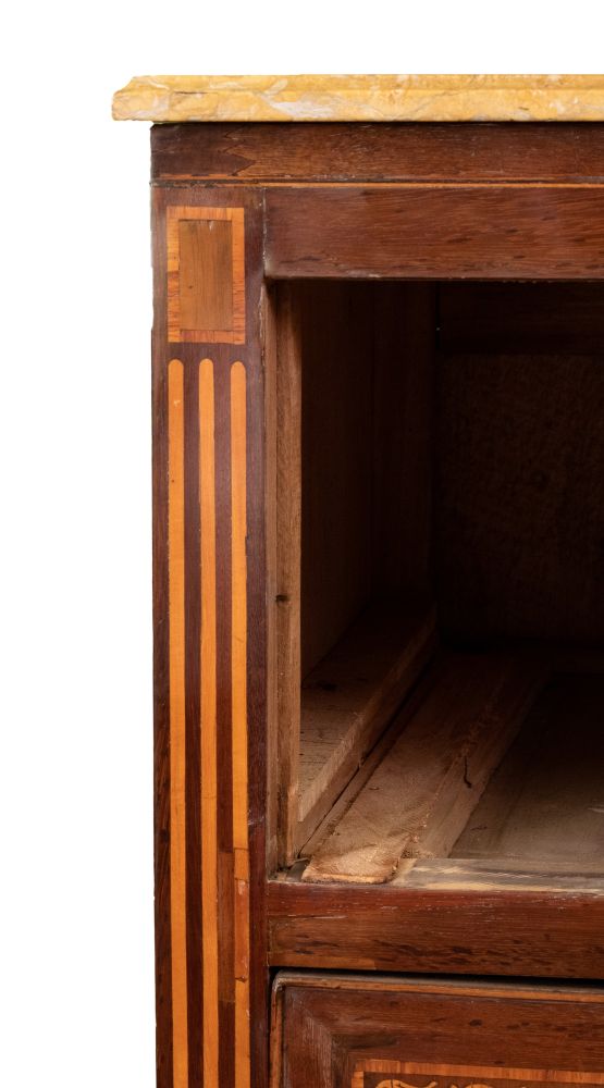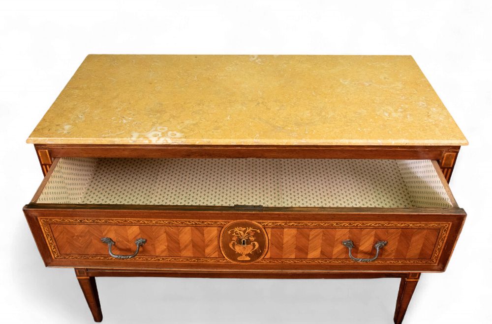 a due cassetti in noce e bois de rose (Dalbergia spp.) intarsiato in legni di frutto. Decorato sul fronte con motivi a spina di pesce e ovali con vasi floreali. Gambe a sezione tronco piramidale. Piano in marmo non coevo e maniglie aggiunte nel primi del Novecento.